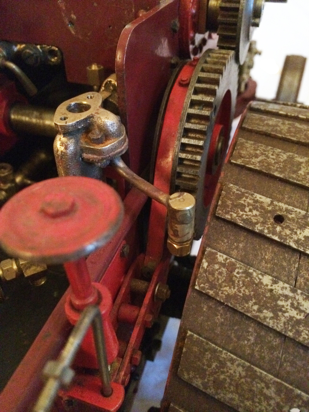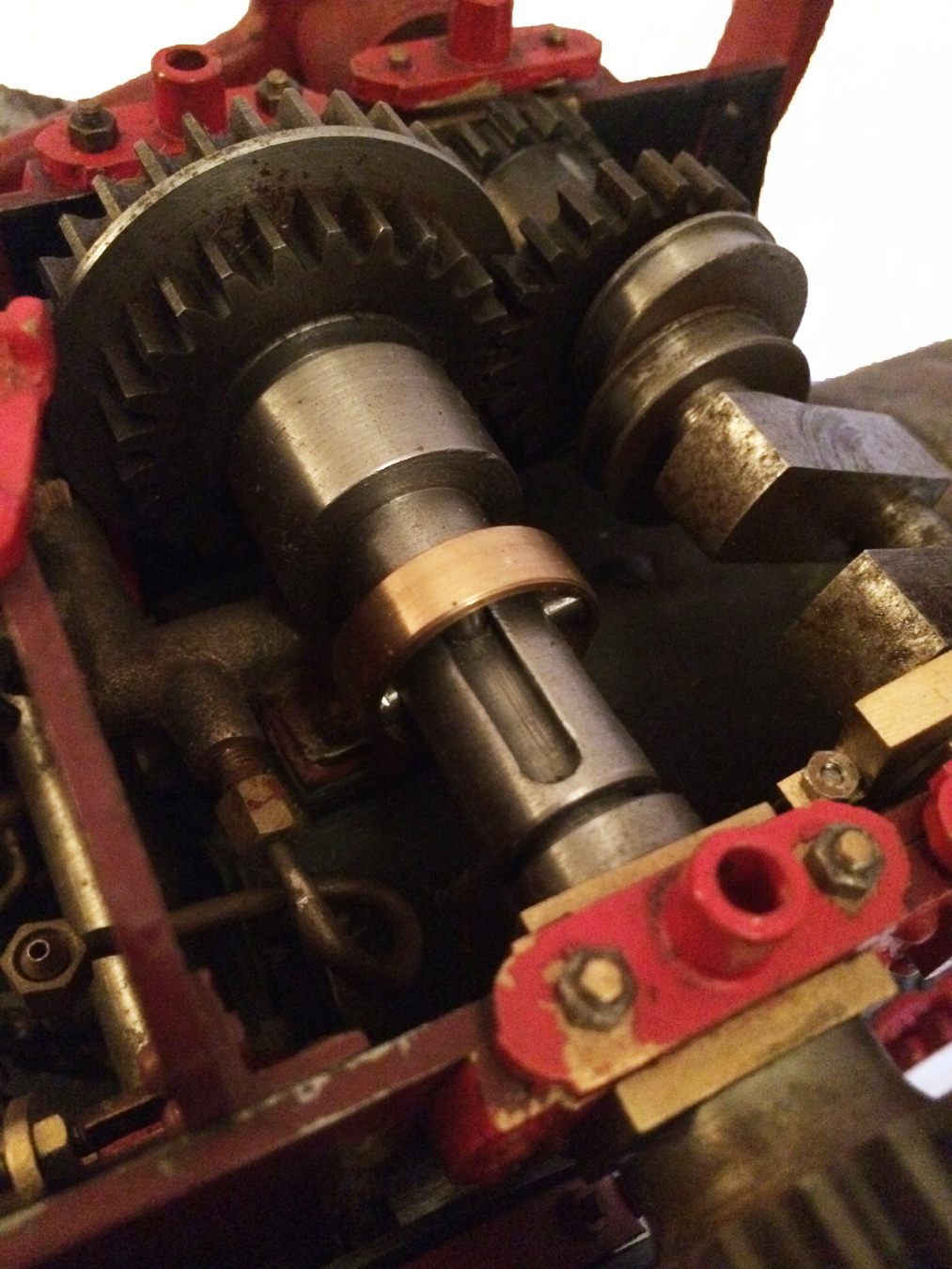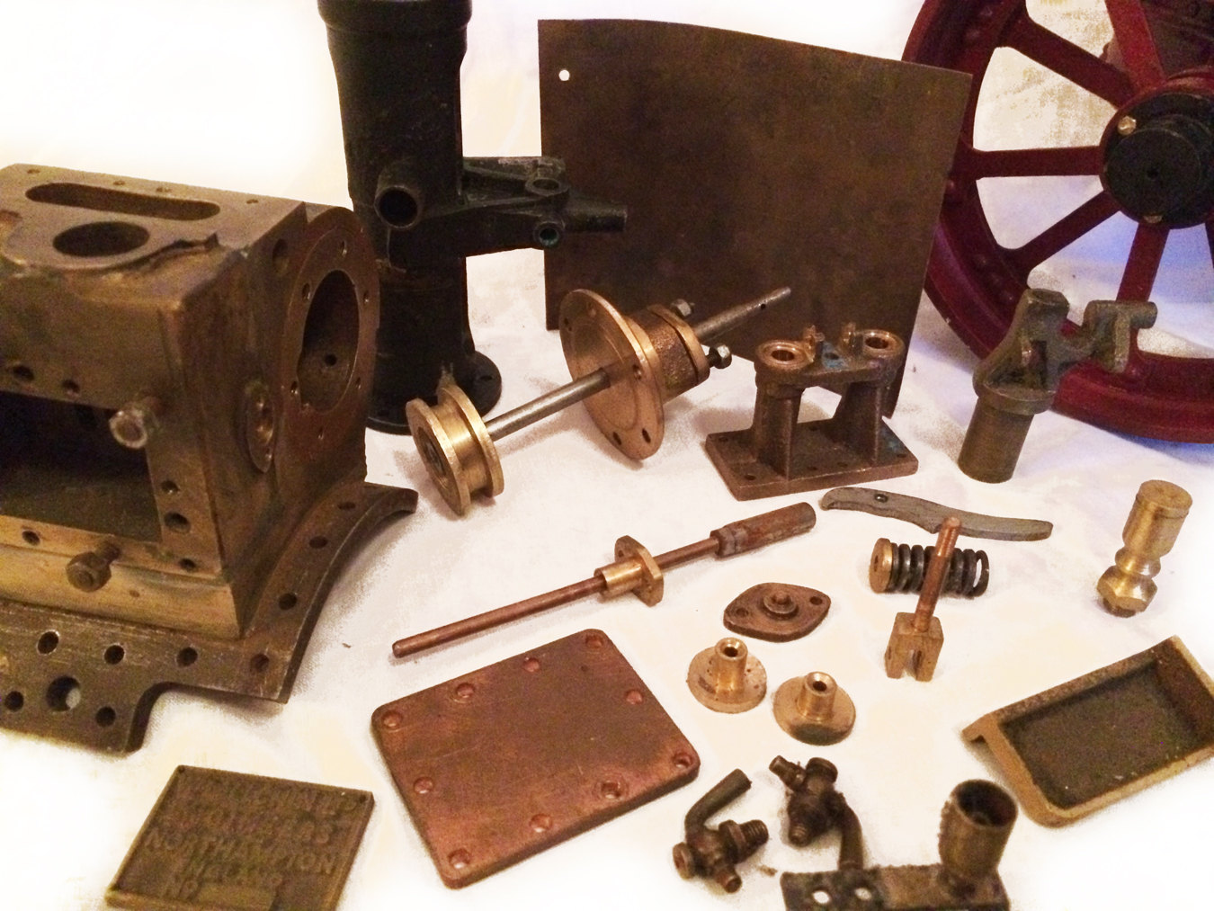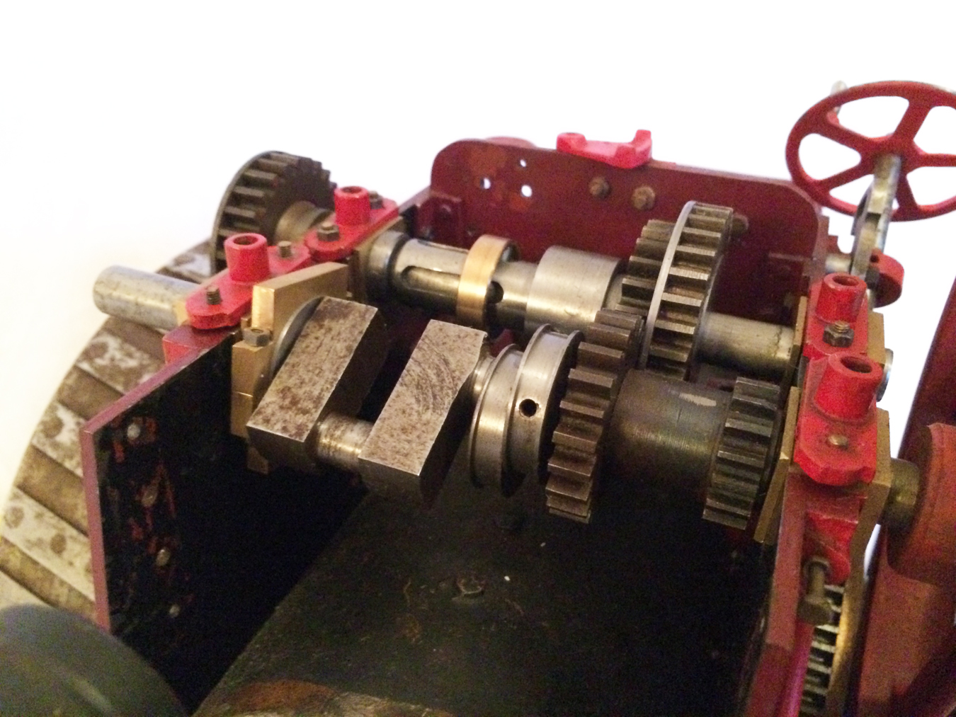 The model is a rolling engine and well on the way. It includes a very tidy looking copper boiler. The cylinder block is machined but not fitted, and the valve castings are there for completion. The gearing is all there, as are the crank and eccentrics including much of the valve gear.