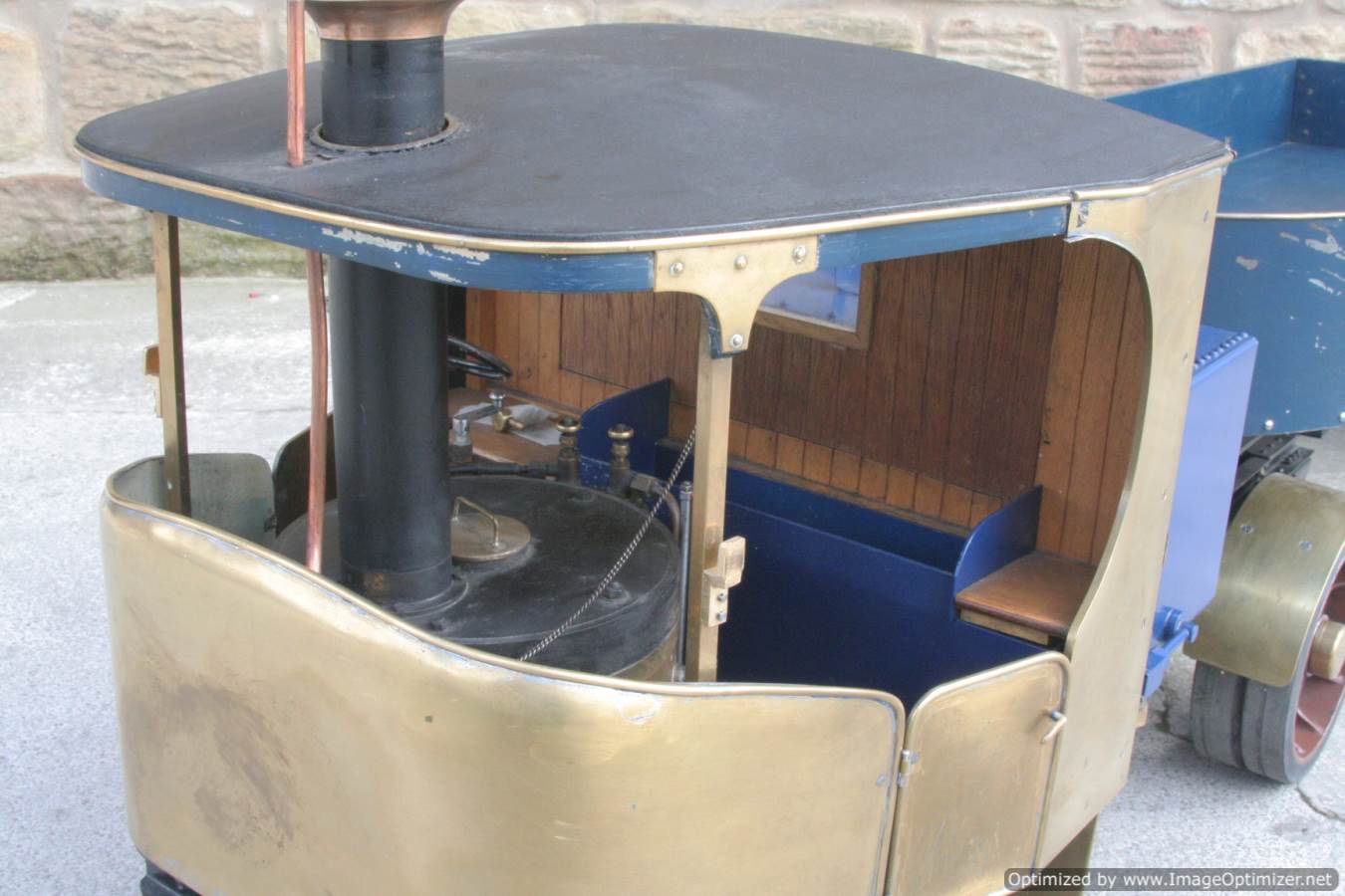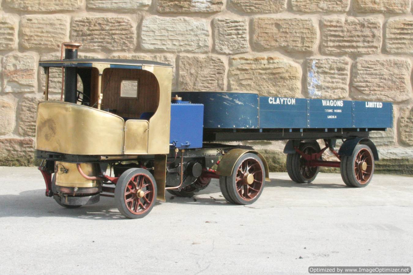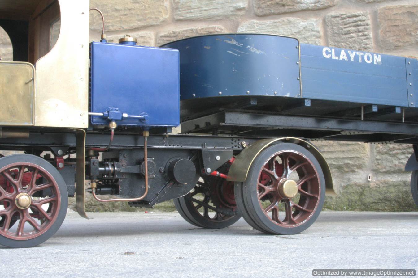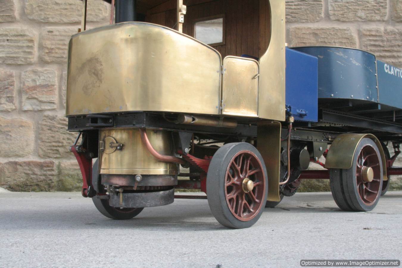 Here we have a nicely made 2" Clayton steam wagon. It's the usual Articulated version, and although finished and running, the previous owner has started removing the paint from the lorry in order to freshen it up. Hence the water tank is in fresh blue, the trailer still in the original darker blue, and the cab in bright brass.