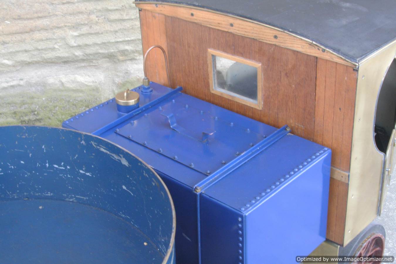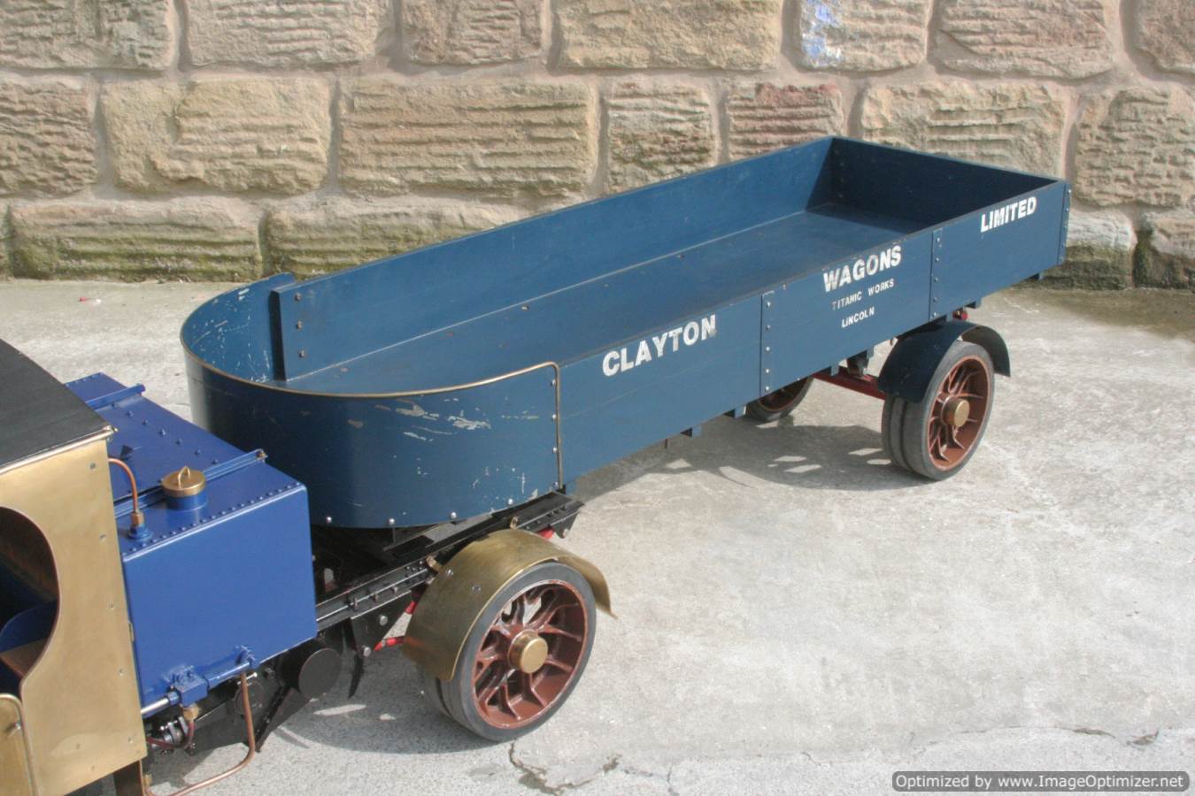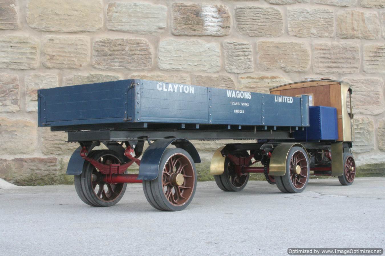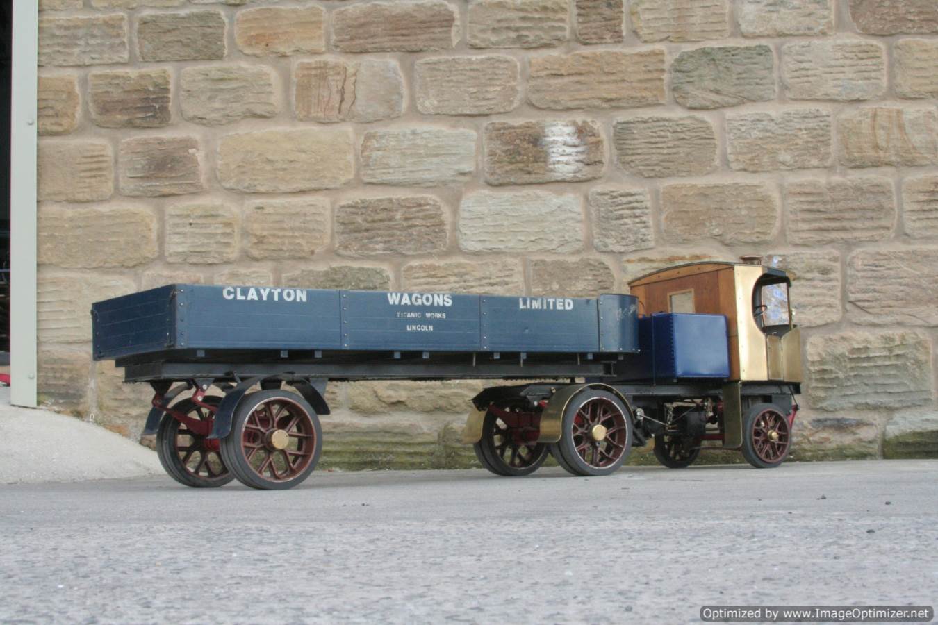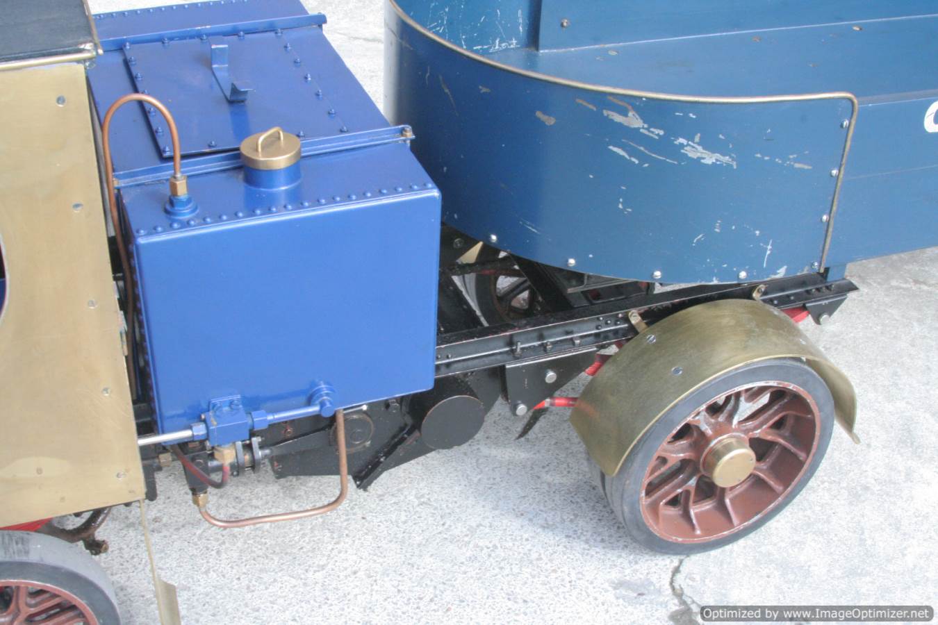 Here we have a nicely made 2" Clayton steam wagon. It's the usual Articulated version, and although finished and running, the previous owner has started removing the paint from the lorry in order to freshen it up. Hence the water tank is in fresh blue, the trailer still in the original darker blue, and the cab in bright brass.
