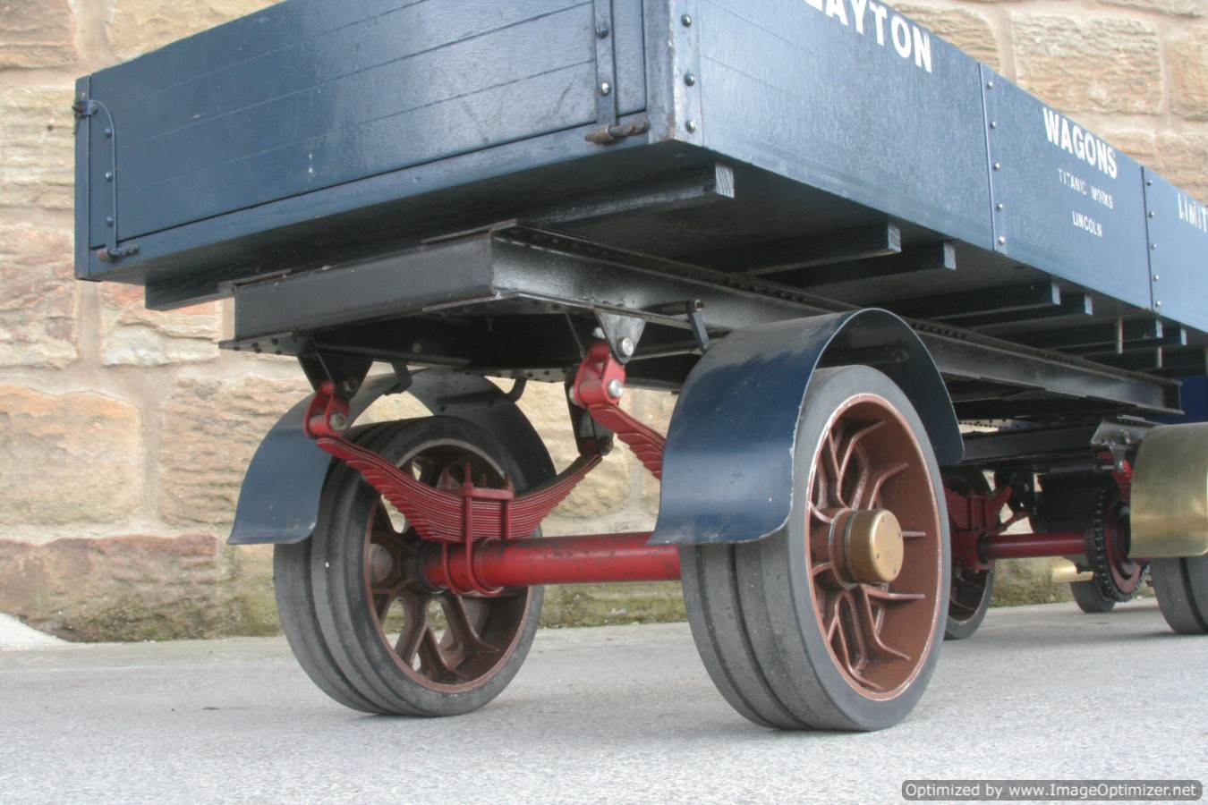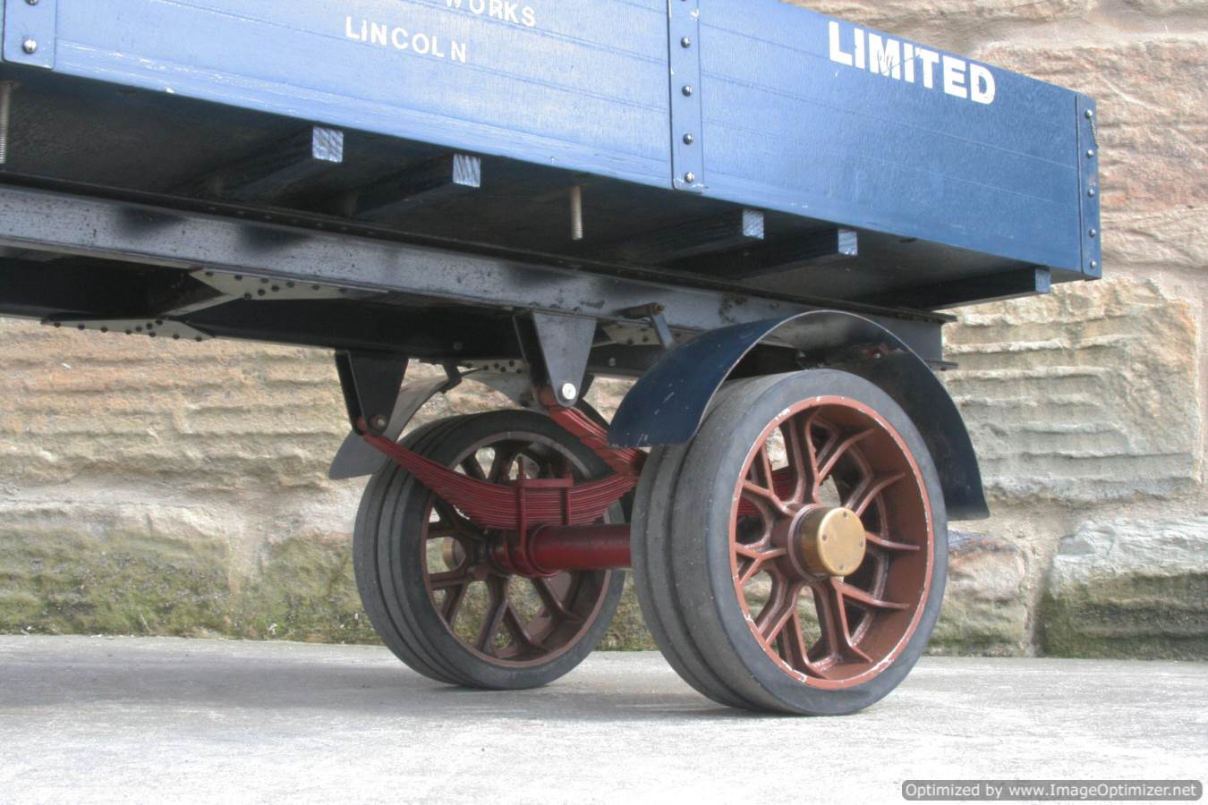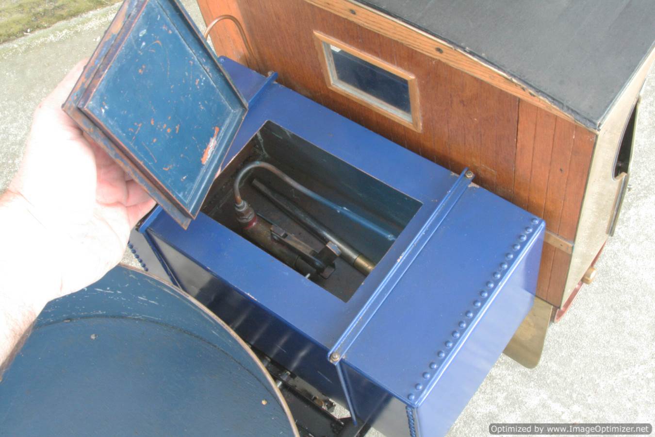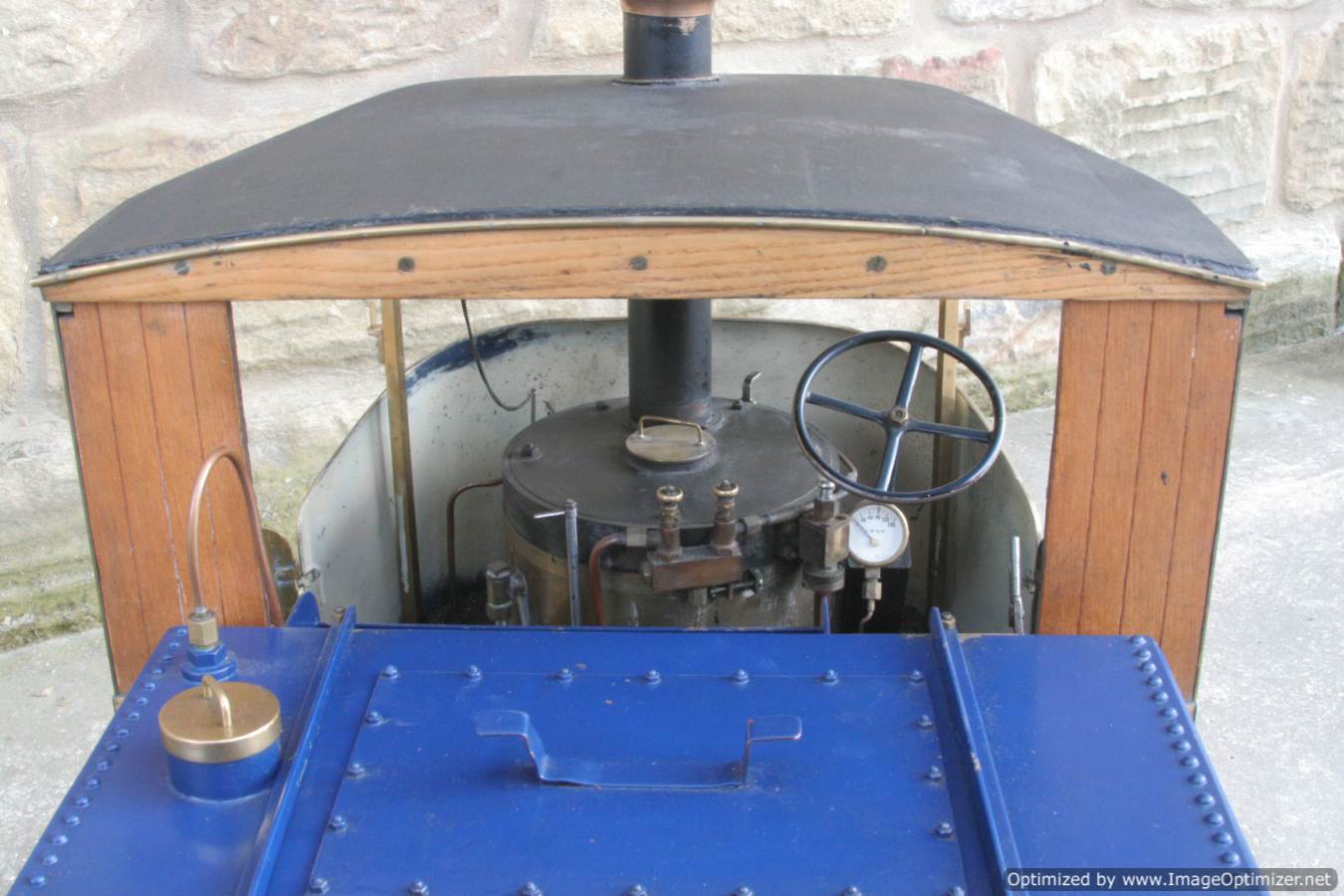 Here we have a nicely made 2" Clayton steam wagon. It's the usual Articulated version, and although finished and running, the previous owner has started removing the paint from the lorry in order to freshen it up. Hence the water tank is in fresh blue, the trailer still in the original darker blue, and the cab in bright brass.