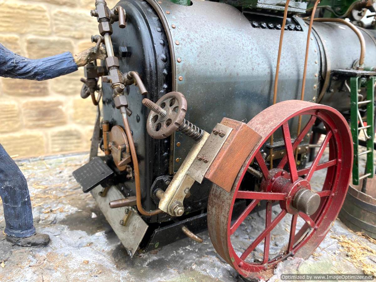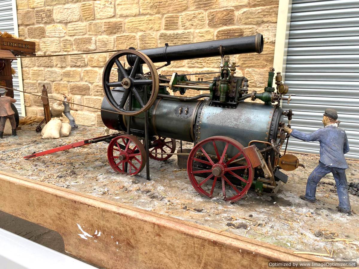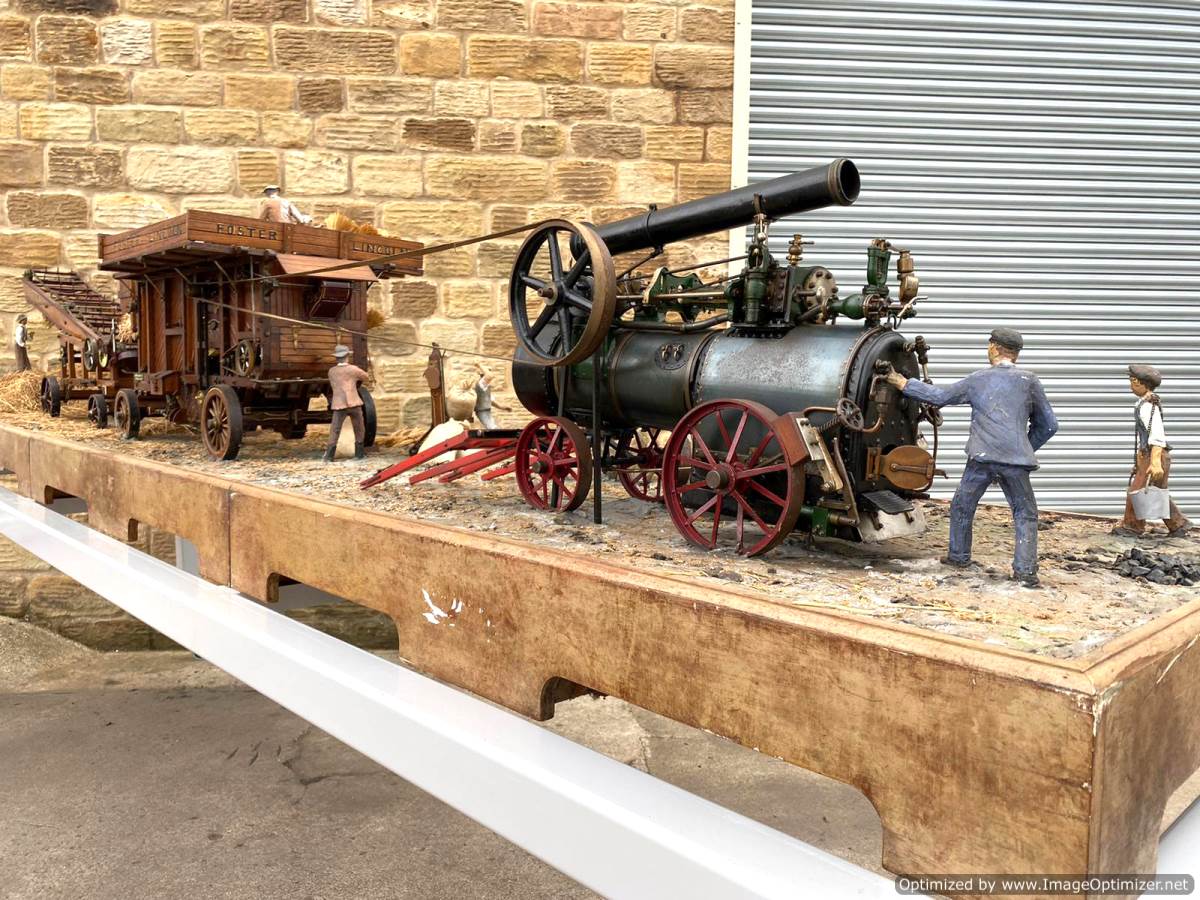 Here we have a superb and everso-slightly massive 'working' diorama! Firstly there's a 2" Robey portable. Built as a working model, although currently unsteamed, it has been set up on this display with a rubber drive belt through the ground to a hidden electric motor so that it can be turned over at the flick of a switch. The boiler is copper, nicely flanged, strongly made, riveted all over and then there's an extremely liberal application of solder caulking all over it on the inside, probably suggesting that a sensible working pressure would be around the 75 - 80 psi mark. Machining work is nice and tight and everything moves just as well as it should.