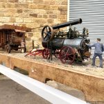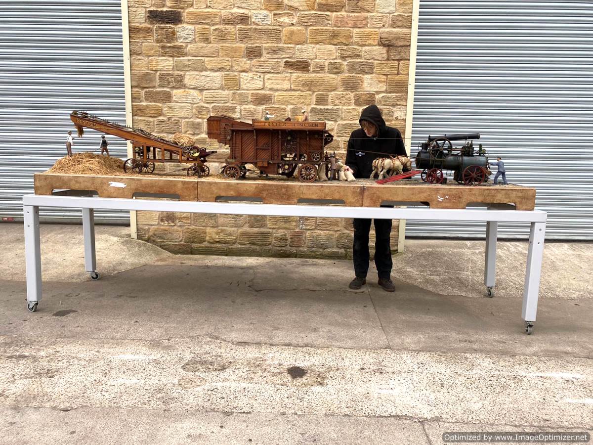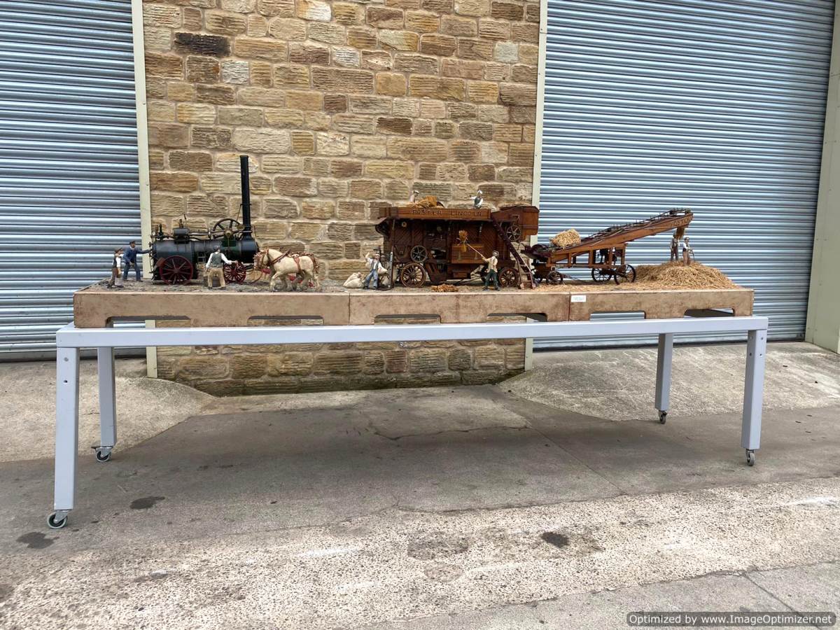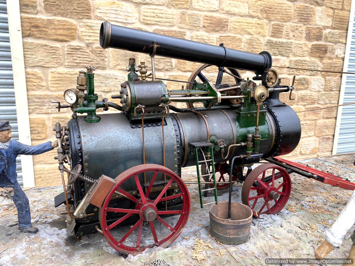 Here we have a superb and everso-slightly massive 'working' diorama! Firstly there's a 2" Robey portable. Built as a working model, although currently unsteamed, it has been set up on this display with a rubber drive belt through the ground to a hidden electric motor so that it can be turned over at the flick of a switch. The boiler is copper, nicely flanged, strongly made, riveted all over and then there's an extremely liberal application of solder caulking all over it on the inside, probably suggesting that a sensible working pressure would be around the 75 - 80 psi mark. Machining work is nice and tight and everything moves just as well as it should.