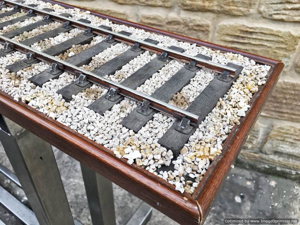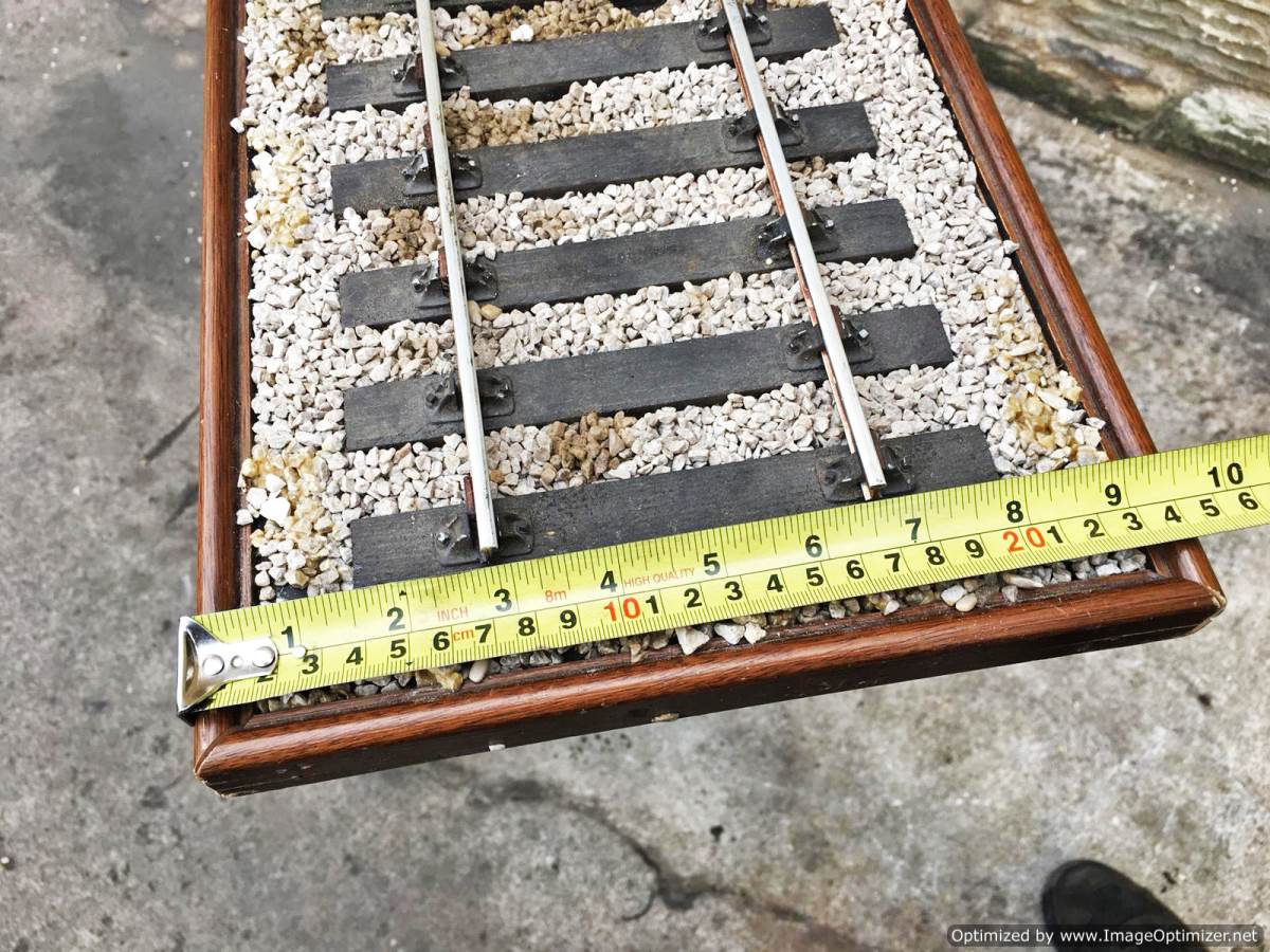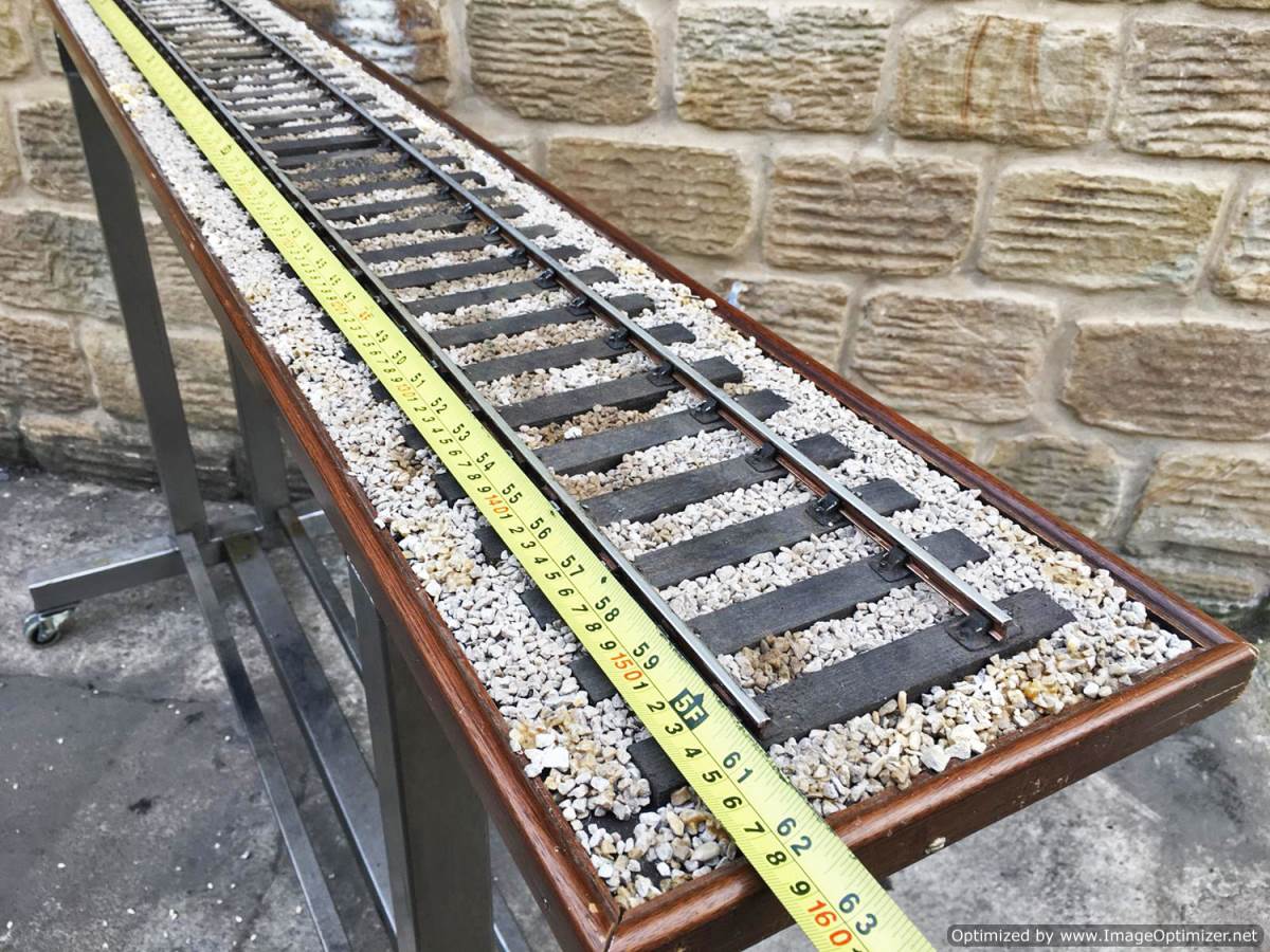Here we have a very nice 3 1/2" gauge display track.  Fully detailed with sleepers, chairs and the correct rail section.  The odd bit of oil staining to the ballast, but nothing a little clean wouldn't sort, and on a tidy wooden base.  Ideal and long enough for a large express passenger loco in this scale.