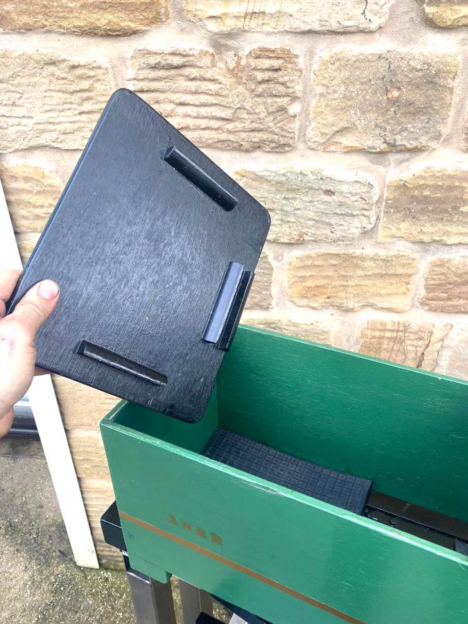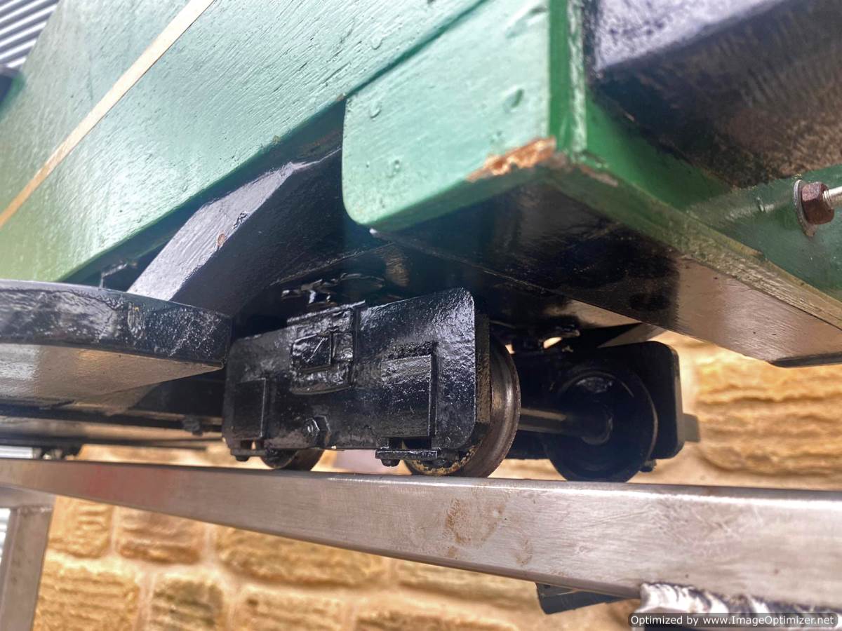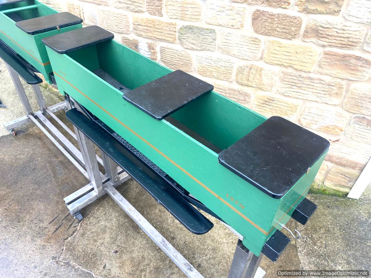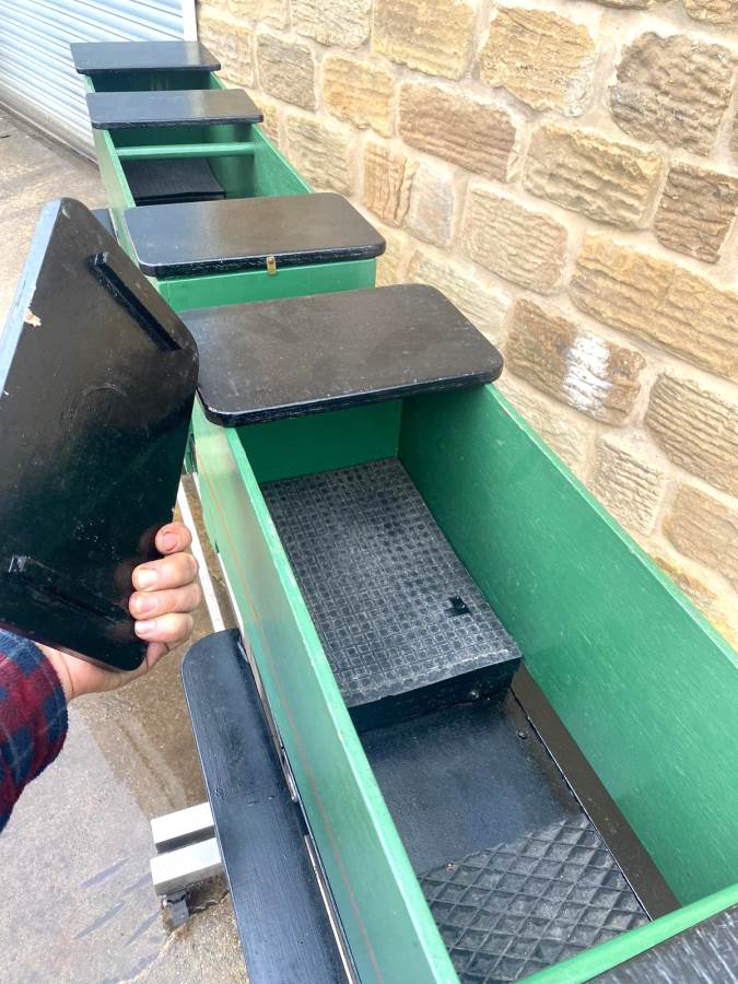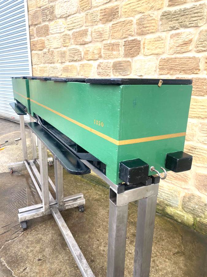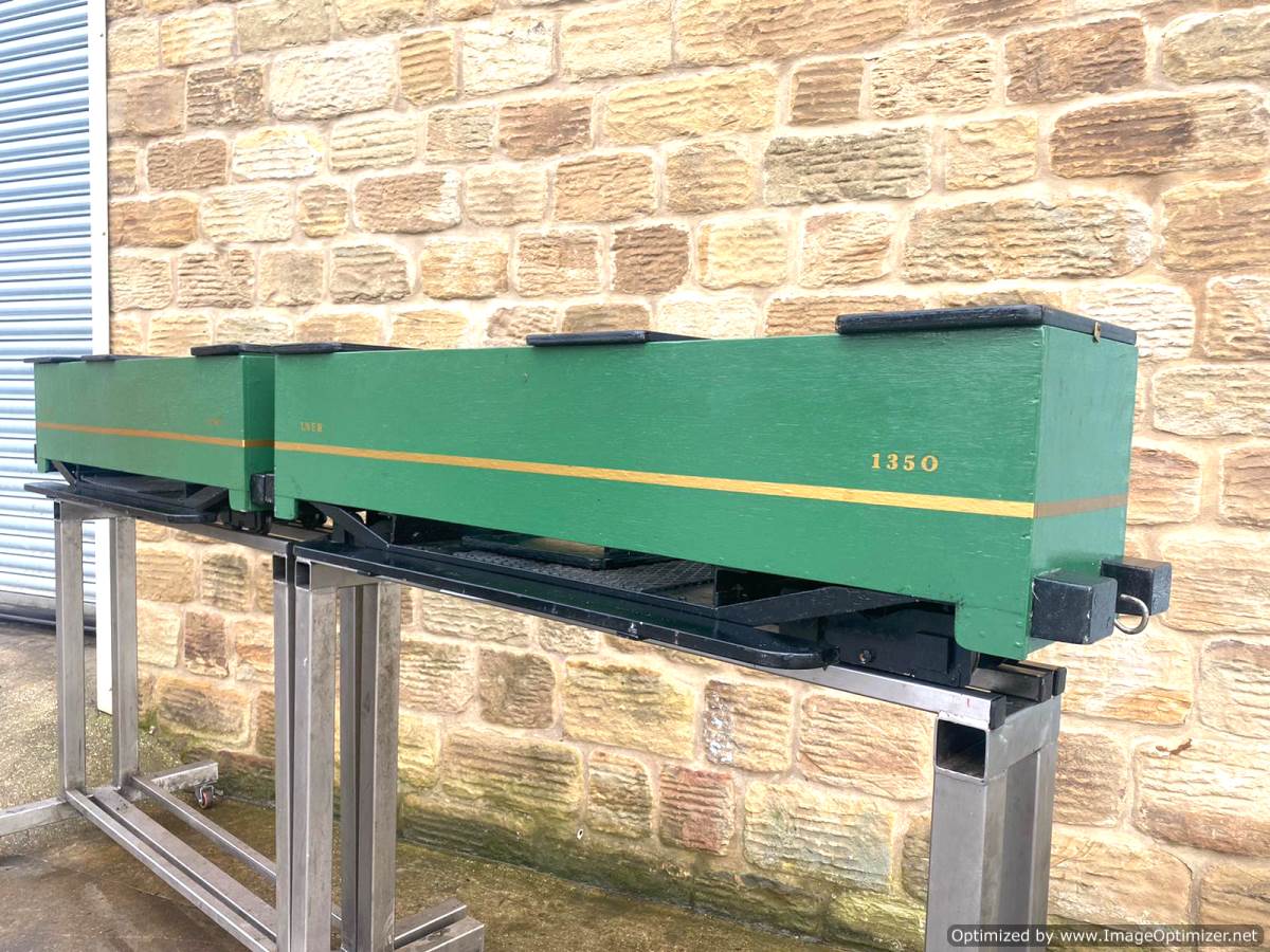 Here we have a pair of 3 1/2" gauge ground level sit astride carriages.  They can be split and run separately too.  Solidly made and in nice condition they have robust and free rolling bogies, seat boards that are free to slide around for the most comfortable fit.  The littler passengers can easily put their feet inside the carriage and the larger can comfortably use the running boards.  Versatile and stable little wagons that are ideal for that garden track.
