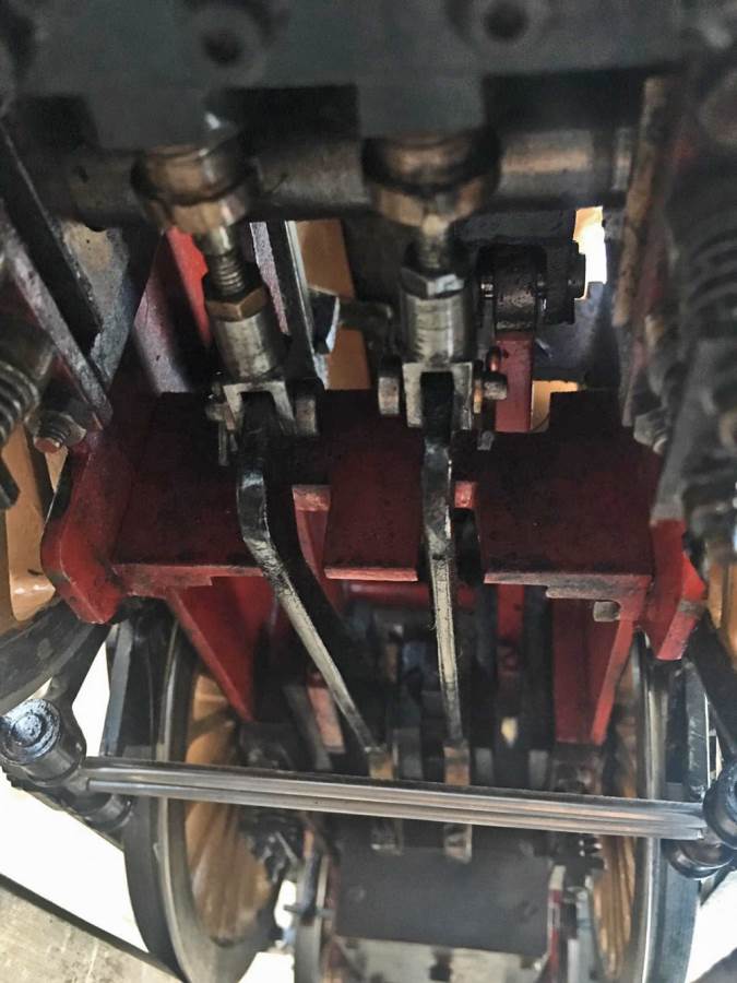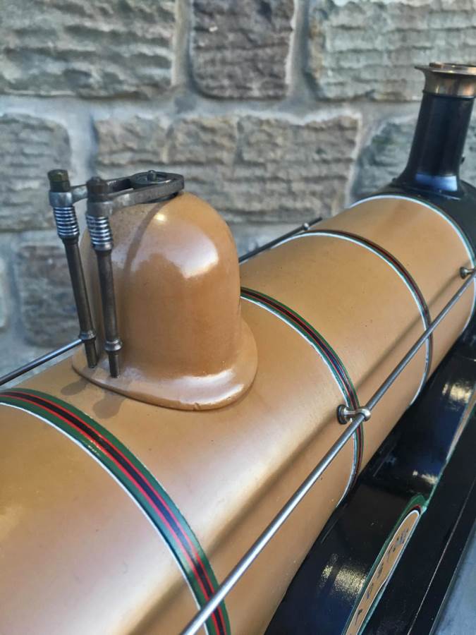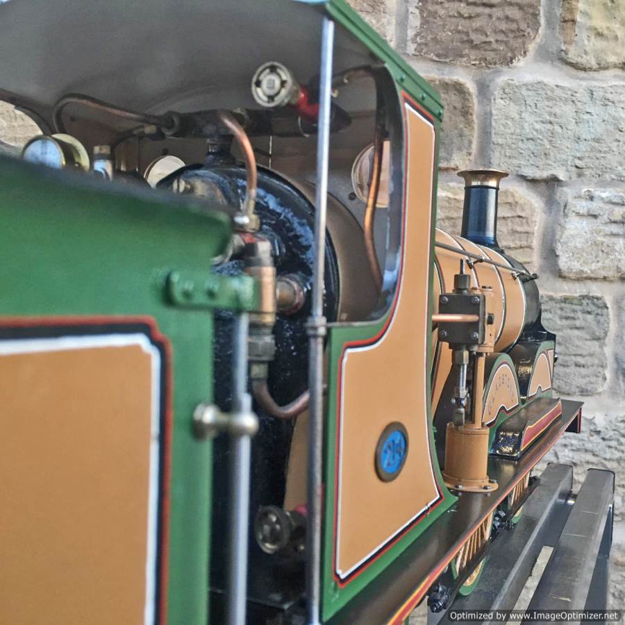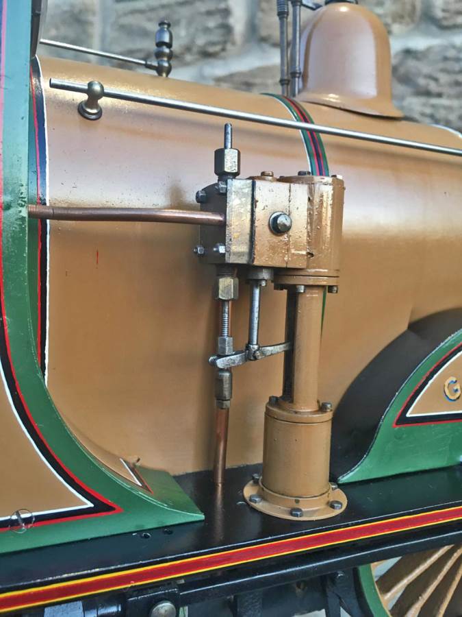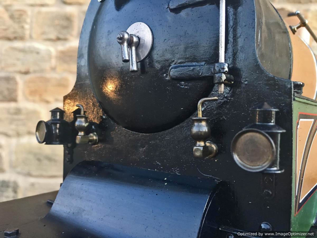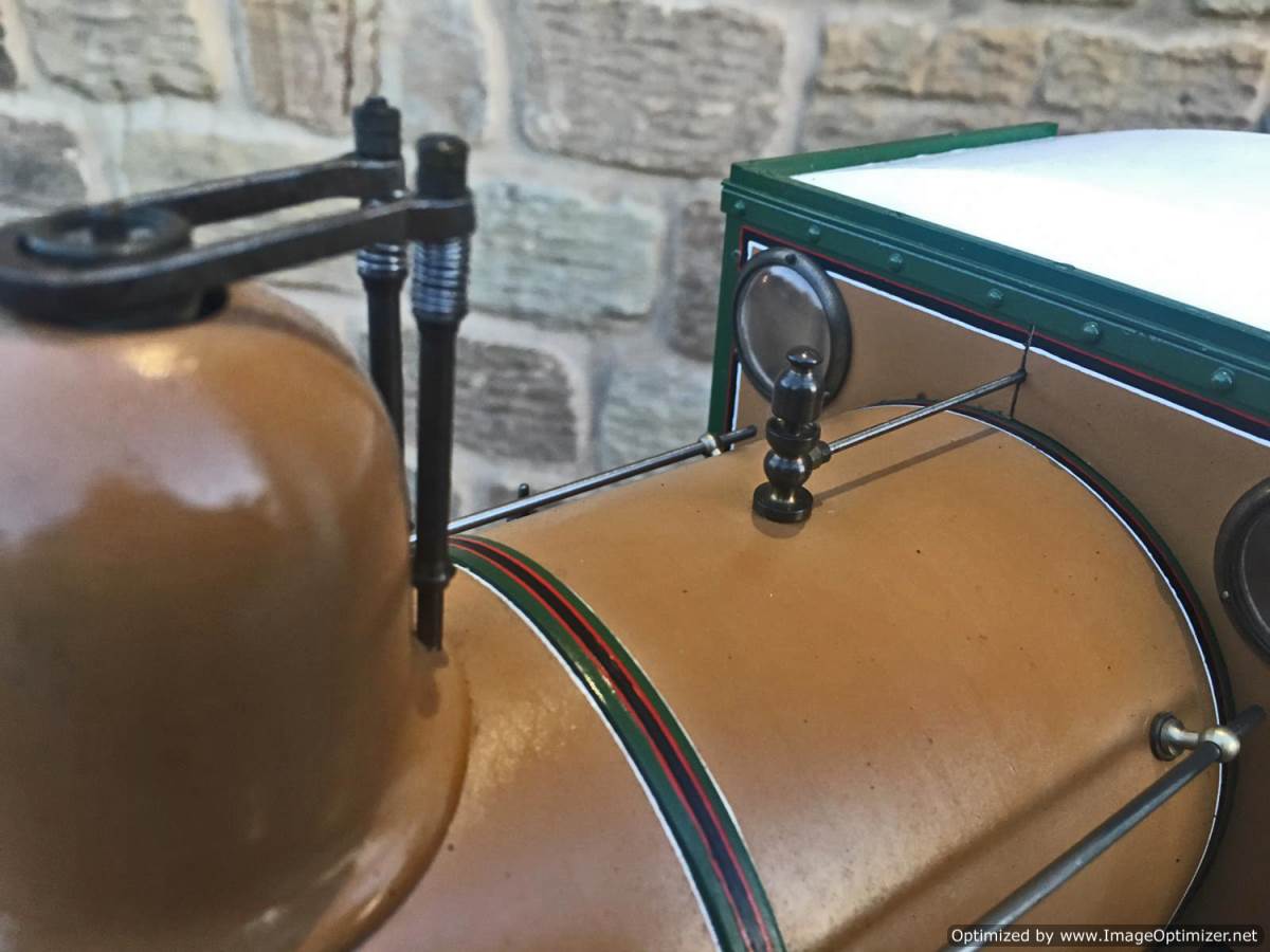 Fitted with a crank pin pump for water, mounted underneath the cab and driven by a rod from the rear driving wheel crank pin and fed through a bypass valve on the footplate.  There is also a large hand pump in the tender for water as well.  Lubrication is a simple large displacement one under the front running boards feeding directly into the valve chest.  Boiler is copper of course and superheated, and unfortunately we've found a couple of weaps on the stays in the firebox under our twice working pressure hydraulic.  We've done our sums and it's not economically sensible for us to strip the model down and repair the weeps here in house, so she's now being offered here at a much reduced price and as a project for someone instead to have a go at caulking the weeps.