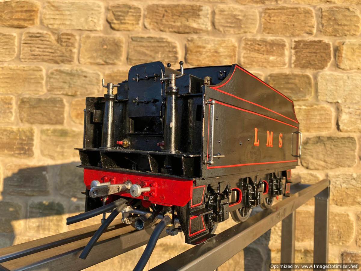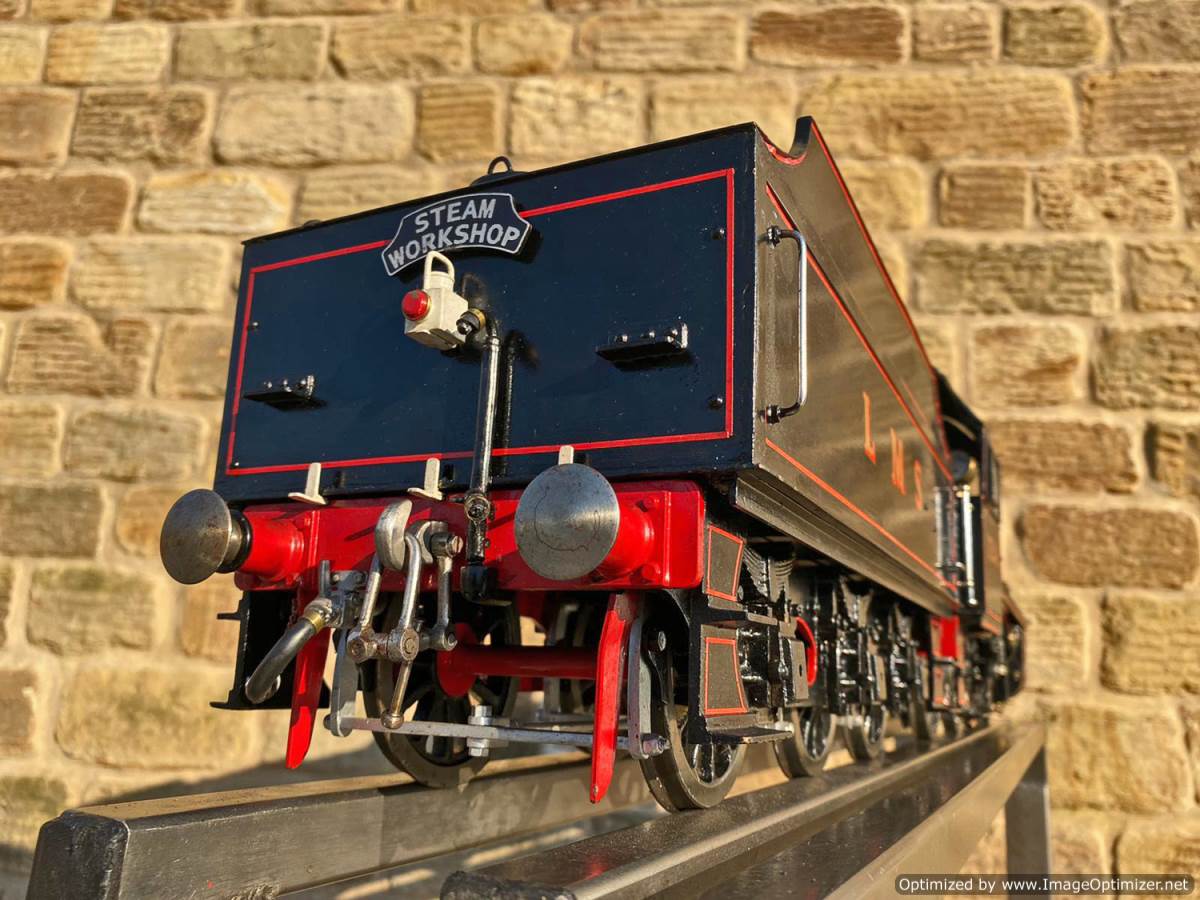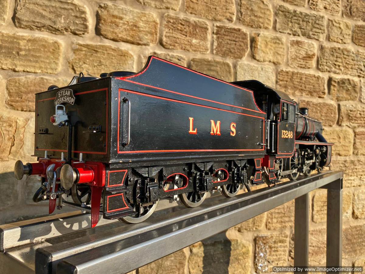 Here we have a 3 1/2" gauge LMS Stanier Mogul built to the well proven LBSC Princess Marina design.  Quite a lot of nice detail on this one.  The cylinder pressure relief valves, valve slide bar detailing, cab doors as well as the nicely detailed tender.  Not just a 'basic' Princess Marina, but a model where the builder has looked at the real locomotive and tried to push the model toward the prototype.  Everything mechanically is still nicely tight and well machined, so we expect it to run as well as it looks.