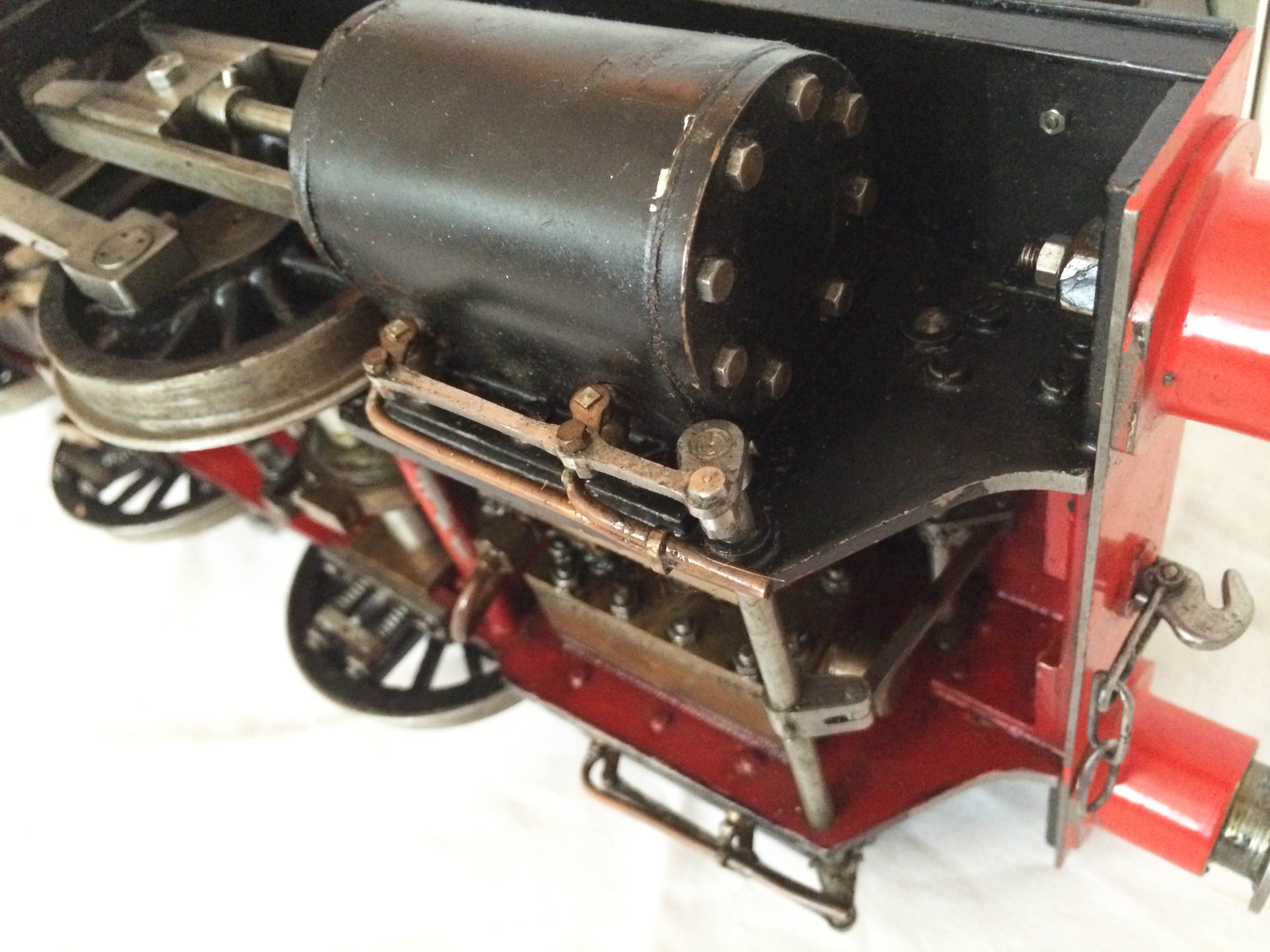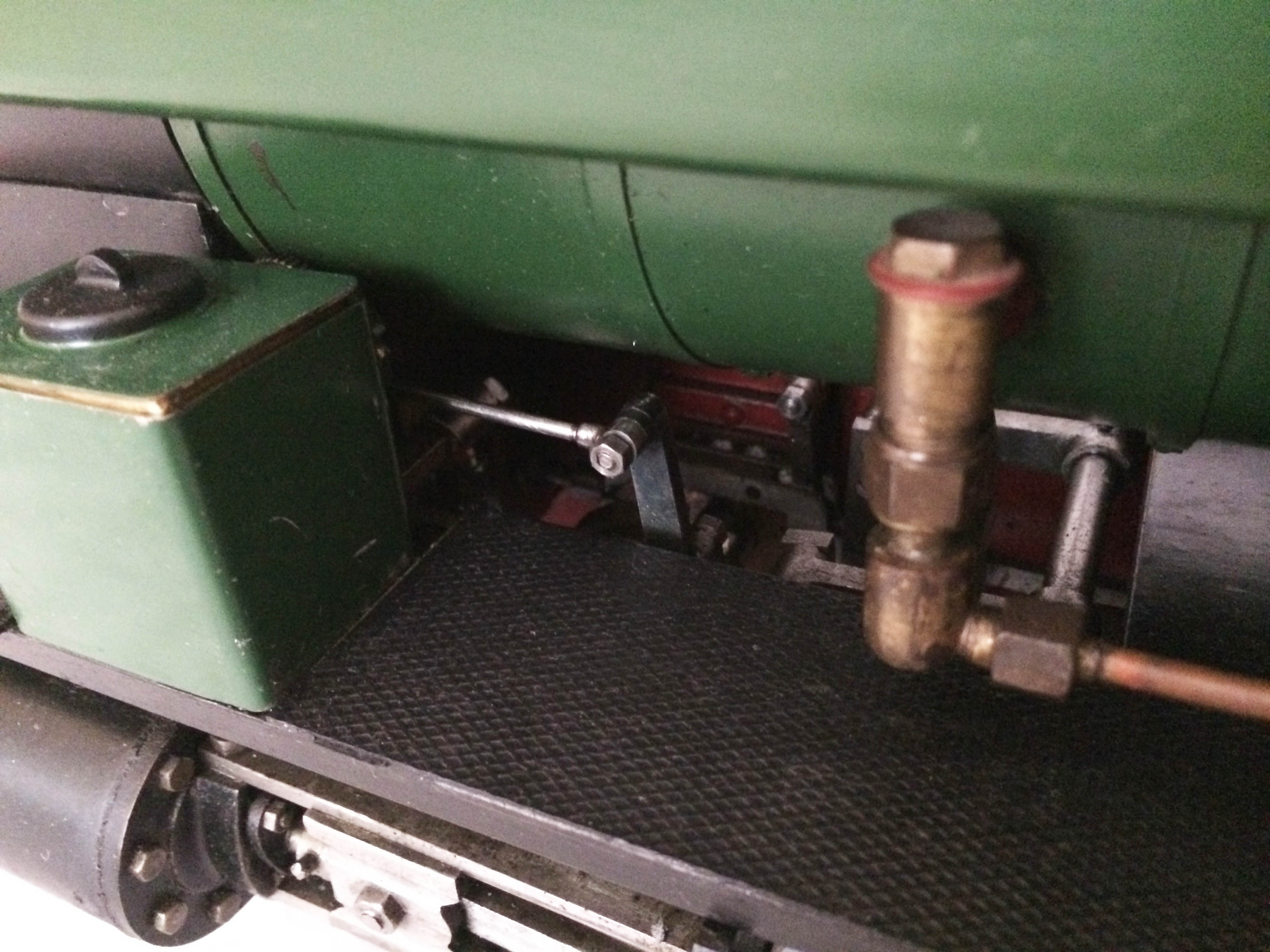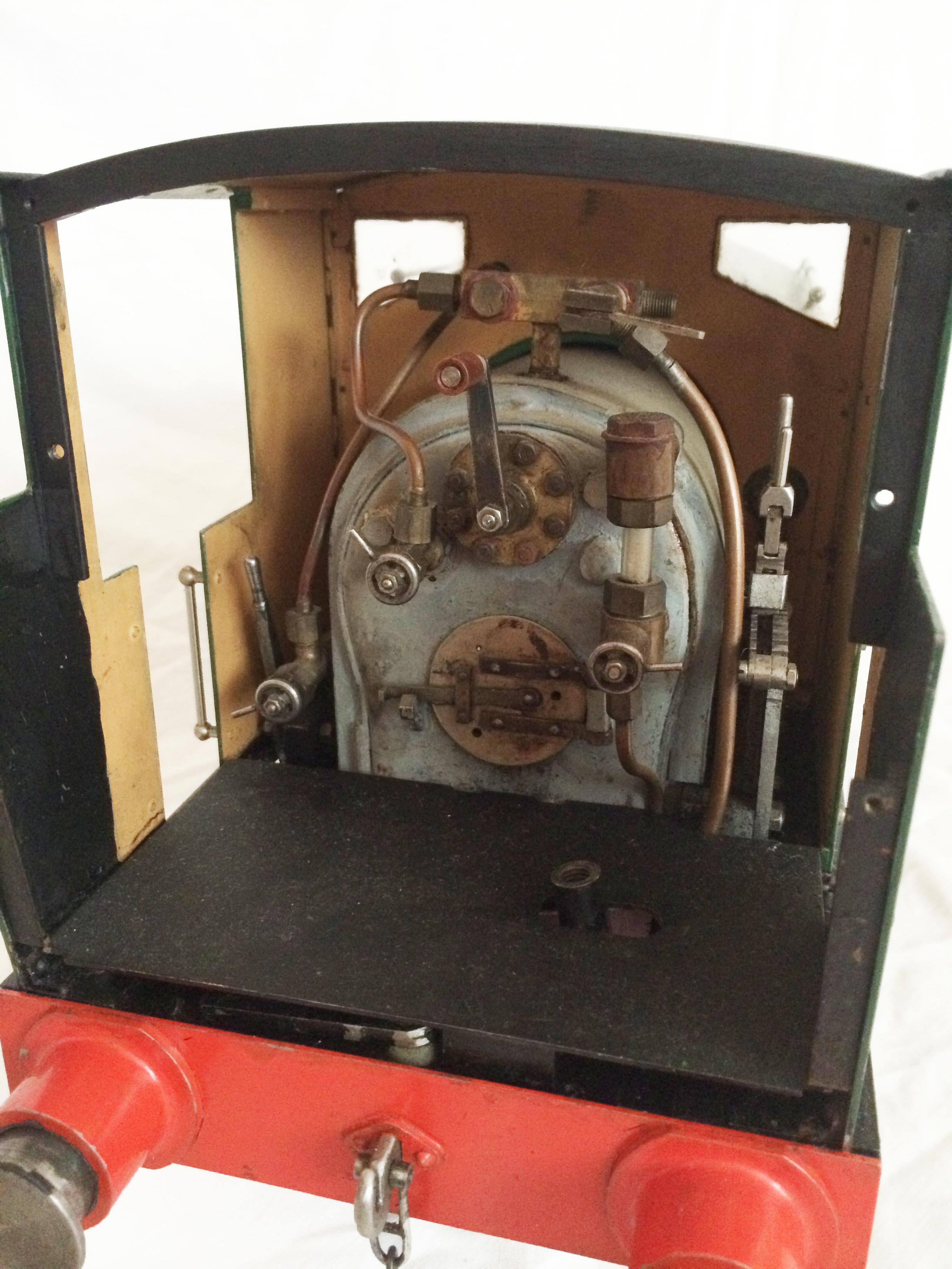 The model has an eccentric driven water feed pump between the frames, with a backhead mounted bypass valve returning to the tank, and a subtly hidden hand pump under the removable cab footplate.  The pressure gauge is missing in the photos purely because we removed it to do the hydraulic on the boiler, which it obviously passed with no issues and so can come with a full 4 year boiler hydraulic certificate.