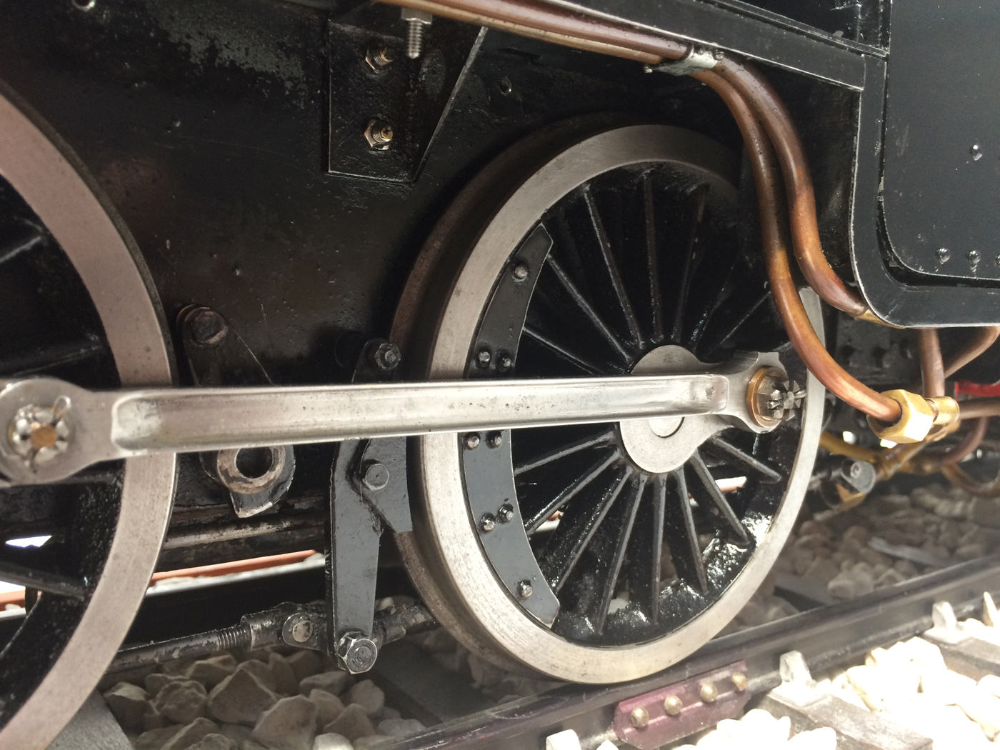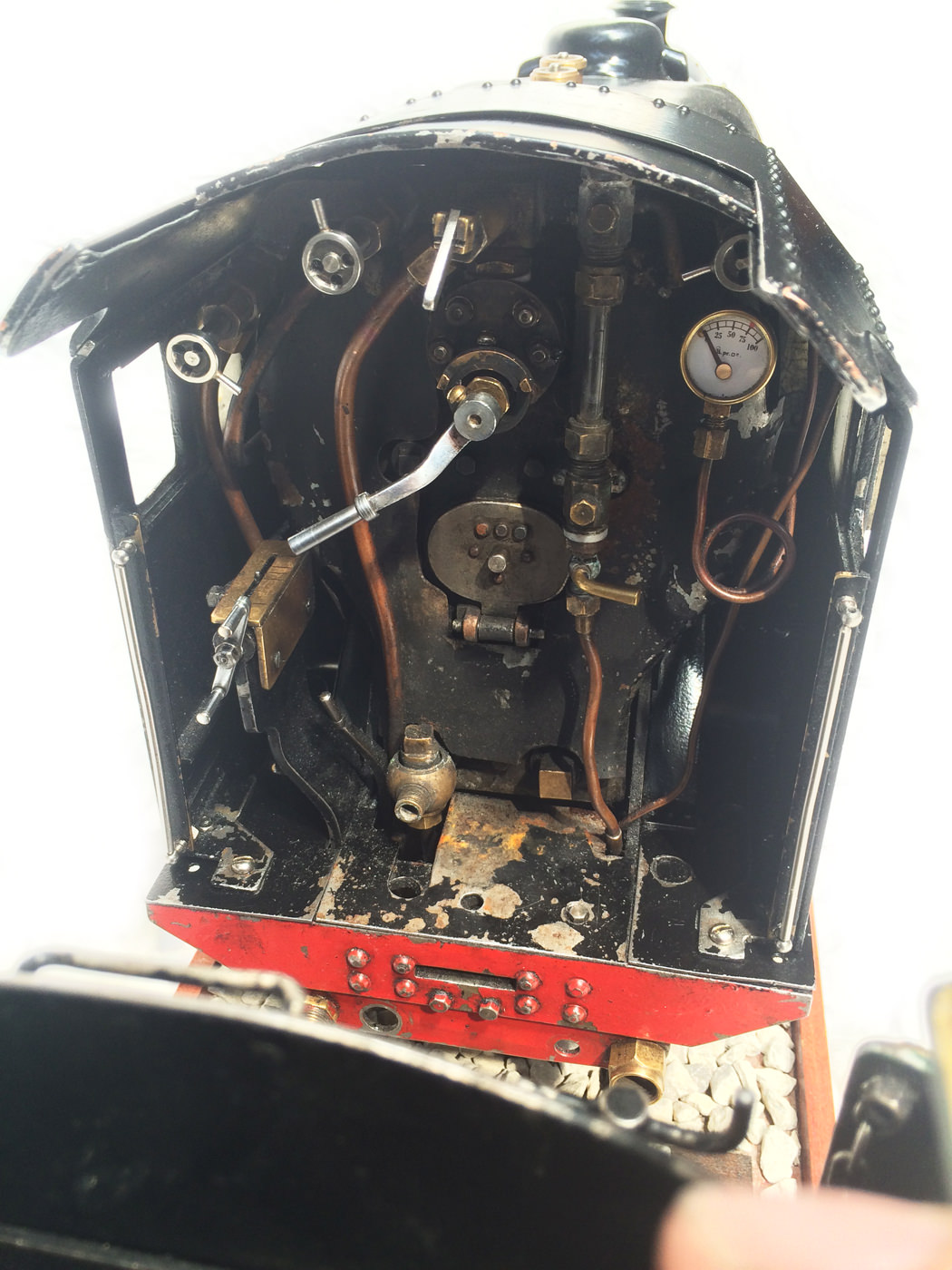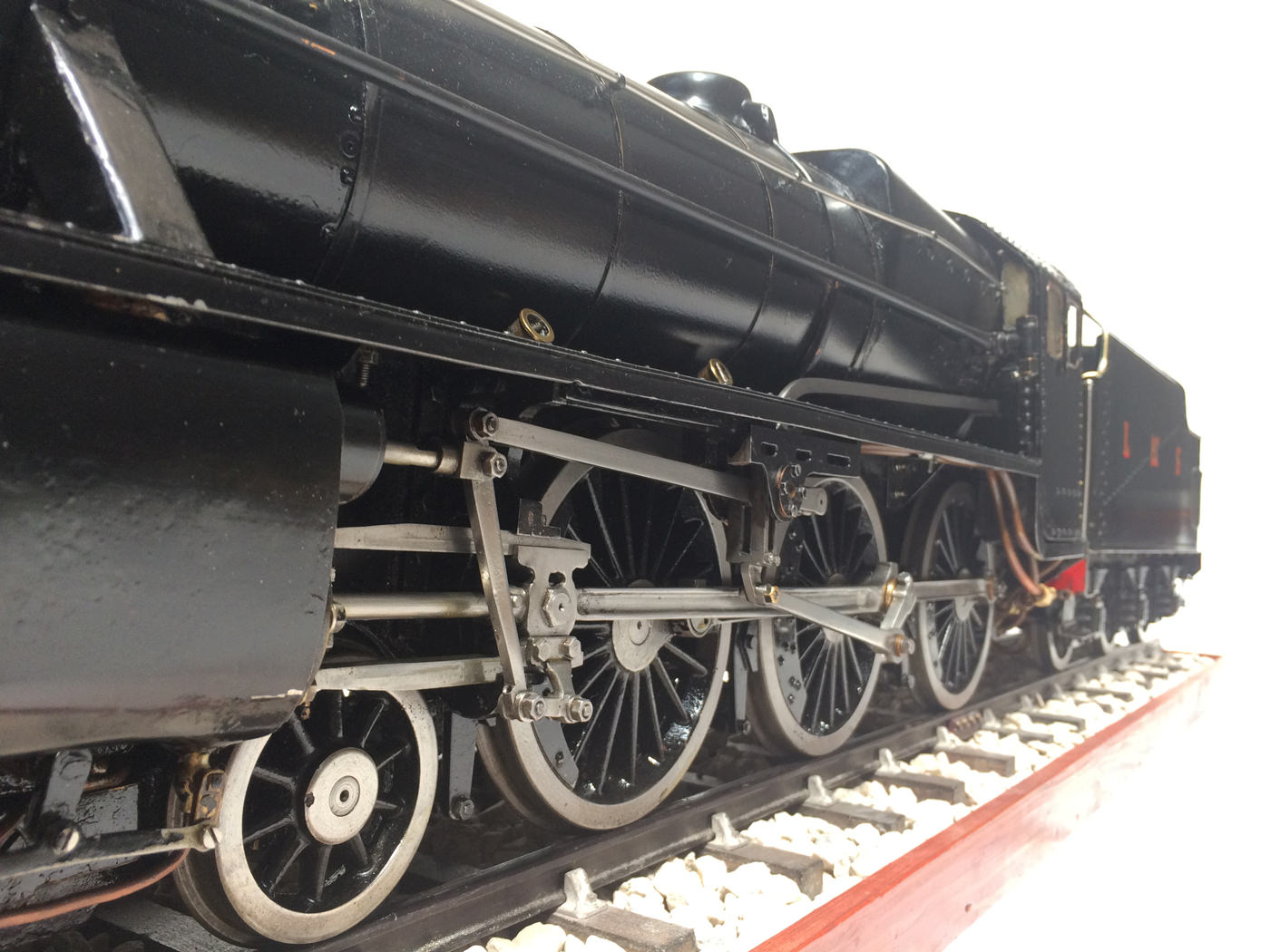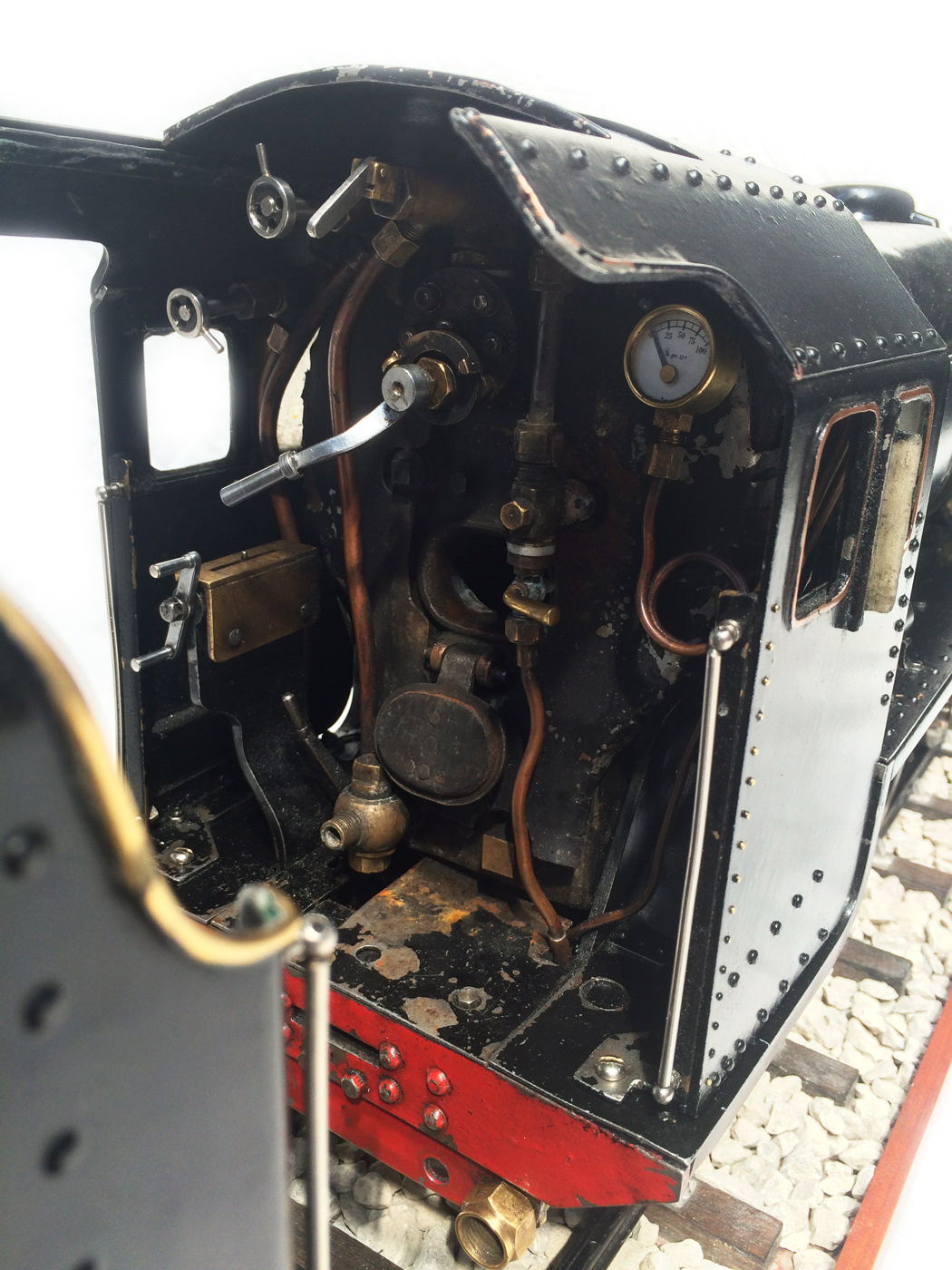 The model is fitted with all the usual refinements. There are footplate operated drain cocks, An injector, mechanical hand pump, and eccentric axle pump with bypas. Lubrication is mechanical and hidden under the front footplate. The quality of machining work on the valve gear is very neat, and the locomotive is a very nice and proven runner.