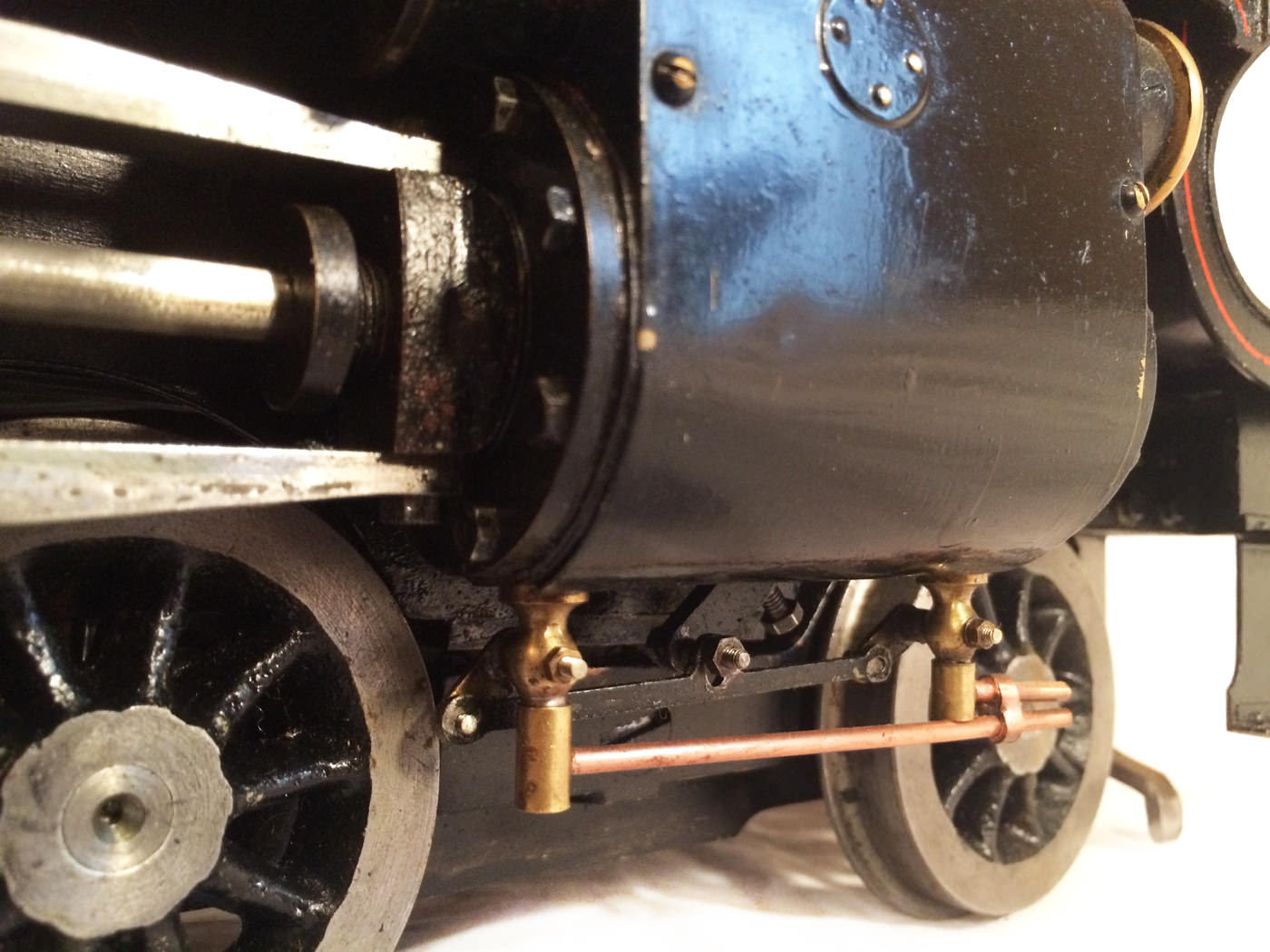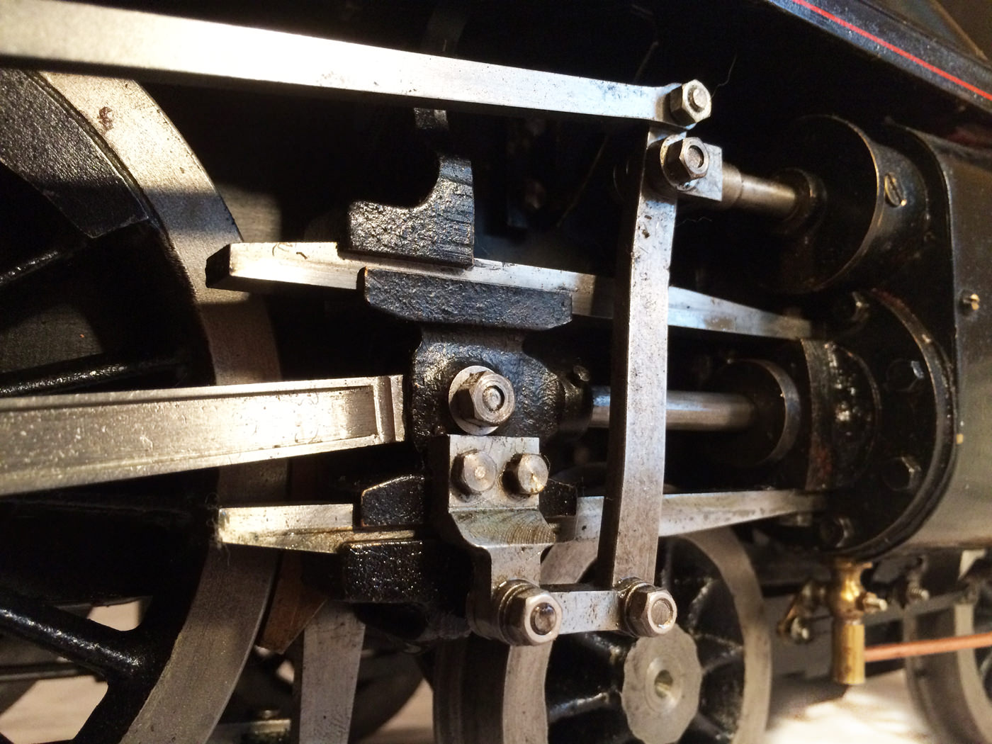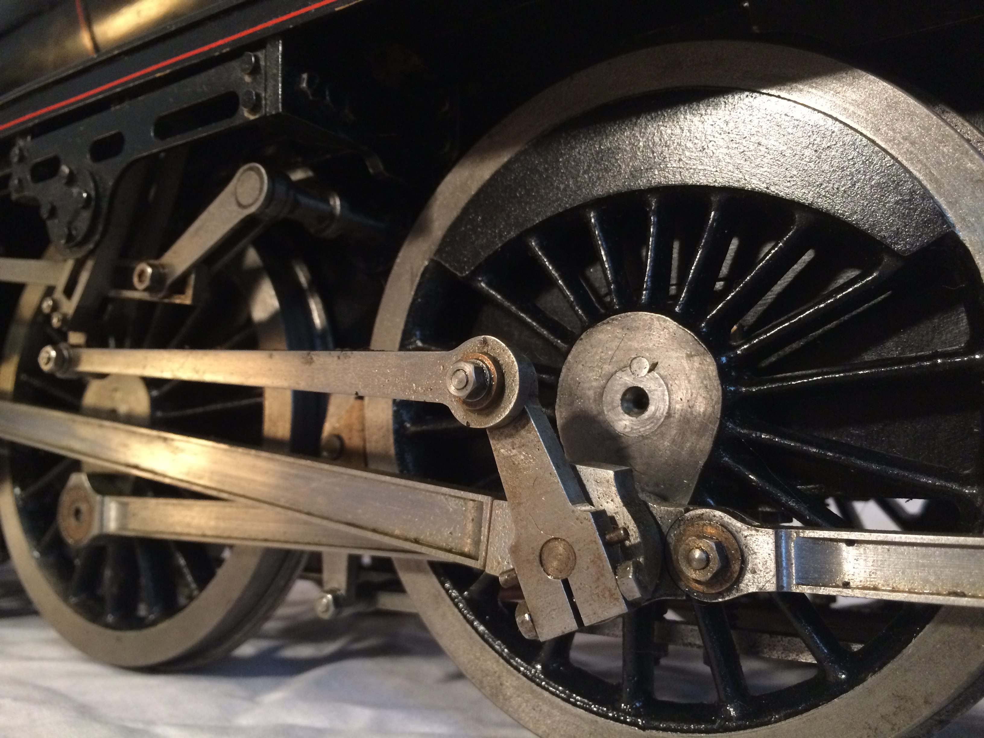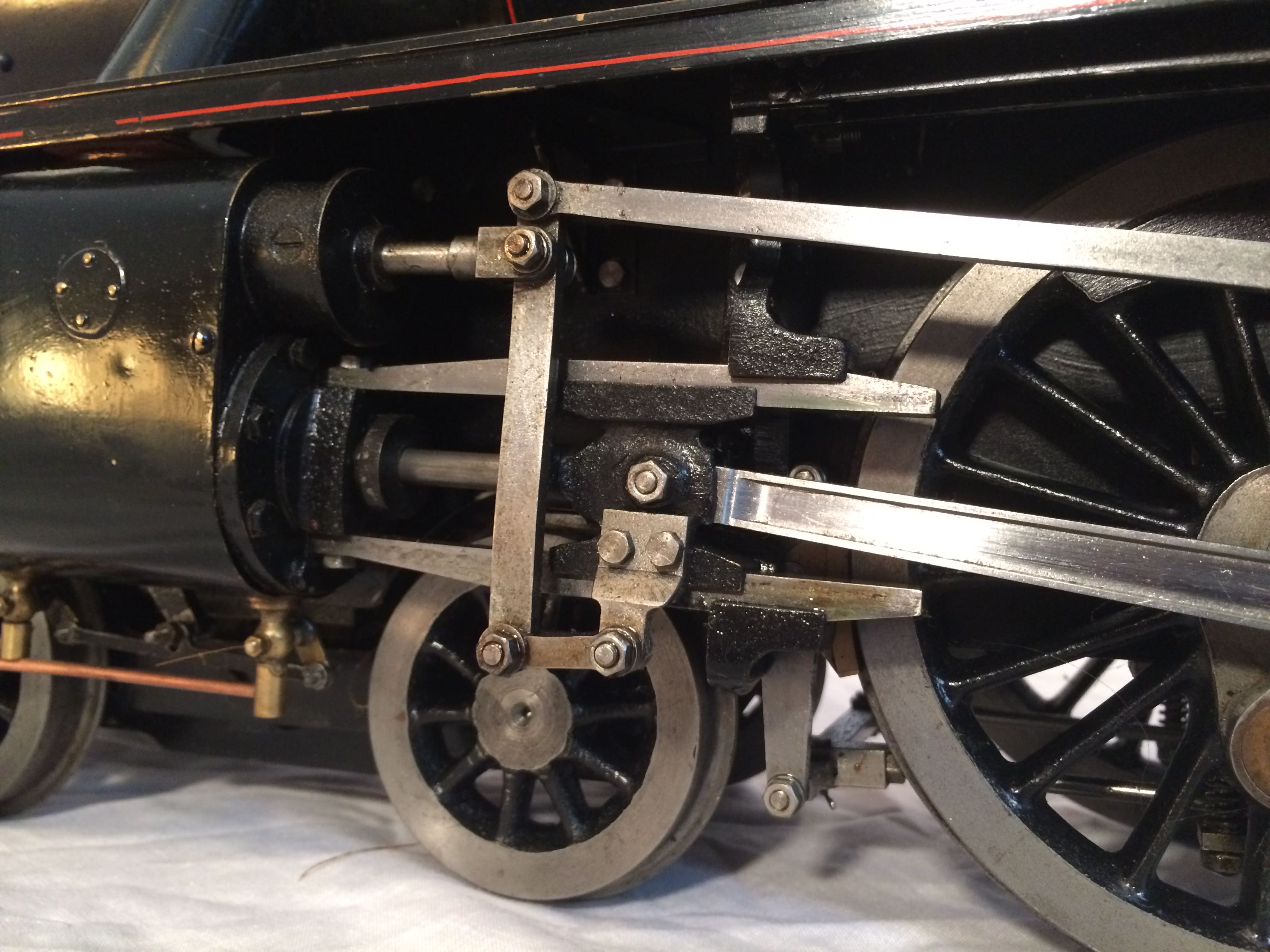 The model is fitted with all the usual refinements. There are footplate operated drain cocks, An injector, mechanical hand pump, and eccentric axle pump with bypas. Lubrication is mechanical and hidden under the front footplate. The quality of machining work on the valve gear is superb, and the locomotive has virtually no slack in the motion, although is not at all tight, suggesting that it's been run in on air. It's certainly a cut above the usual Doris, and a very nicely done example of the well loved Black 5.