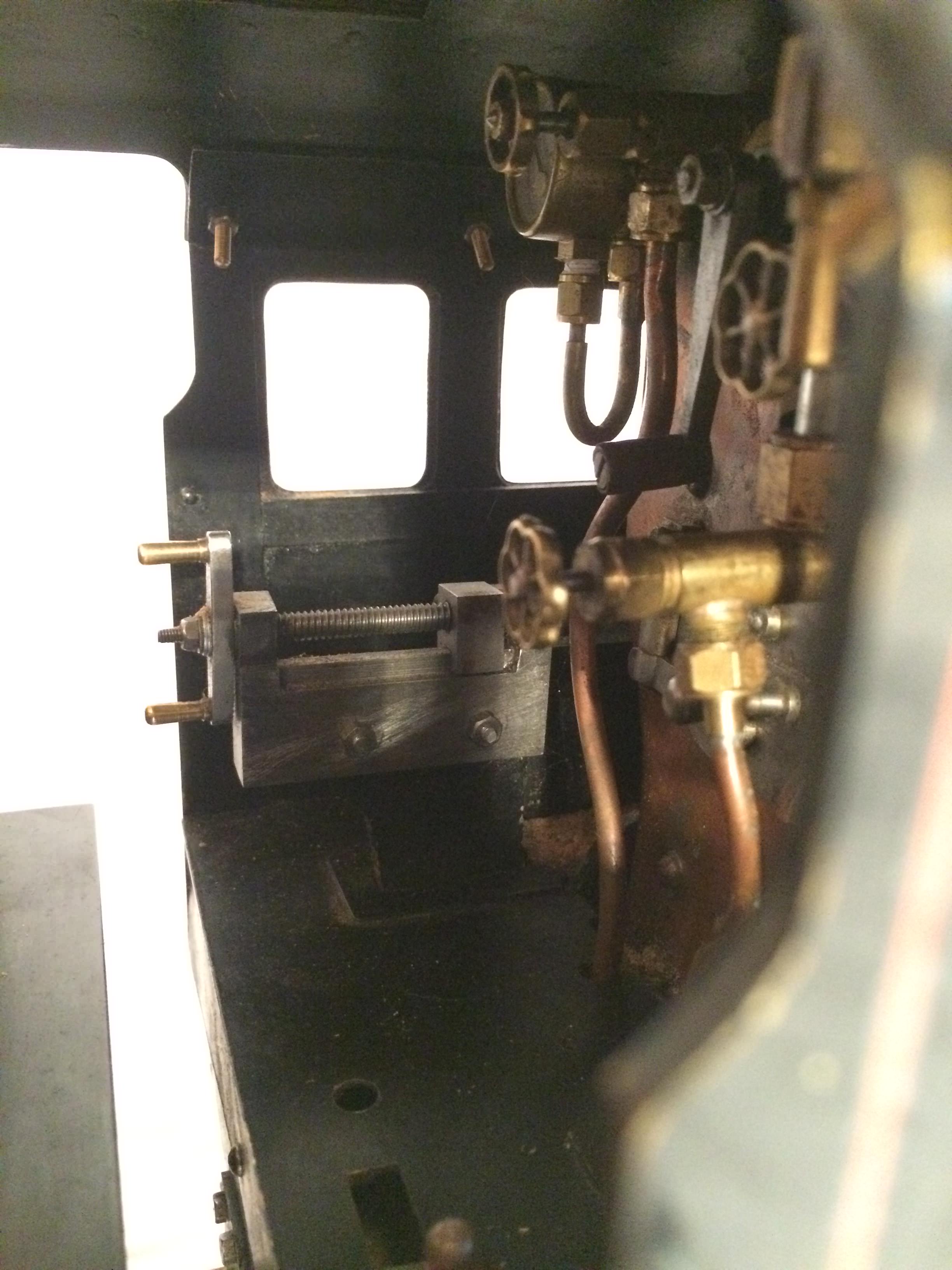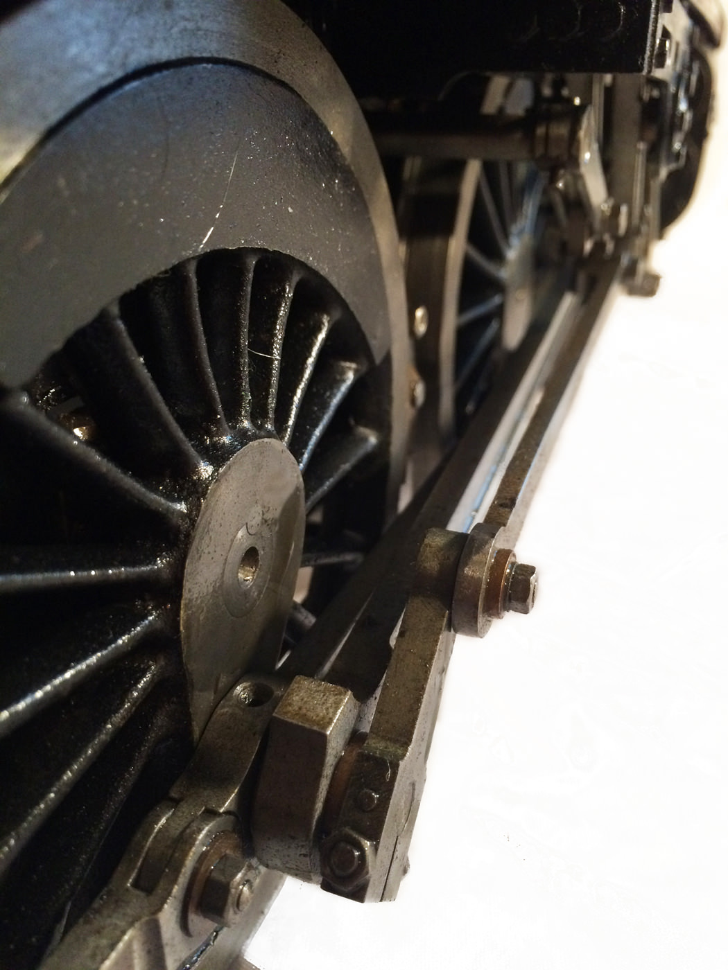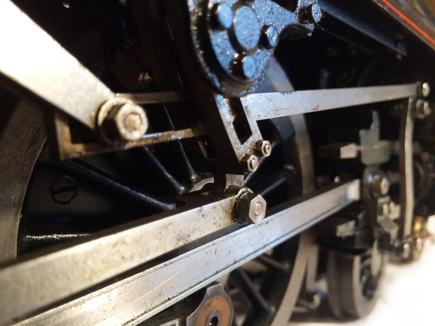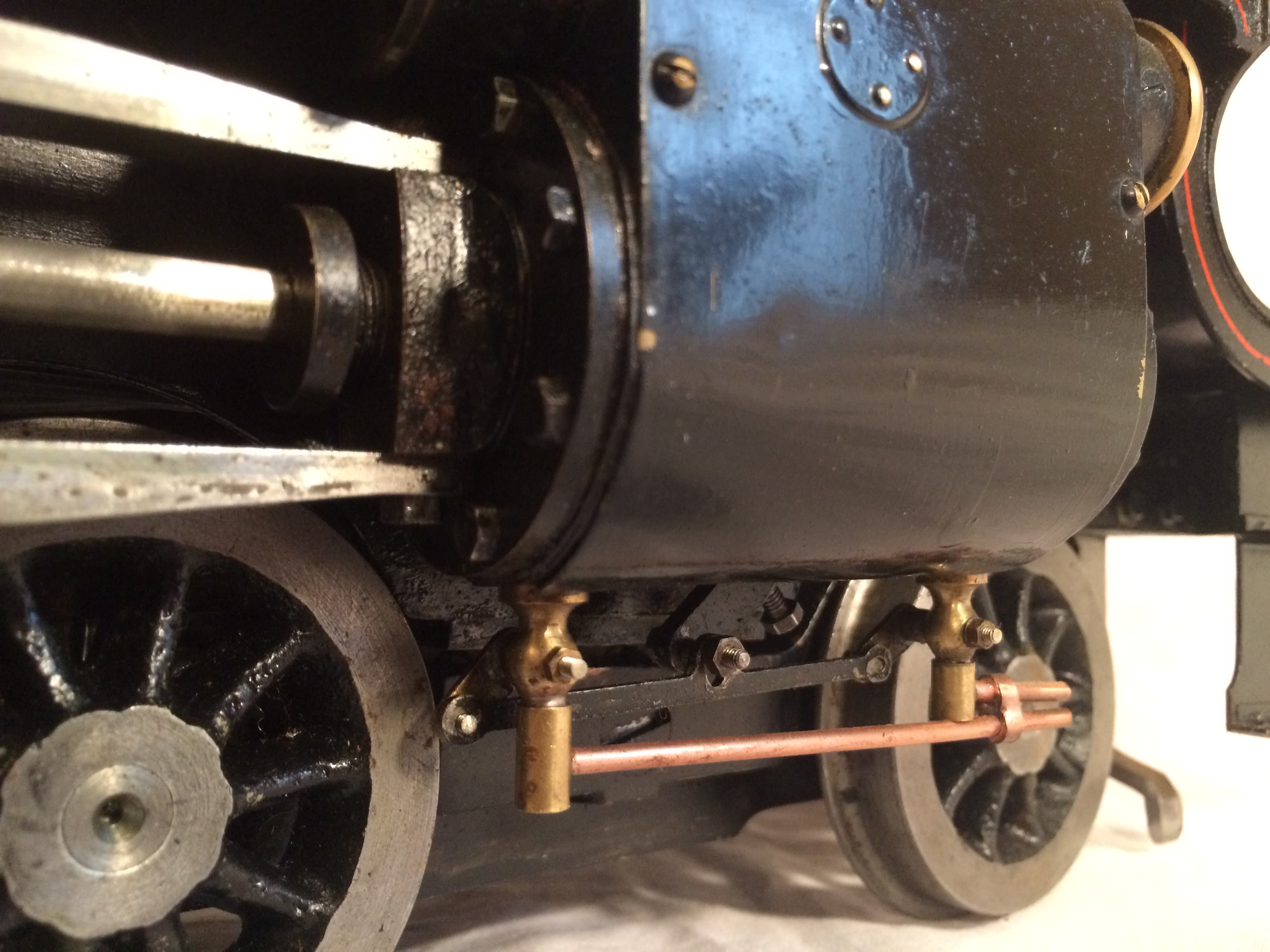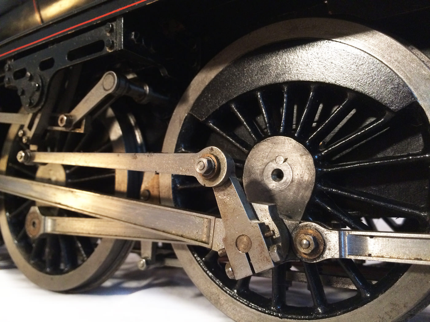 The model is fitted with all the usual refinements. There are footplate operated drain cocks, An injector, mechanical hand pump, and eccentric axle pump with bypas. Lubrication is mechanical and hidden under the front footplate. The quality of machining work on the valve gear is superb, and the locomotive has virtually no slack in the motion, although is not at all tight, suggesting that it's been run in on air. It's certainly a cut above the usual Doris, and a very nicely done example of the well loved Black 5.