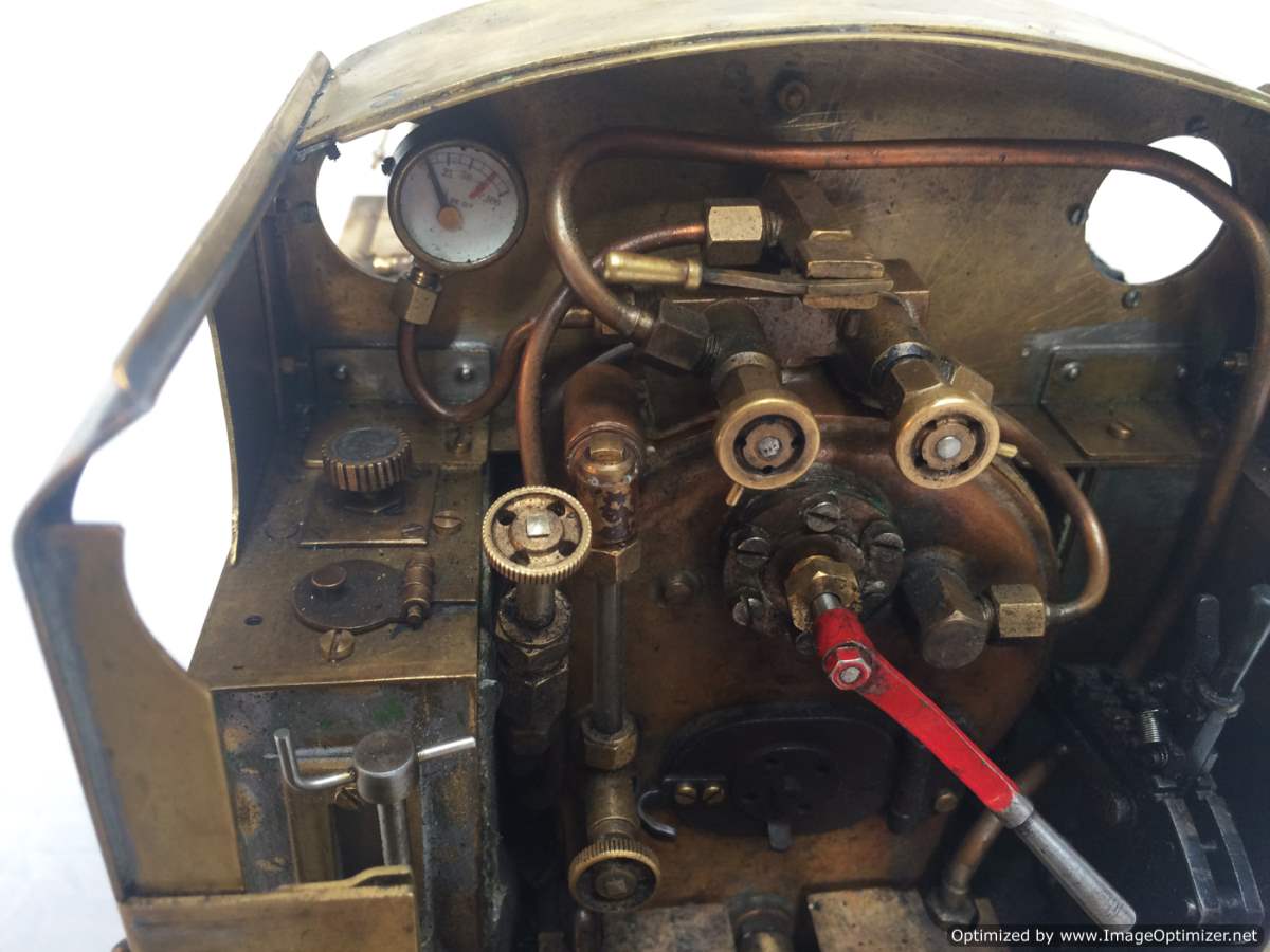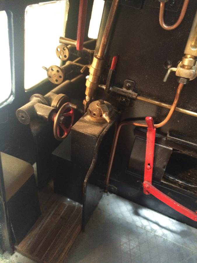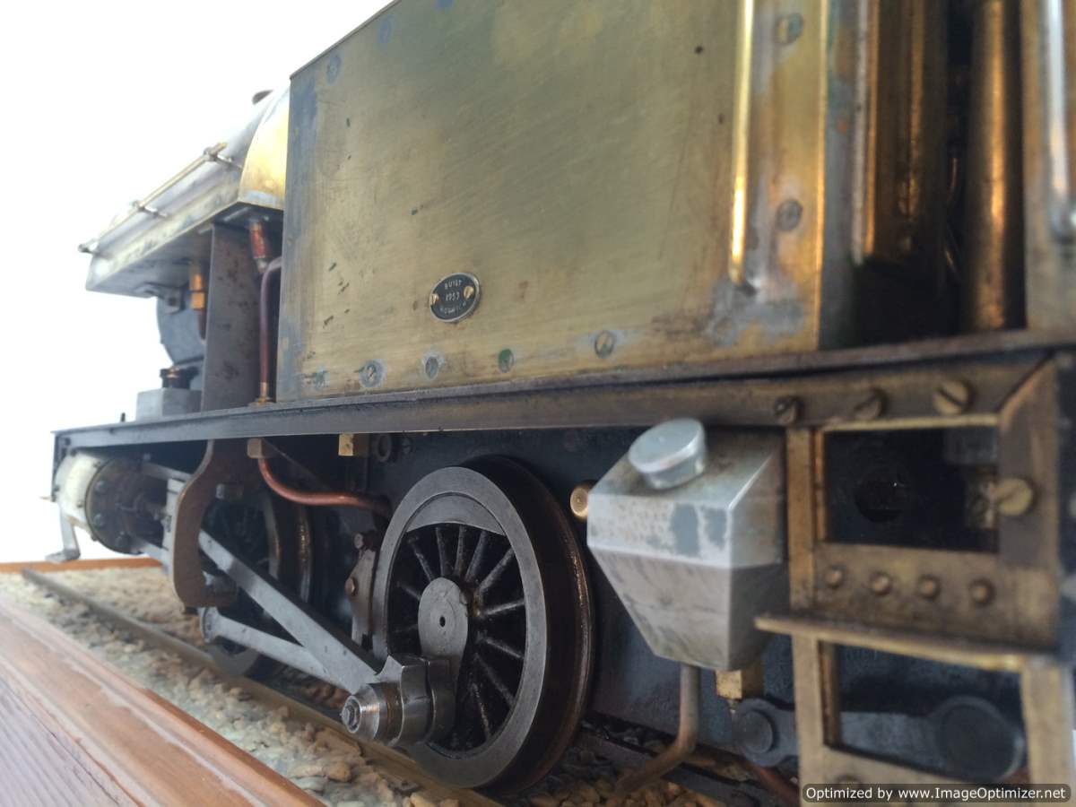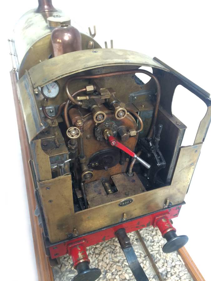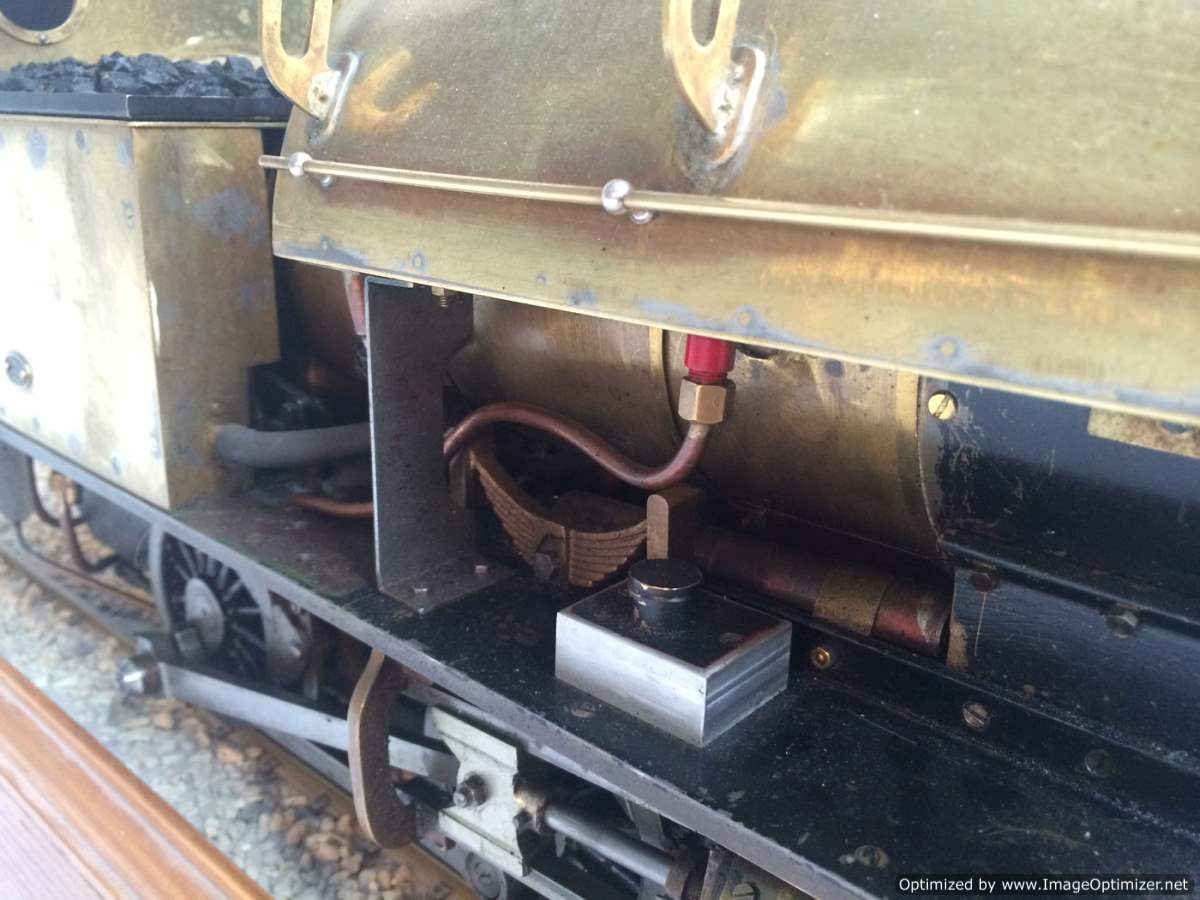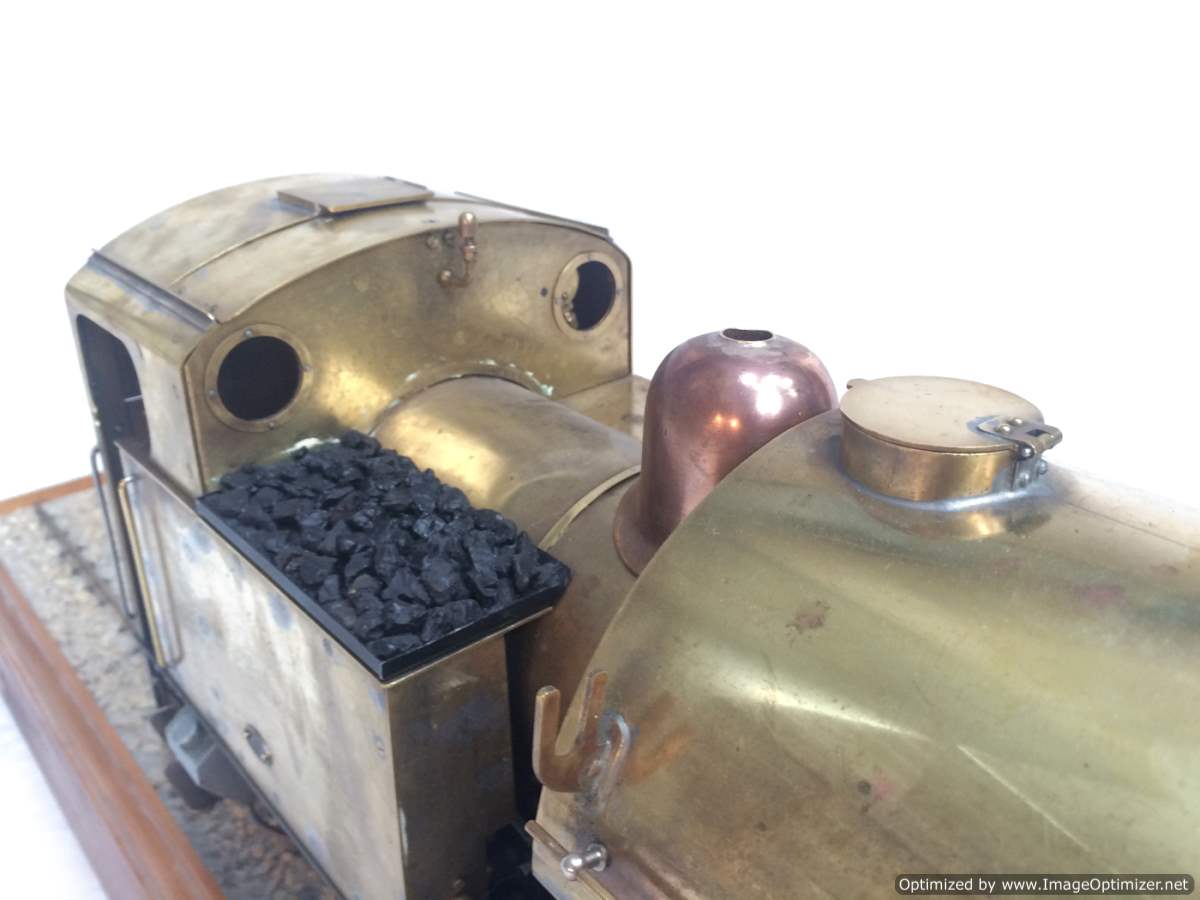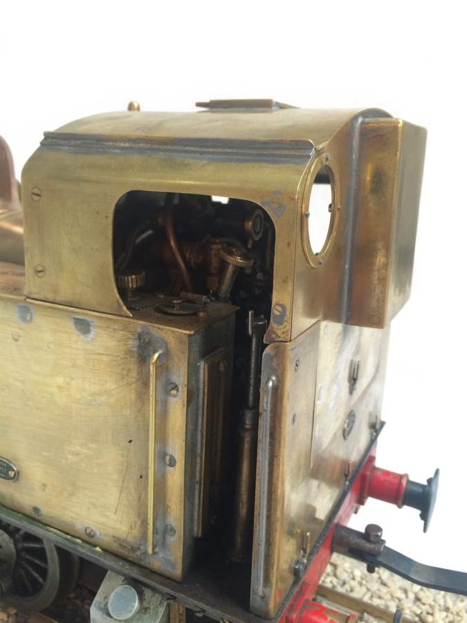 The model it's self is based upon a Juliet, the well proven LBSC design, and was a running loco with side tanks and all before it's original boiler expired.  The previous owner sourced a new boiler, and took the opportunity to make brand new body work to turn the model into something a bit more individual and prototypical than the generic Juliet.  And a very nice job you did on it too Andy!  There's an injector, and axle pump and an emergency hand pump in the tank, and lubrication is the usual mechanical job under the front running boards.  She steams very freely, runs very sweetly and has a surprising turn of speed for a little thing!  The originals were black, which would be a fairly simple job to paint up, but we just couldn't bring ourselves to do it.  Far too pretty in brass!