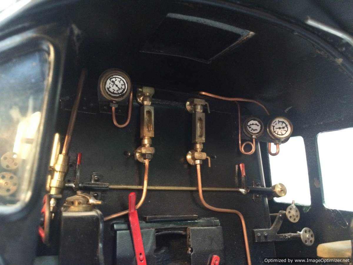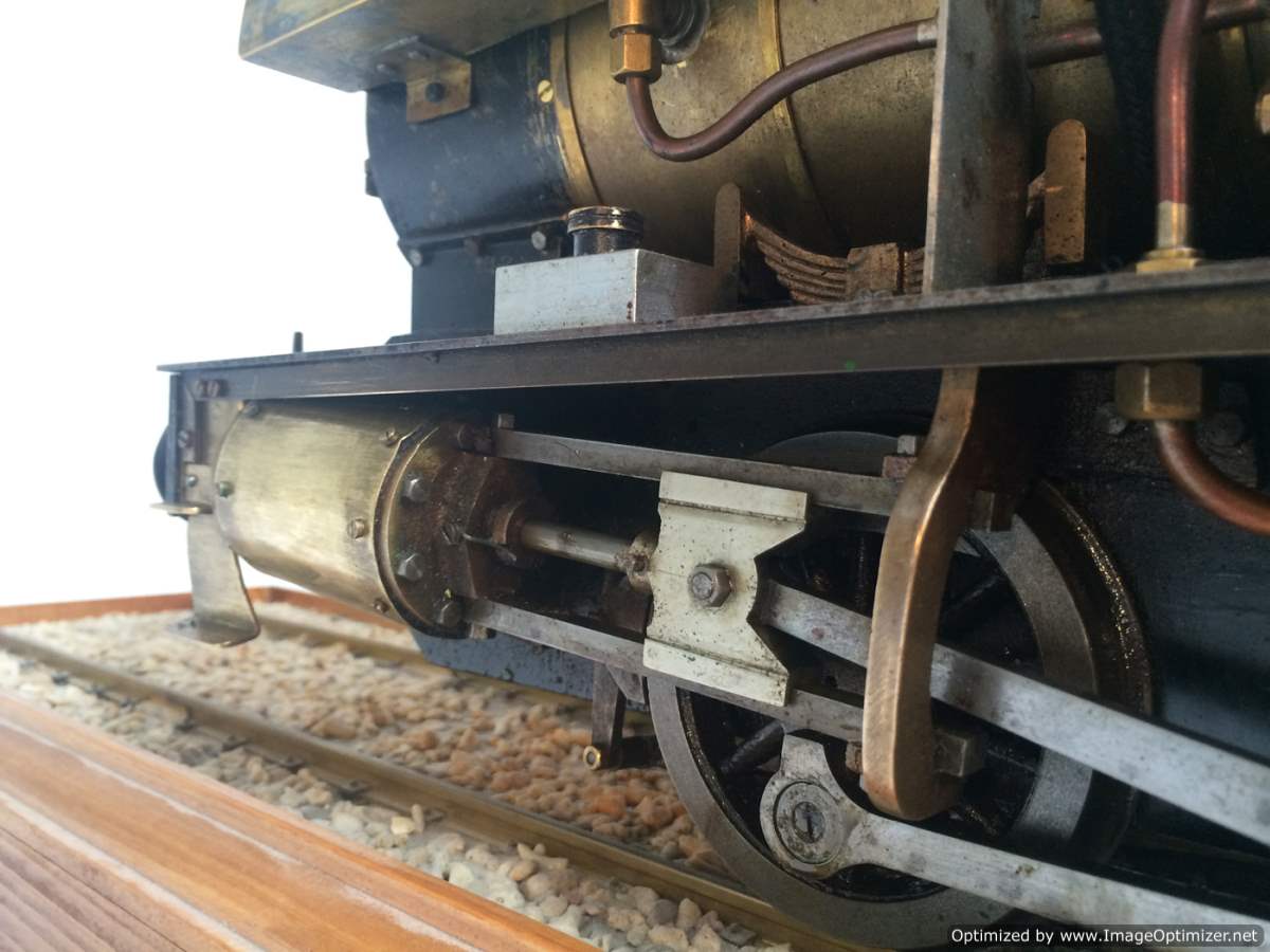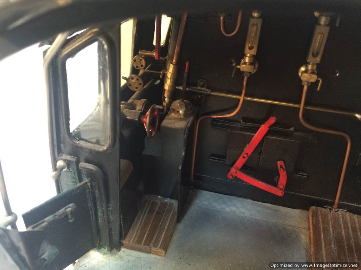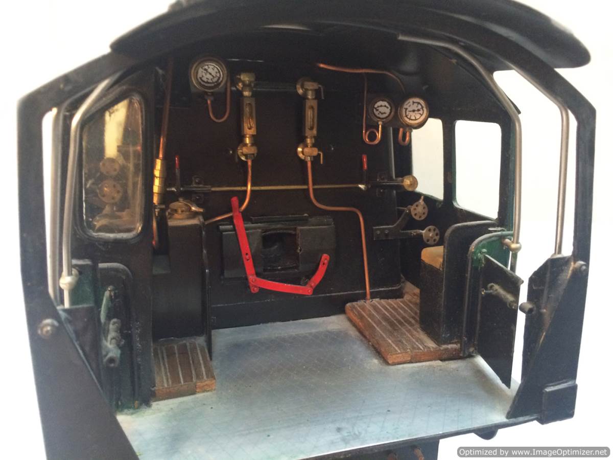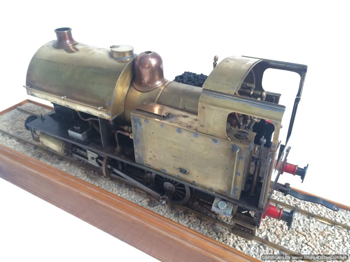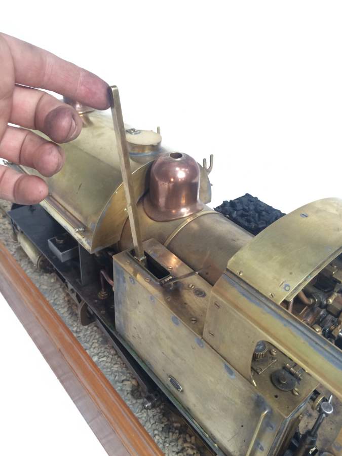The model it's self is based upon a Juliet, the well proven LBSC design, and was a running loco with side tanks and all before it's original boiler expired.  The previous owner sourced a new boiler, and took the opportunity to make brand new body work to turn the model into something a bit more individual and prototypical than the generic Juliet.  And a very nice job you did on it too Andy!  There's an injector, and axle pump and an emergency hand pump in the tank, and lubrication is the usual mechanical job under the front running boards.  She steams very freely, runs very sweetly and has a surprising turn of speed for a little thing!  The originals were black, which would be a fairly simple job to paint up, but we just couldn't bring ourselves to do it.  Far too pretty in brass!