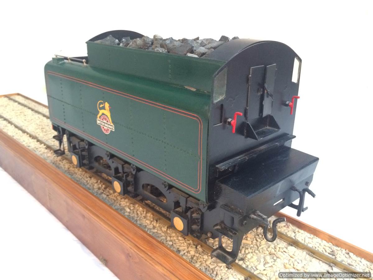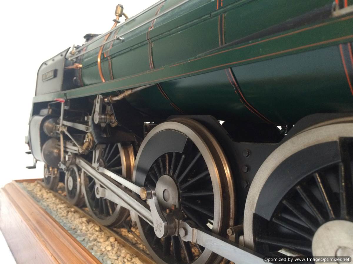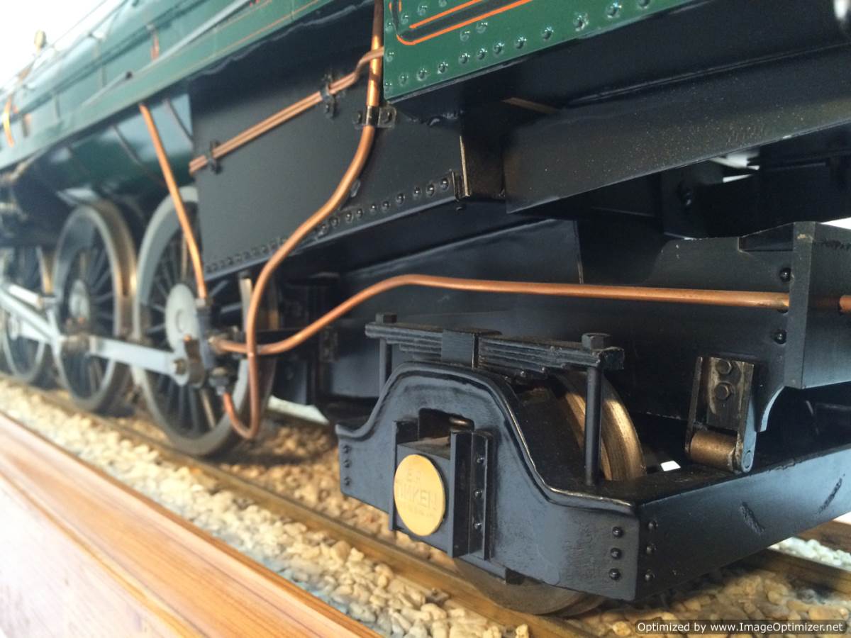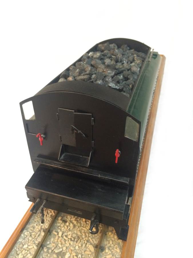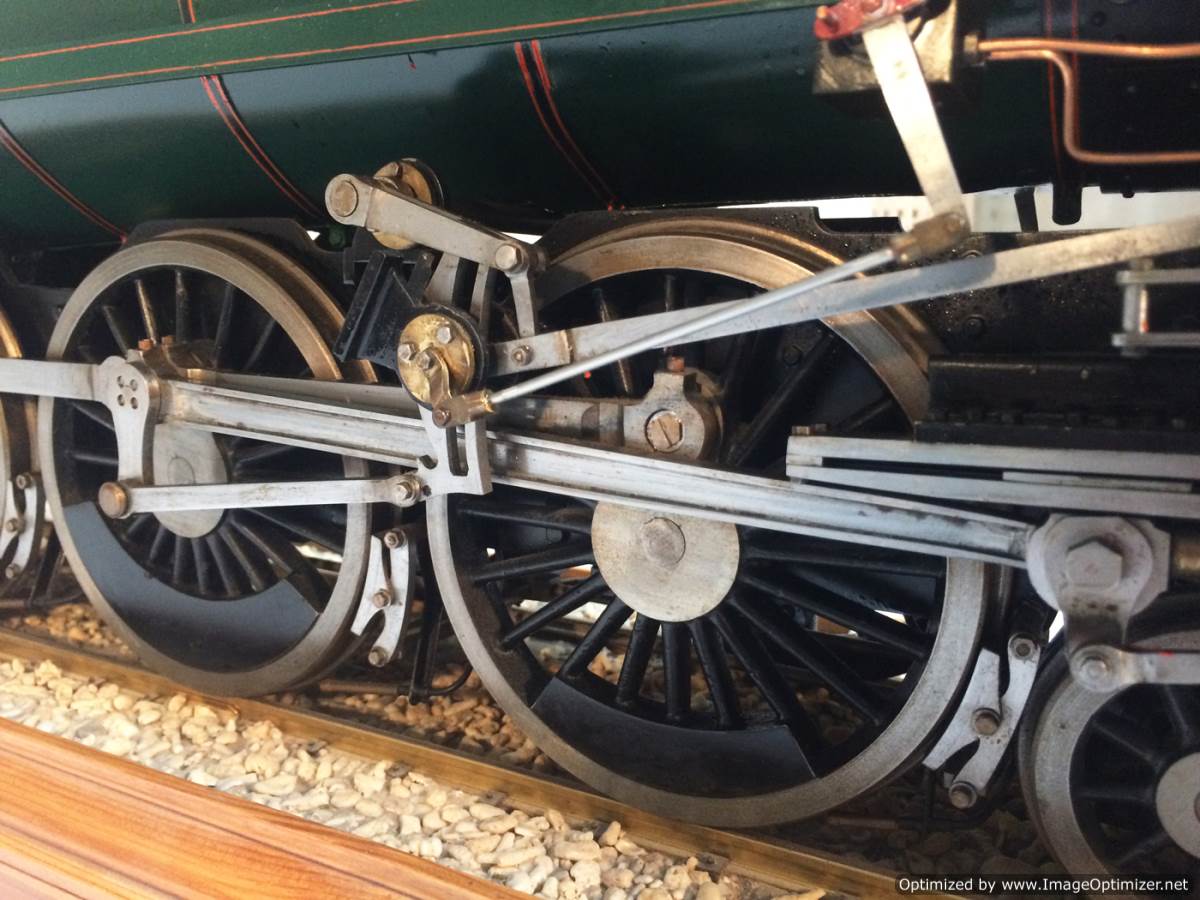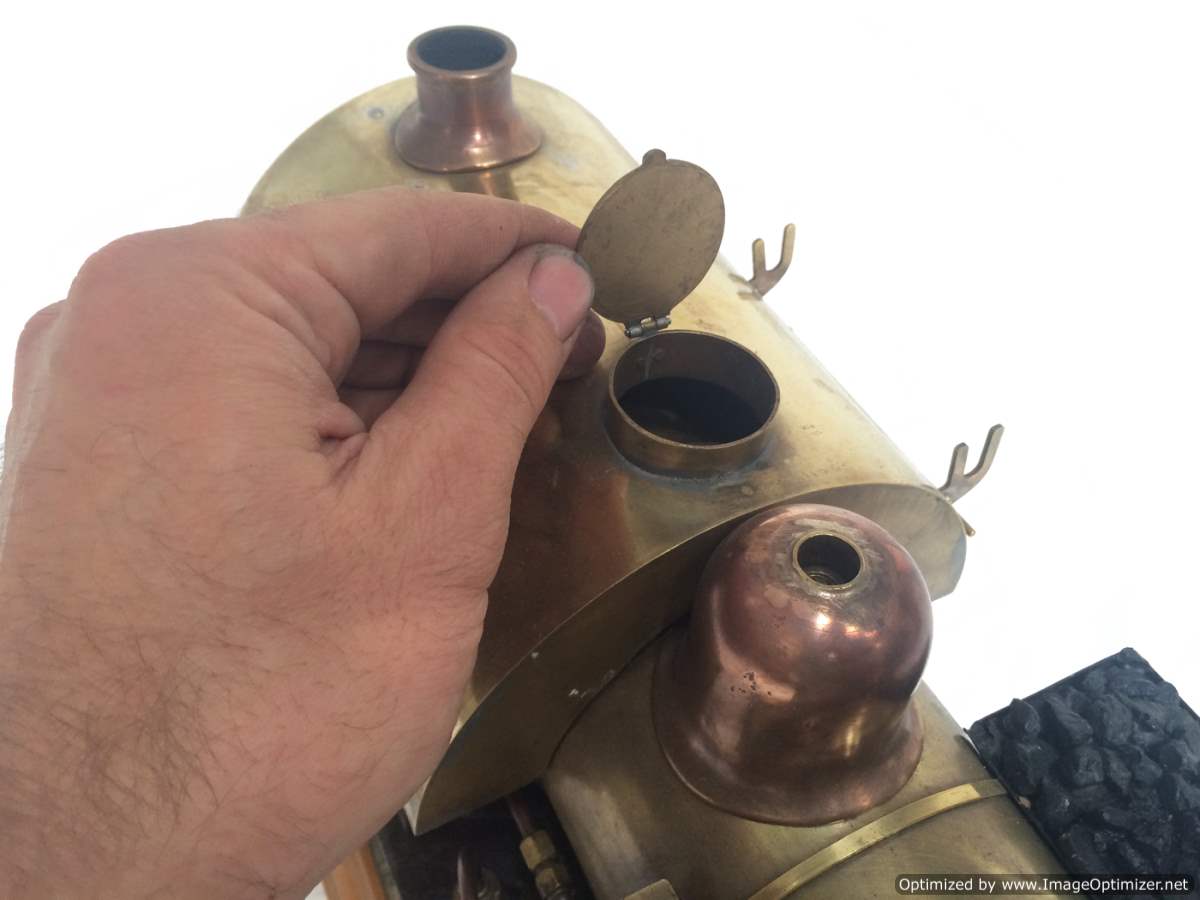 The model it's self is based upon a Juliet, the well proven LBSC design, and was a running loco with side tanks and all before it's original boiler expired.  The previous owner sourced a new boiler, and took the opportunity to make brand new body work to turn the model into something a bit more individual and prototypical than the generic Juliet.  And a very nice job you did on it too Andy!  There's an injector, and axle pump and an emergency hand pump in the tank, and lubrication is the usual mechanical job under the front running boards.  She steams very freely, runs very sweetly and has a surprising turn of speed for a little thing!  The originals were black, which would be a fairly simple job to paint up, but we just couldn't bring ourselves to do it.  Far too pretty in brass!