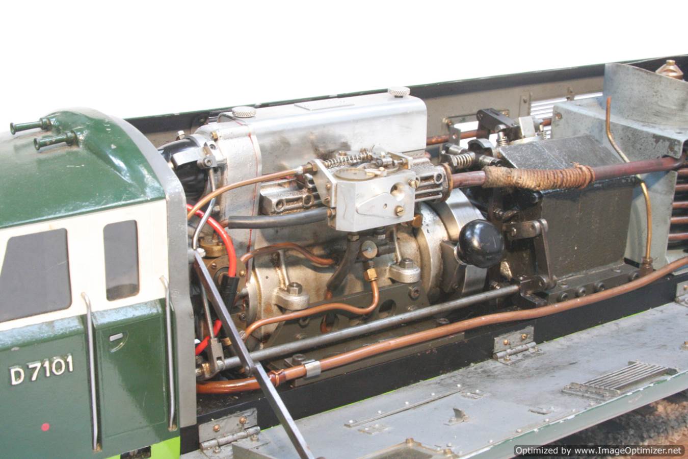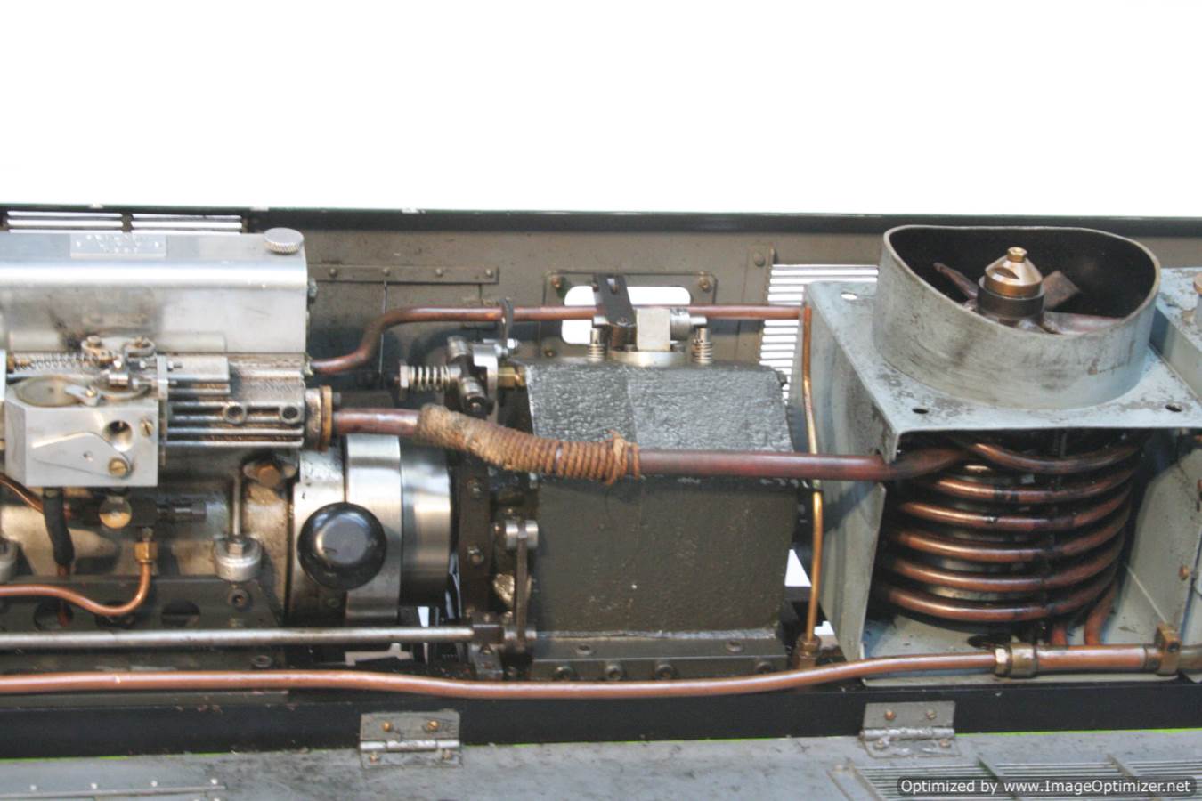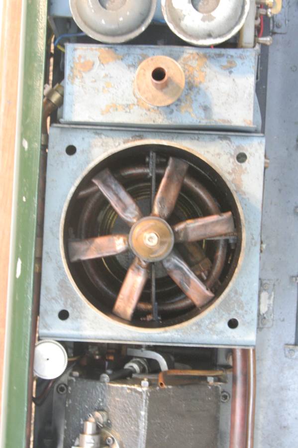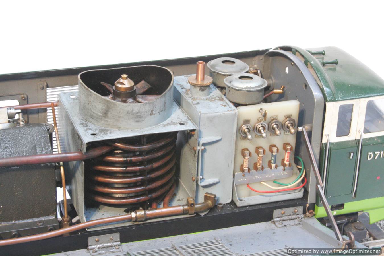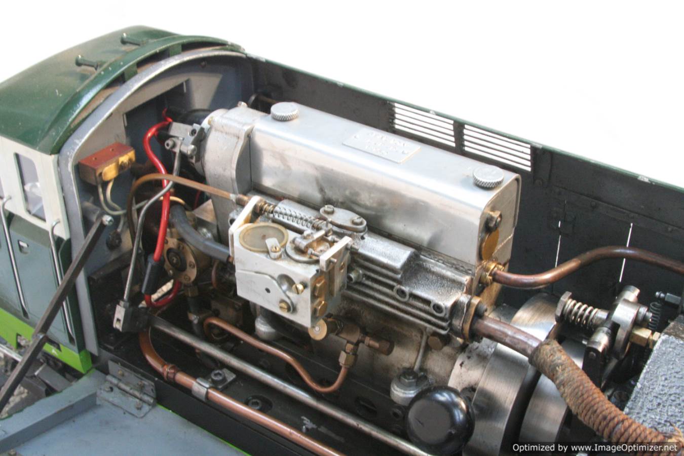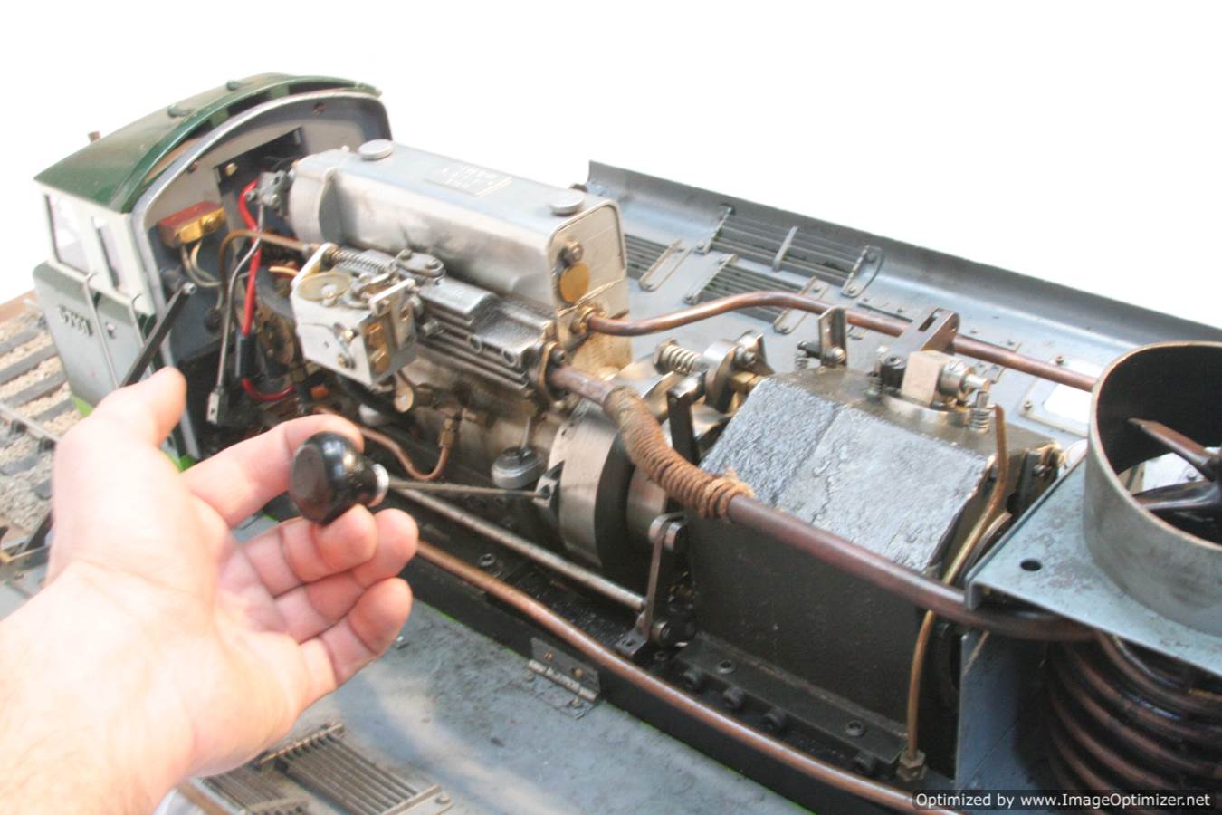 Built with a model engineer made Edgar T Westbury designed straight 4 cylinder 'Sealion' engine, this is a very well thought out and neatly packaged model. The model is powered by a pull start, whereupon the revs are then controlled by one of the handles protruding at the 'driver's' end of the model. The forward and reverse gearbox, controlled through a clutch is in the middle, transferring drive to both bogies and all wheels. The exhaust is fed into the blades of the cooling fan, and released through the tips of the blades, forcing it to spin. The cooling air is then pulled over a coiled water tube in a drum to keep things the right temperature. Water is balanced with a header tank as you might expect.