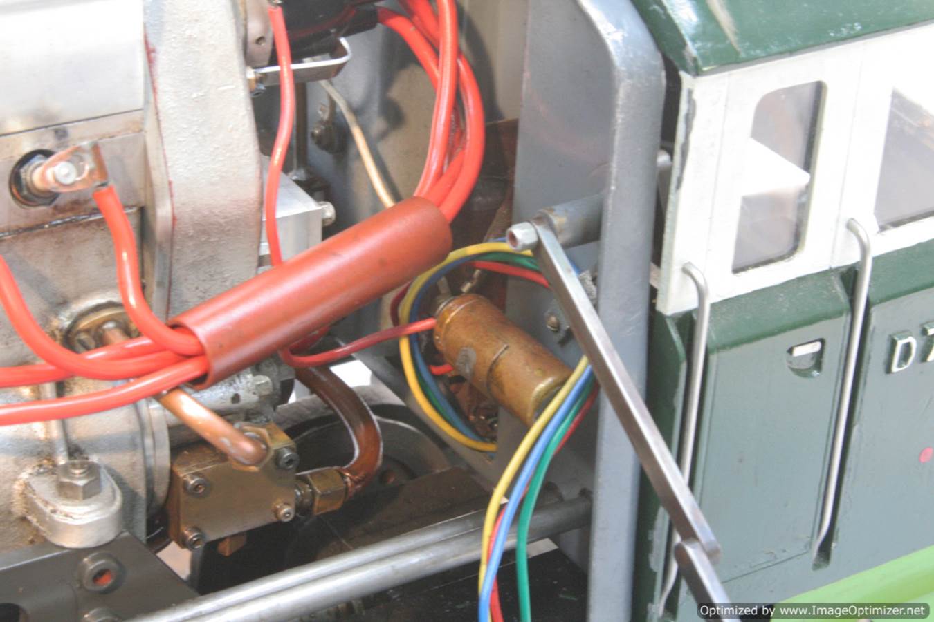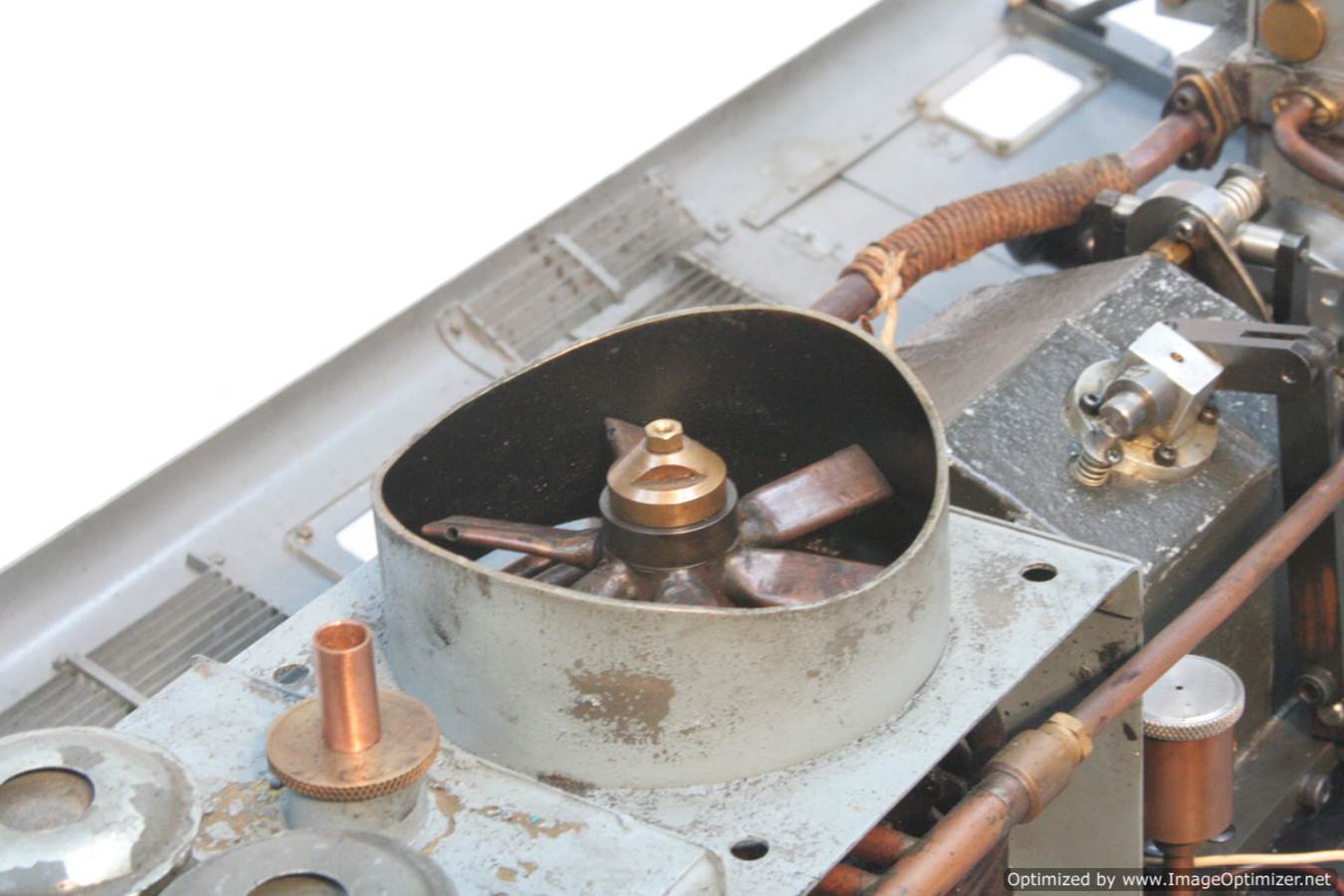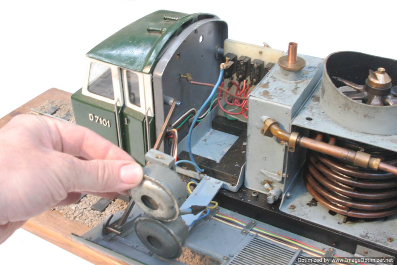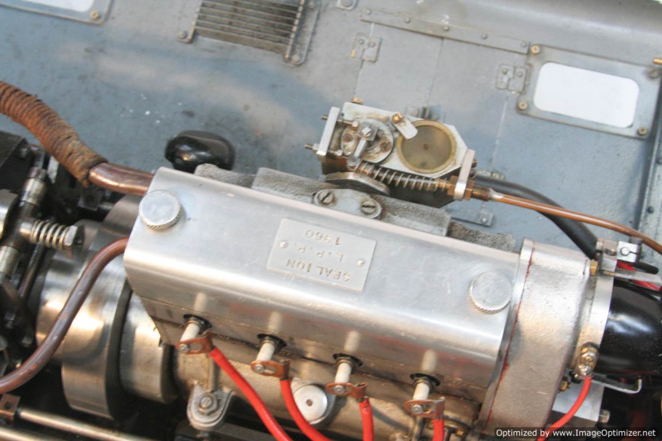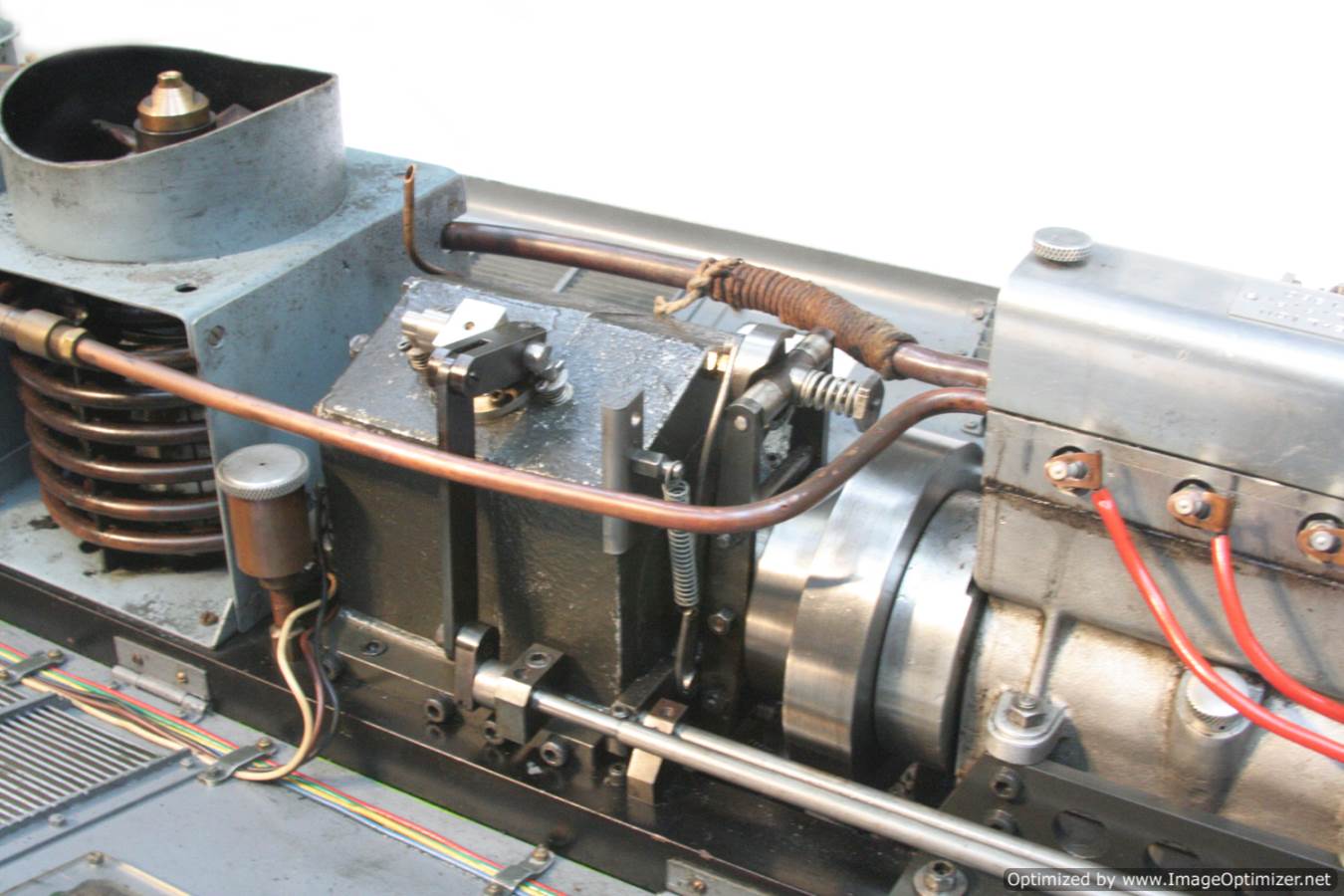 Built with a model engineer made Edgar T Westbury designed straight 4 cylinder 'Sealion' engine, this is a very well thought out and neatly packaged model. The model is powered by a pull start, whereupon the revs are then controlled by one of the handles protruding at the 'driver's' end of the model. The forward and reverse gearbox, controlled through a clutch is in the middle, transferring drive to both bogies and all wheels. The exhaust is fed into the blades of the cooling fan, and released through the tips of the blades, forcing it to spin. The cooling air is then pulled over a coiled water tube in a drum to keep things the right temperature. Water is balanced with a header tank as you might expect.