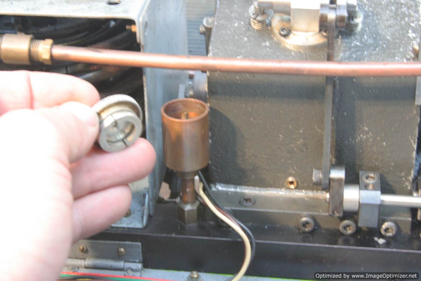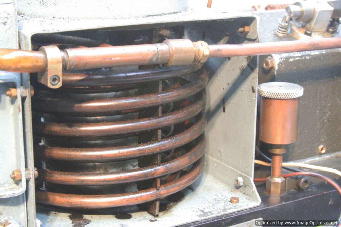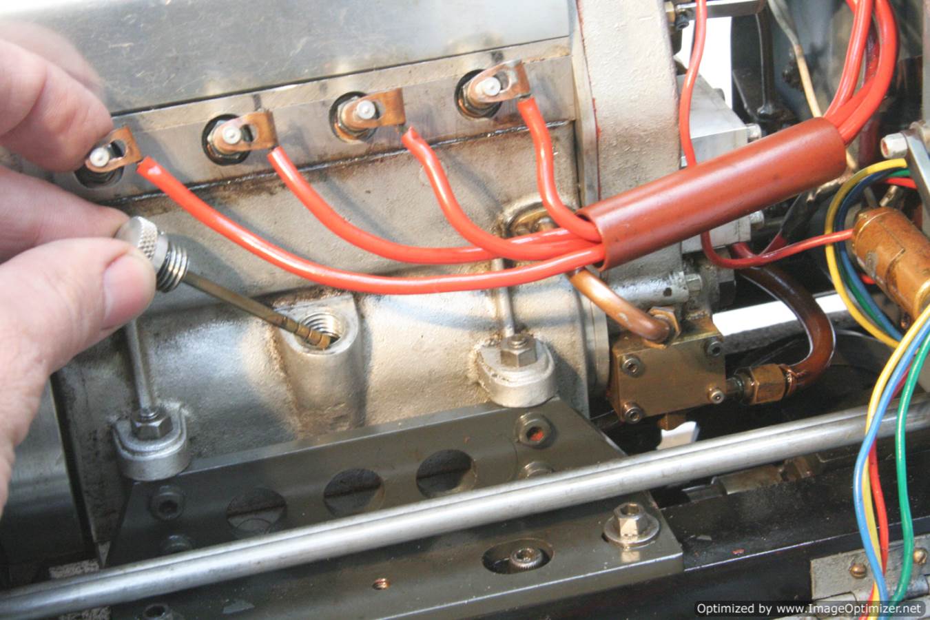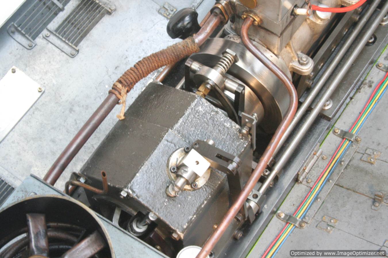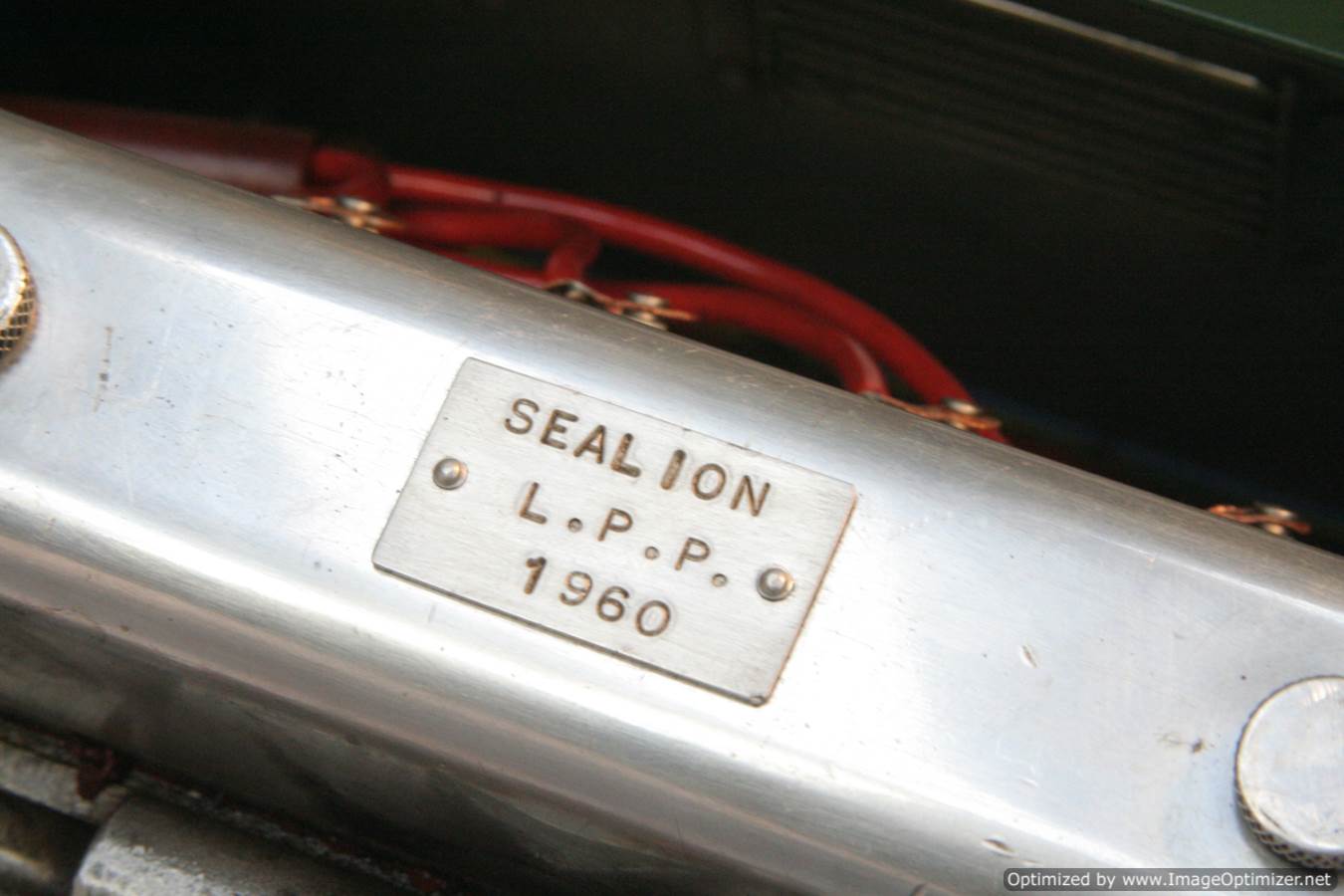 Built with a model engineer made Edgar T Westbury designed straight 4 cylinder 'Sealion' engine, this is a very well thought out and neatly packaged model. The model is powered by a pull start, whereupon the revs are then controlled by one of the handles protruding at the 'driver's' end of the model. The forward and reverse gearbox, controlled through a clutch is in the middle, transferring drive to both bogies and all wheels. The exhaust is fed into the blades of the cooling fan, and released through the tips of the blades, forcing it to spin. The cooling air is then pulled over a coiled water tube in a drum to keep things the right temperature. Water is balanced with a header tank as you might expect.