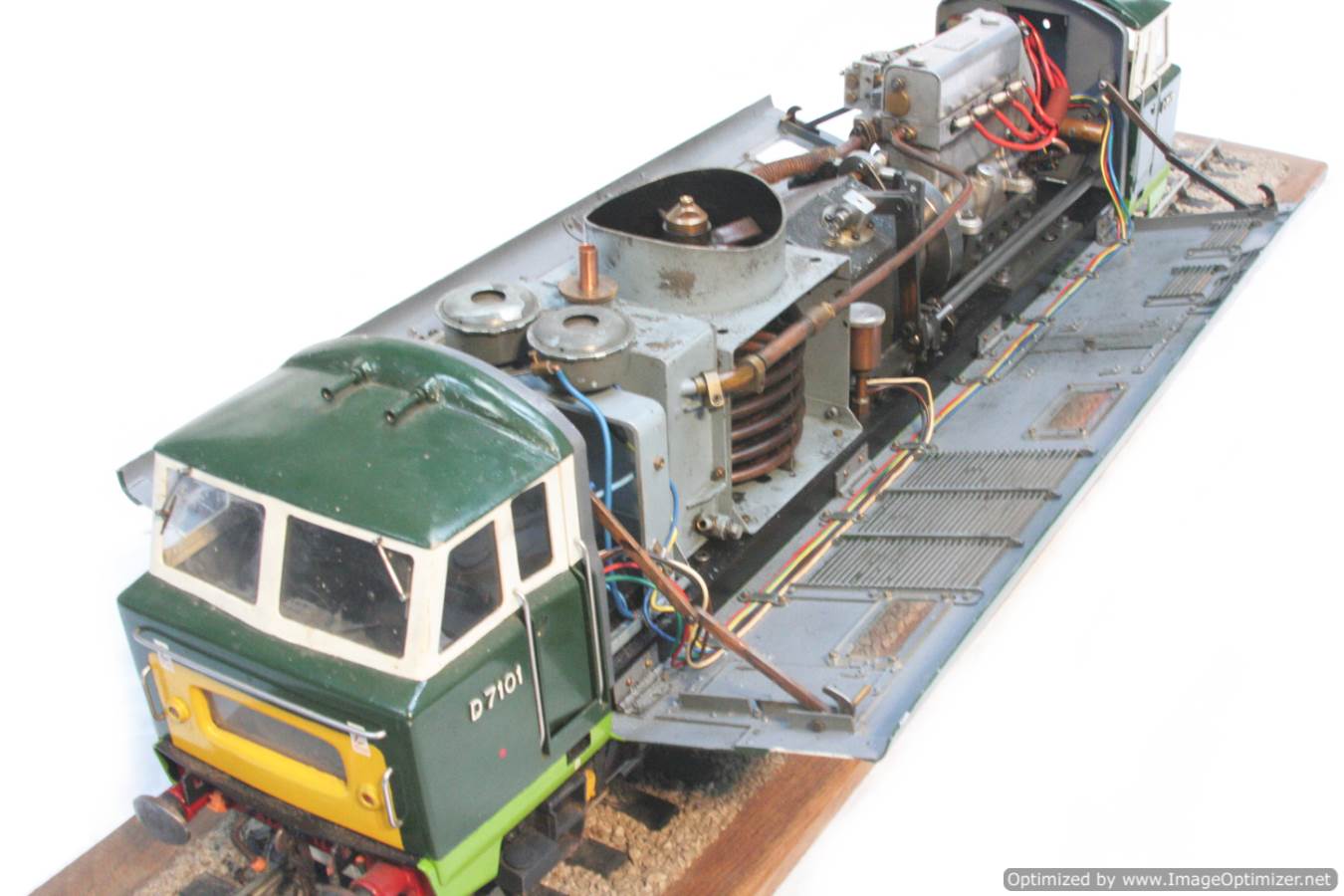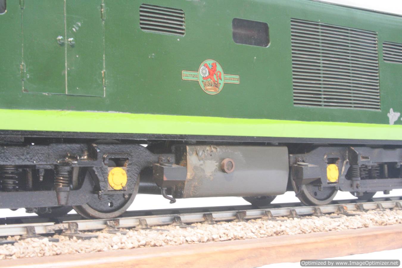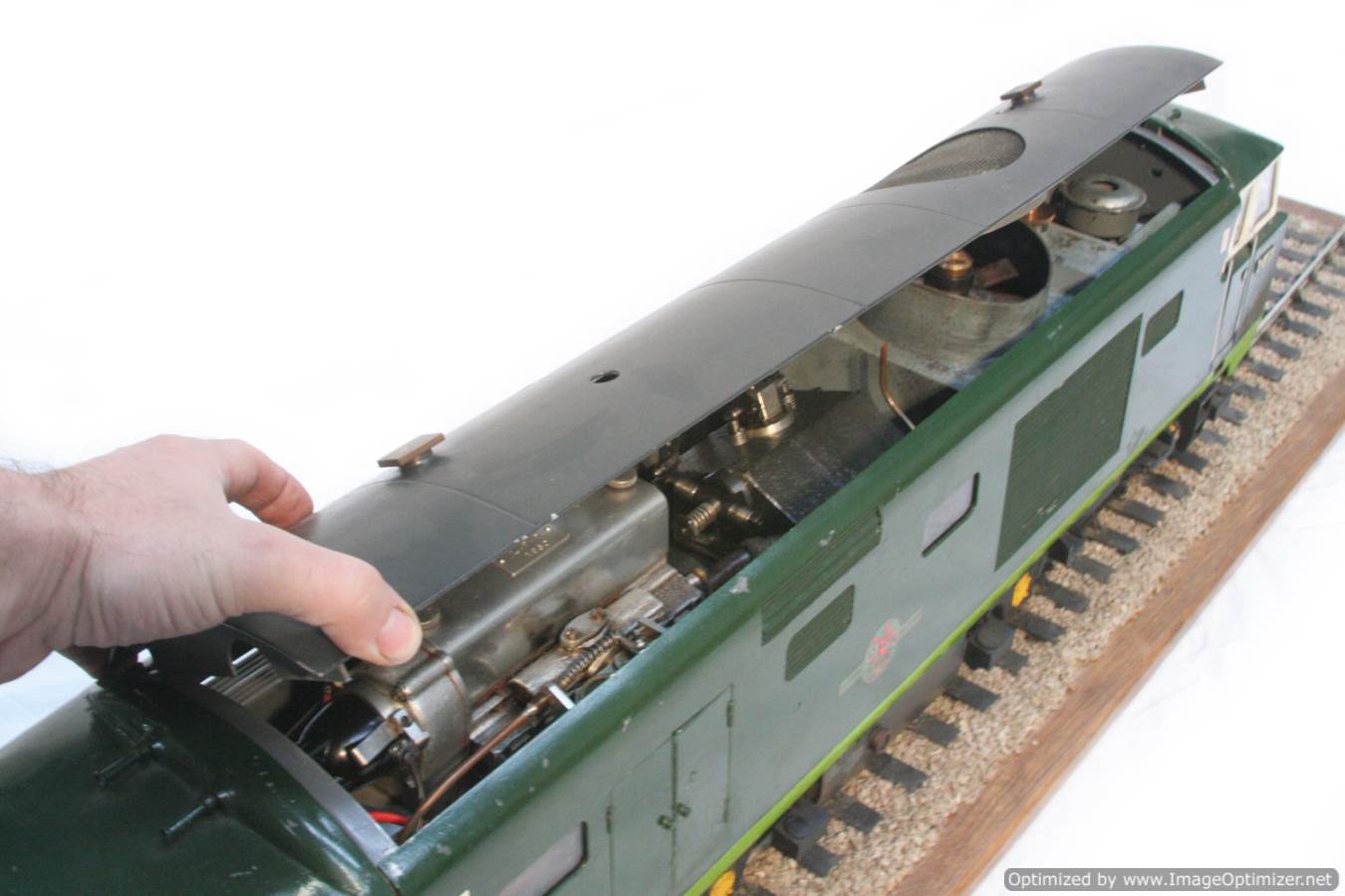 Here we have a rather special little thing. A petrol engined, full mechanical drive 3 1/2" gauge BR Class 35 Hymek! For some inexplicable reason, diesels are rare in 3 1/2" gauge for a start, but a well detailed, 'real' engined loco is rare as hen's teeth!