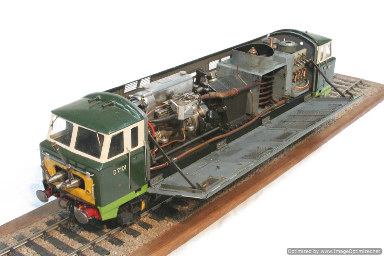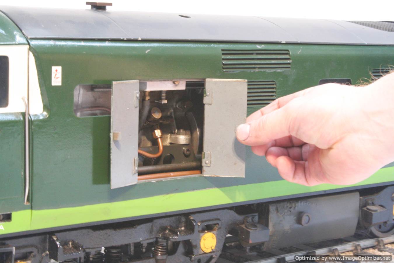 As you can see in the photos, both sides of the metal body are designed to drop away, giving superb access to the internals. All the lights work, as does the front number code panel, the horn,.... even the cab doors open to reveal convincing cab detail.