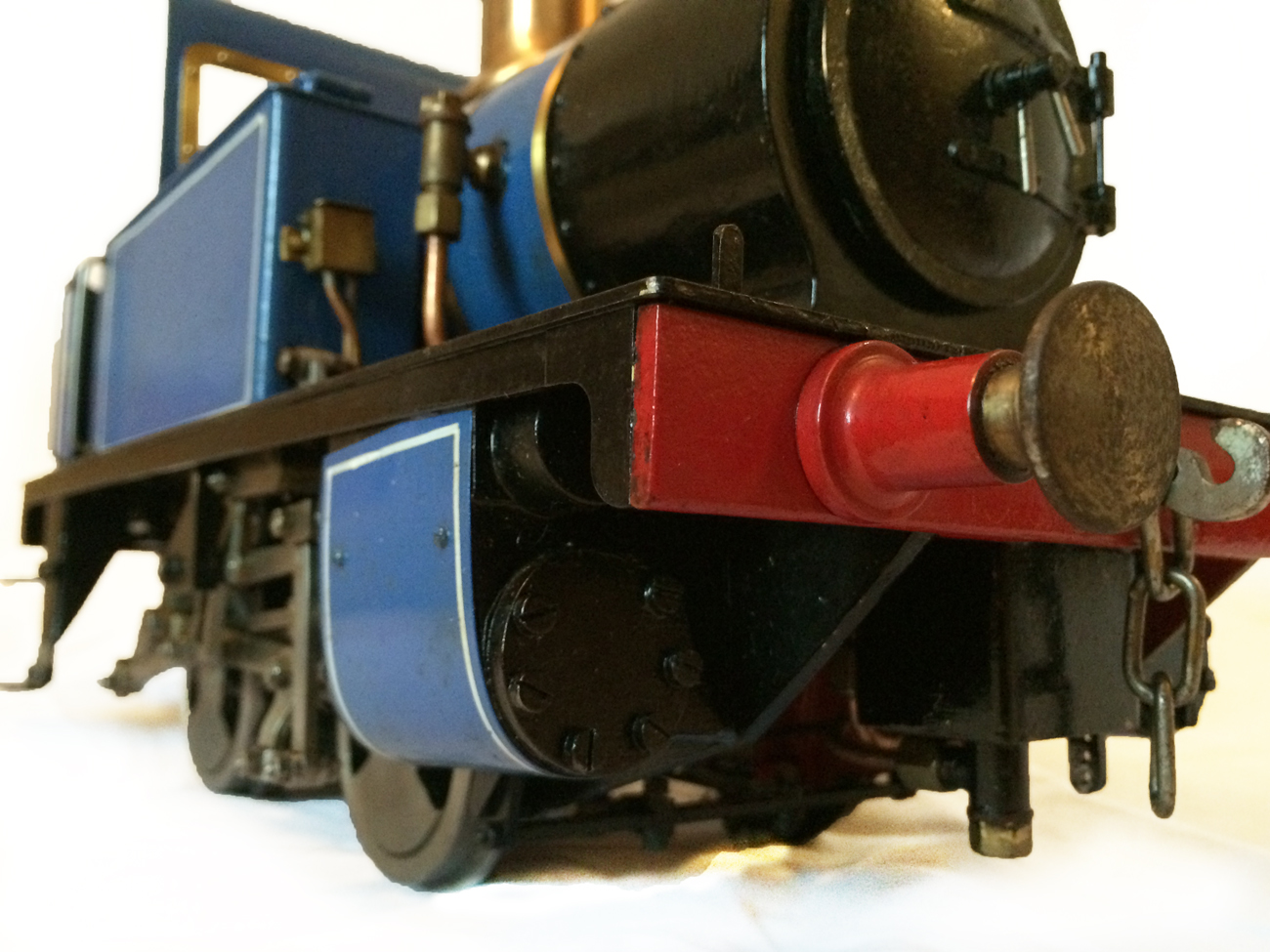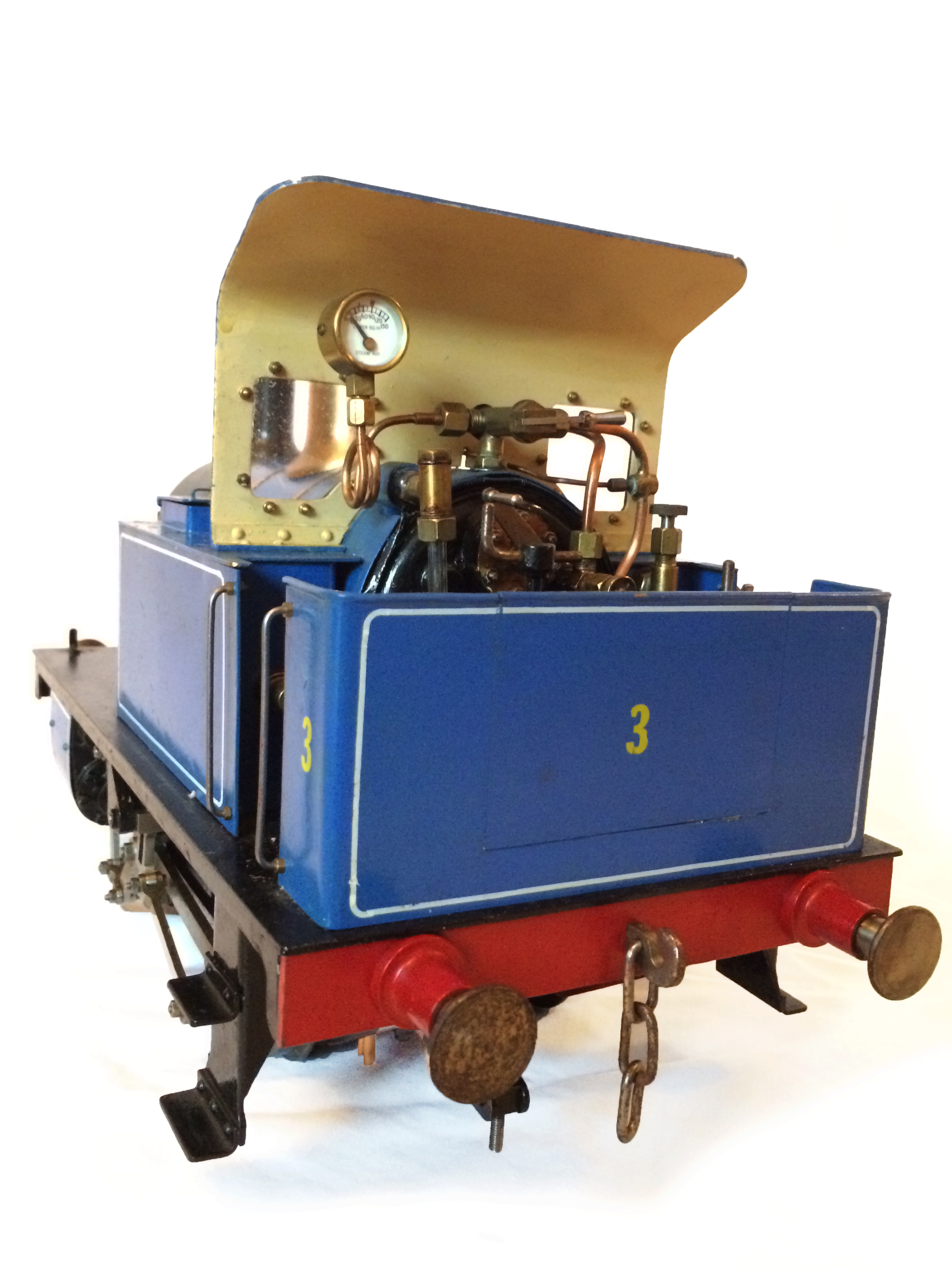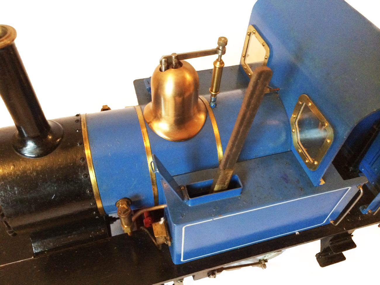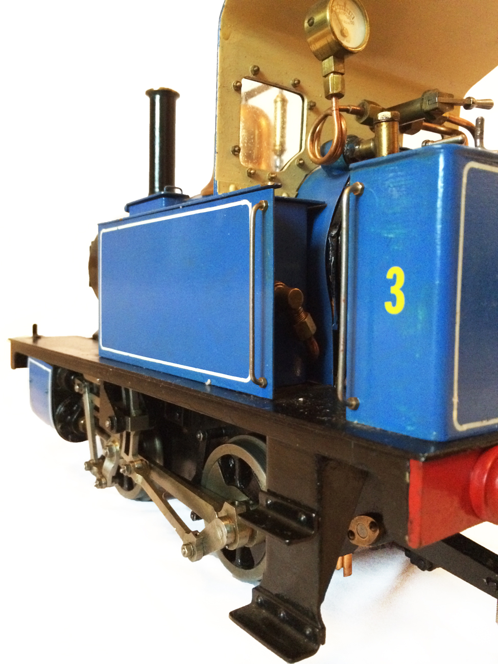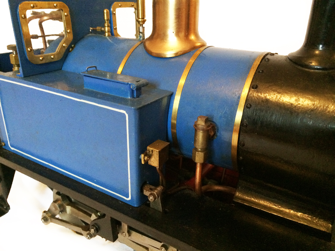 It's a really nicely built model, where the builder has taken his time to make a very neat crisp job. It has been sitting as a display model for some time since completion, and the paintwork has suffered a little, becoming slightly mottled. It runs really well on air, and has the usual axle pump boiler water feed, plus a hand pump in the left hand tank.