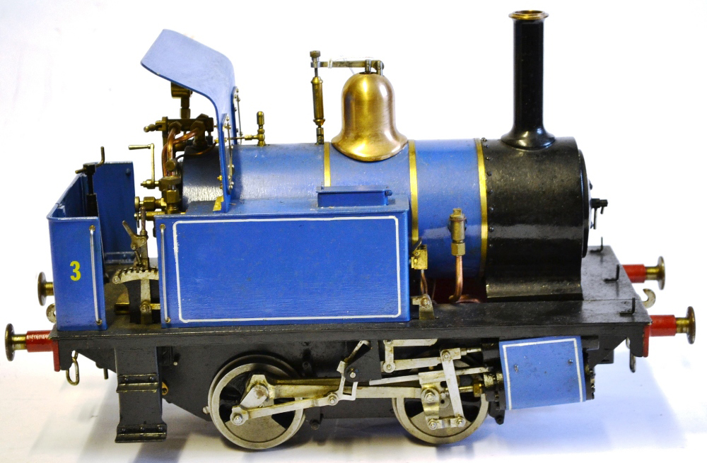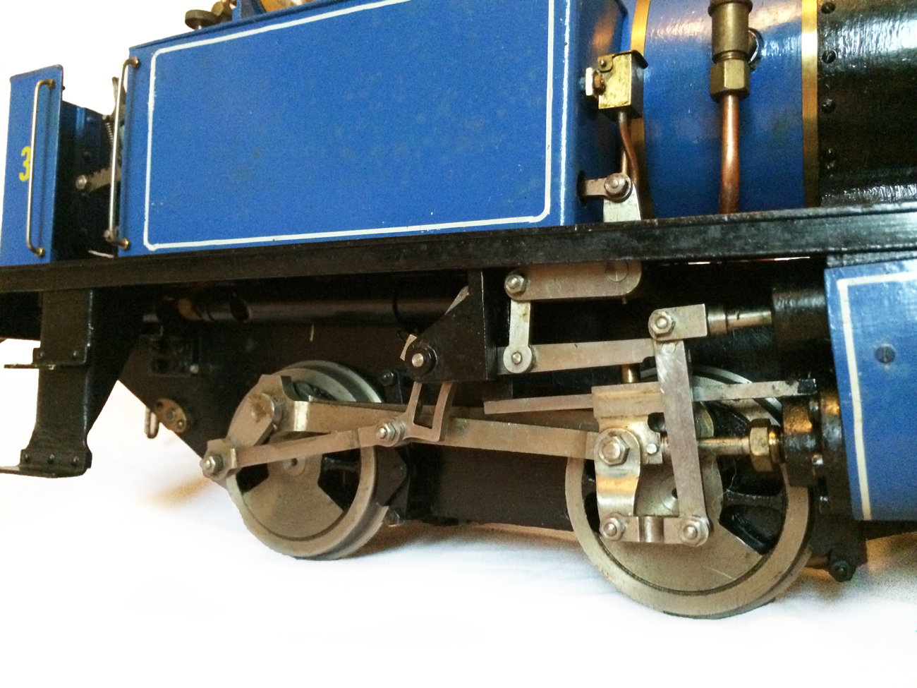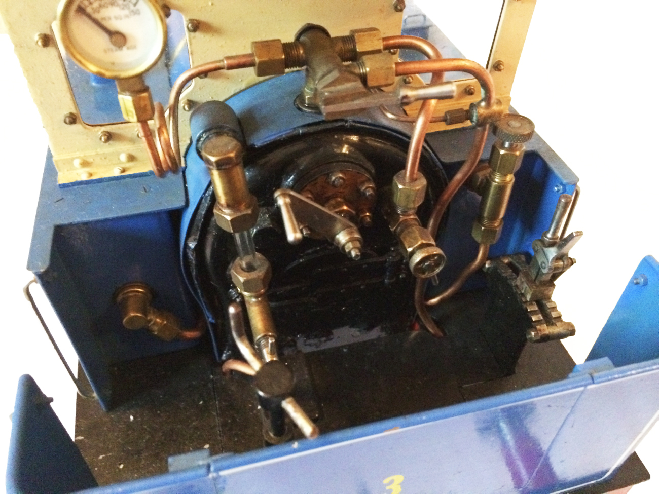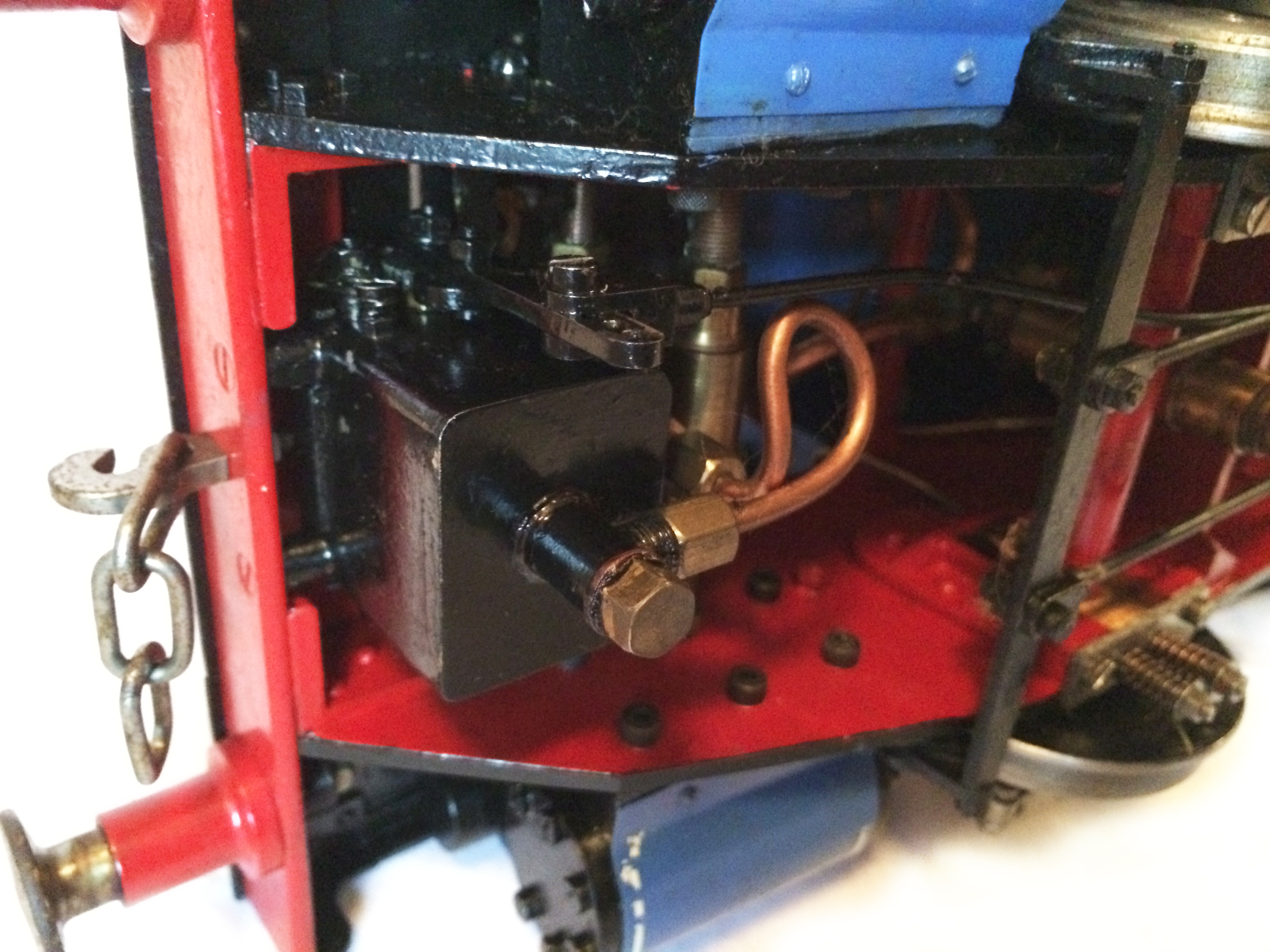 It's a really nicely built model, where the builder has taken his time to make a very neat crisp job. It has been sitting as a display model for some time since completion, and the paintwork has suffered a little, becoming slightly mottled. It runs really well on air, and has the usual axle pump boiler water feed, plus a hand pump in the left hand tank.