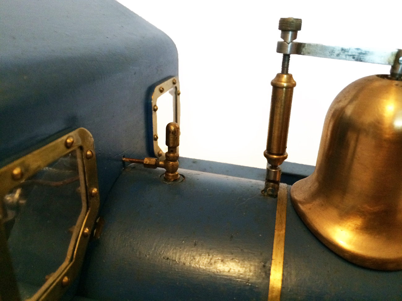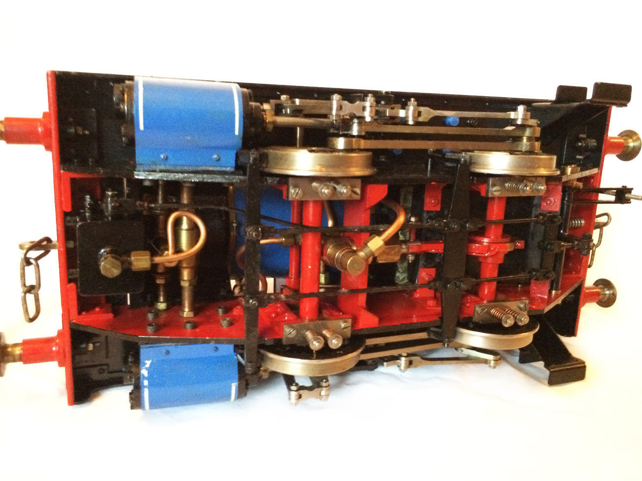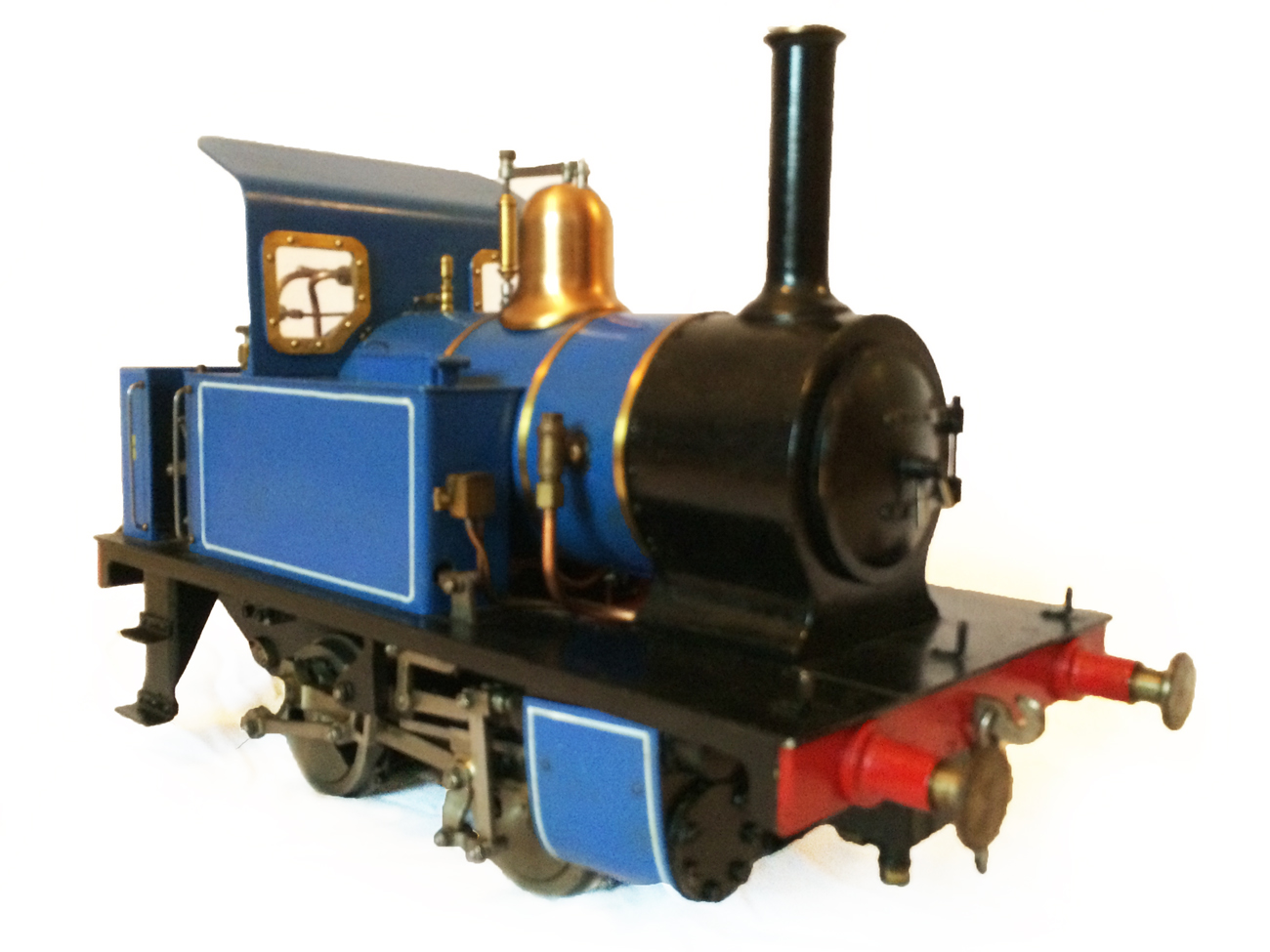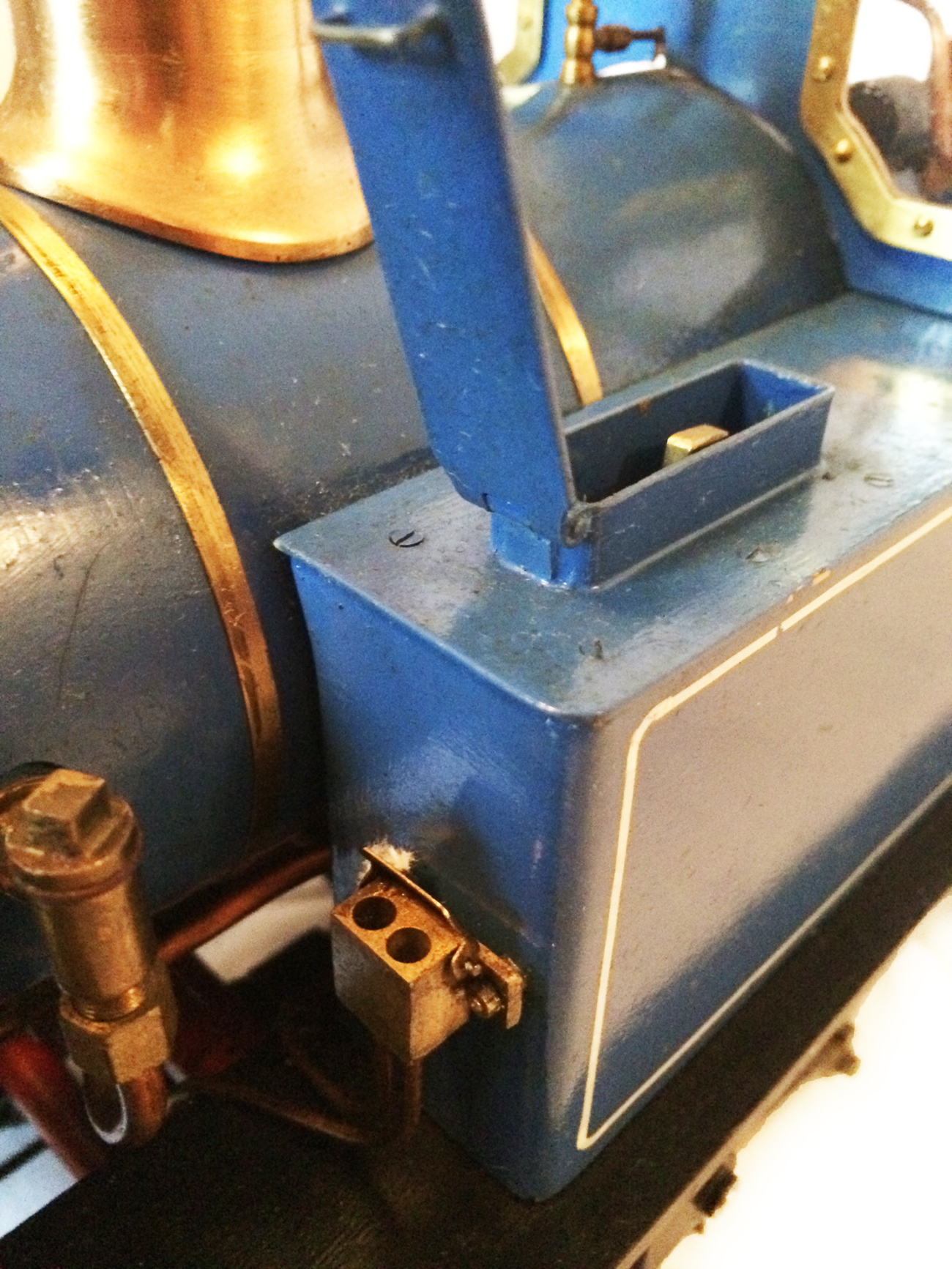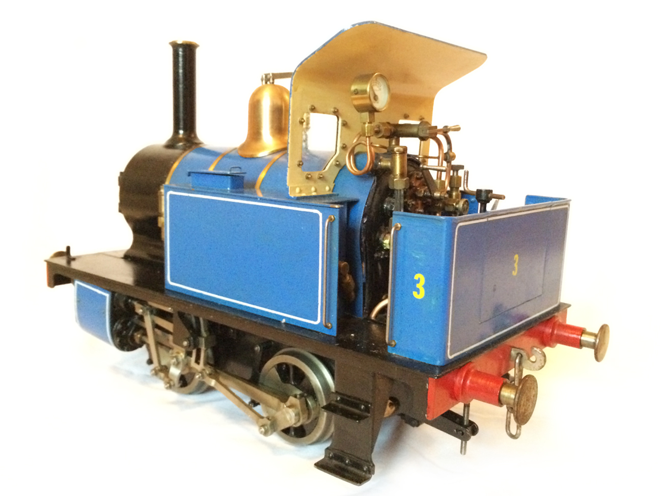 It's a really nicely built model, where the builder has taken his time to make a very neat crisp job. It has been sitting as a display model for some time since completion, and the paintwork has suffered a little, becoming slightly mottled. It runs really well on air, and has the usual axle pump boiler water feed, plus a hand pump in the left hand tank.