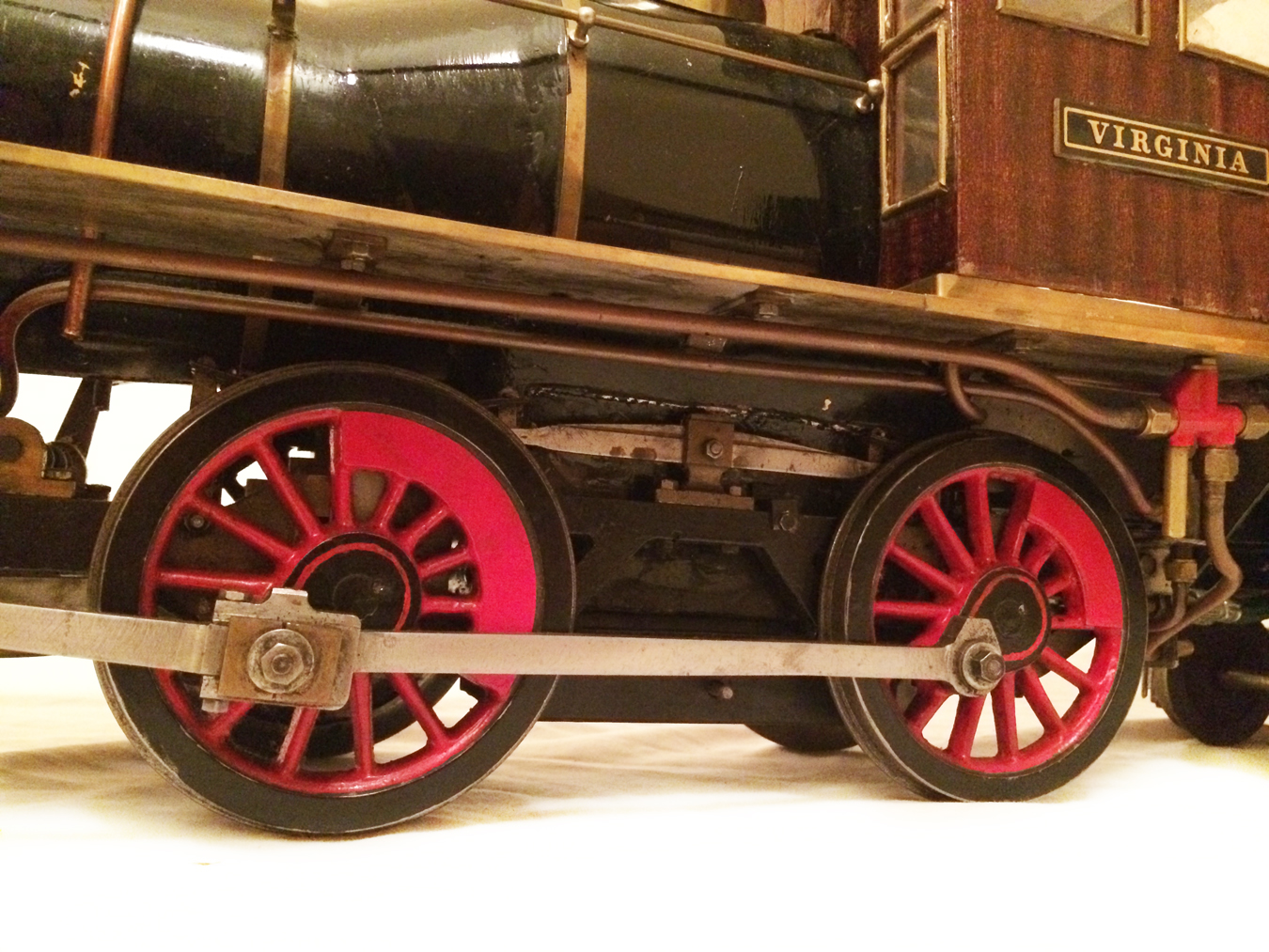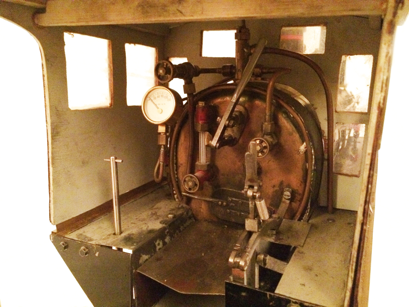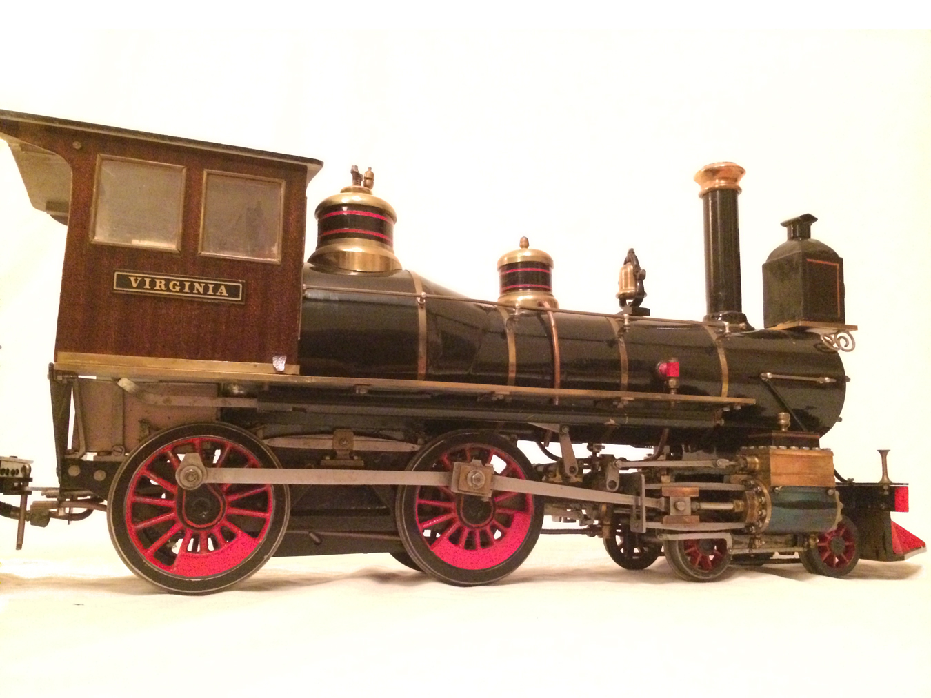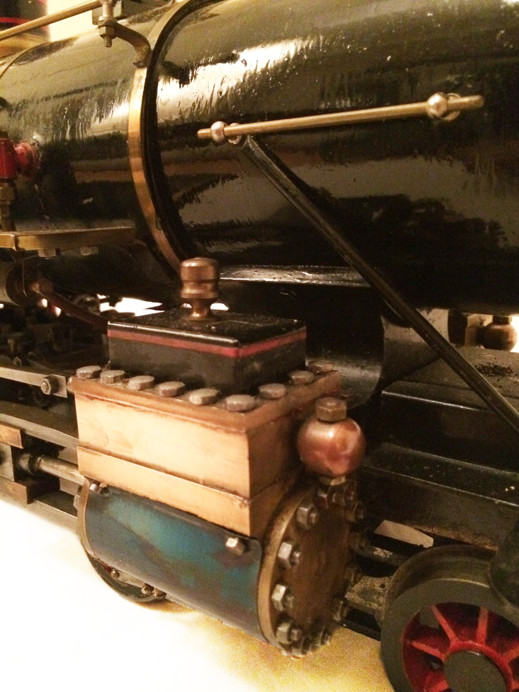 Here we have an example of the venerable LBSC Virginia 4-4-0 locomotive.  This is an older model that would benefit from a little TLC!  Its well built though, with nice detailing and it runs very nicely on air.  It sports an axle pump with footplate mounted bypass valve, and injector and a tender hand pump.  Draincocks are operated from a vertical lever on either side of the boiler just behind the cylinders, and theres a nice big mechanical lubricator feeding through a clack mounted on the front underneath the smokebox.