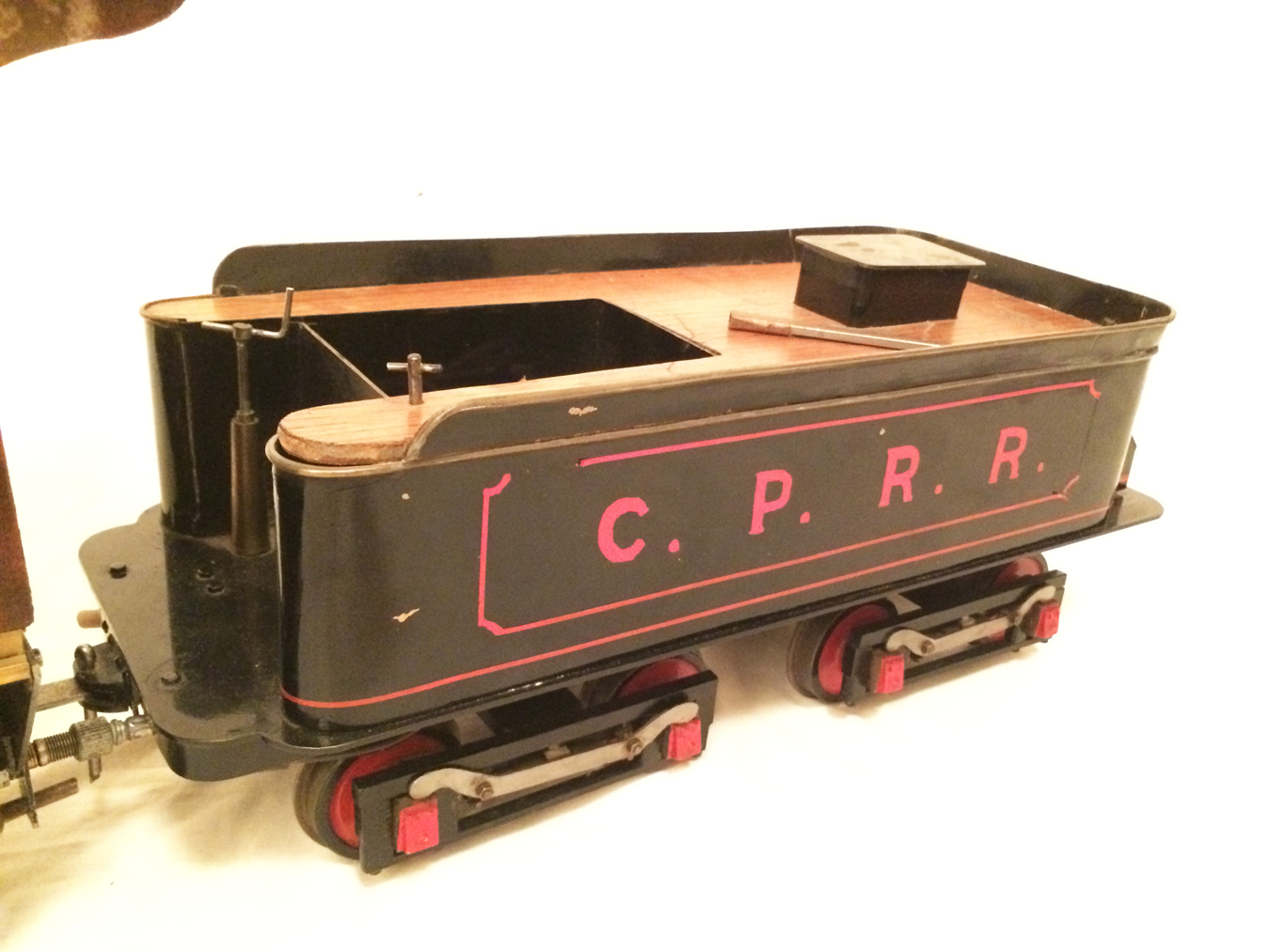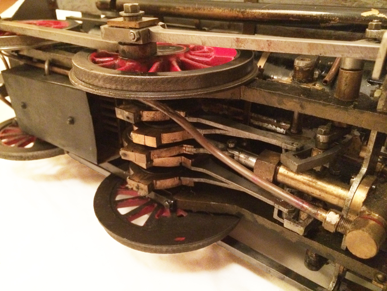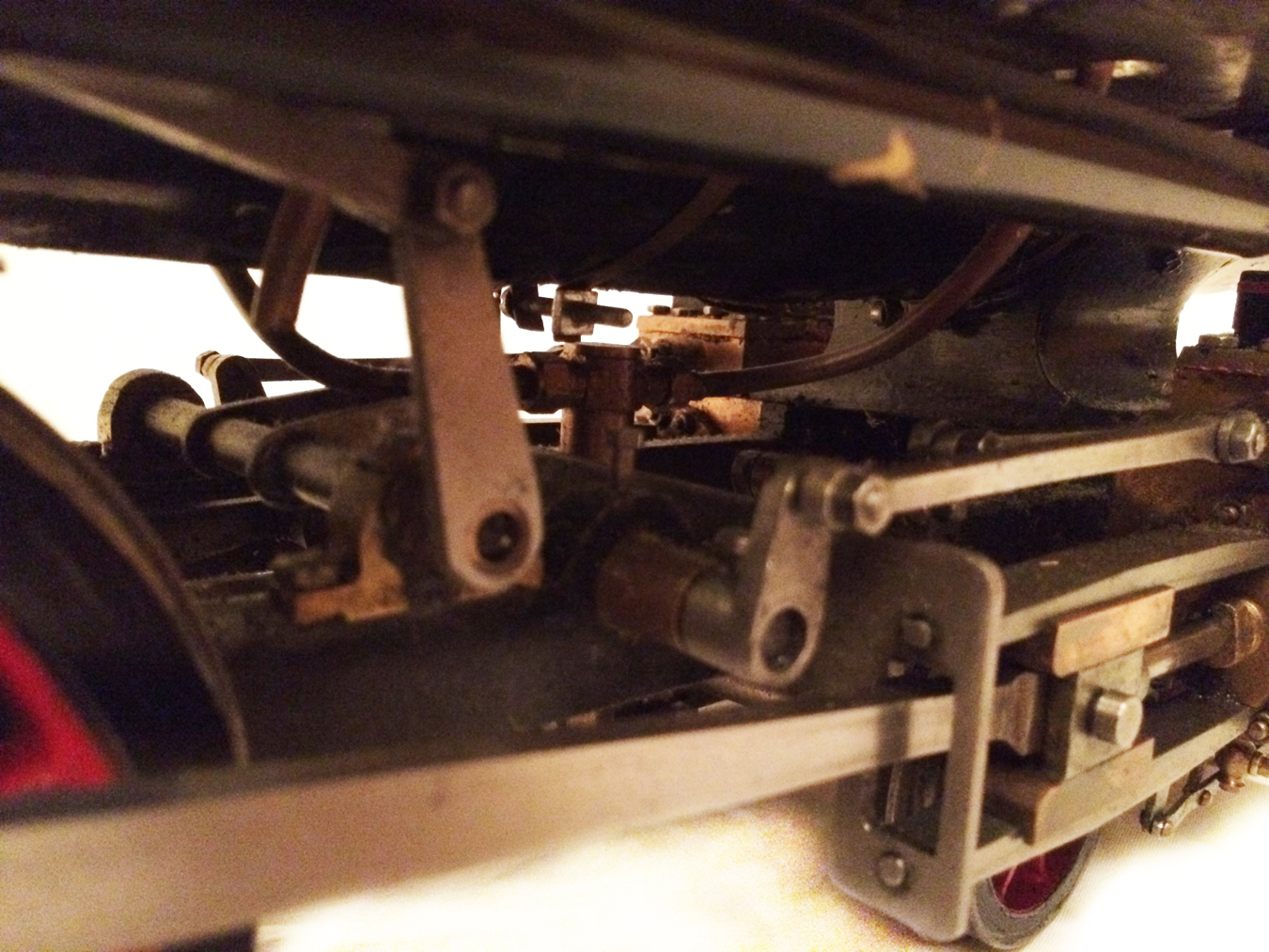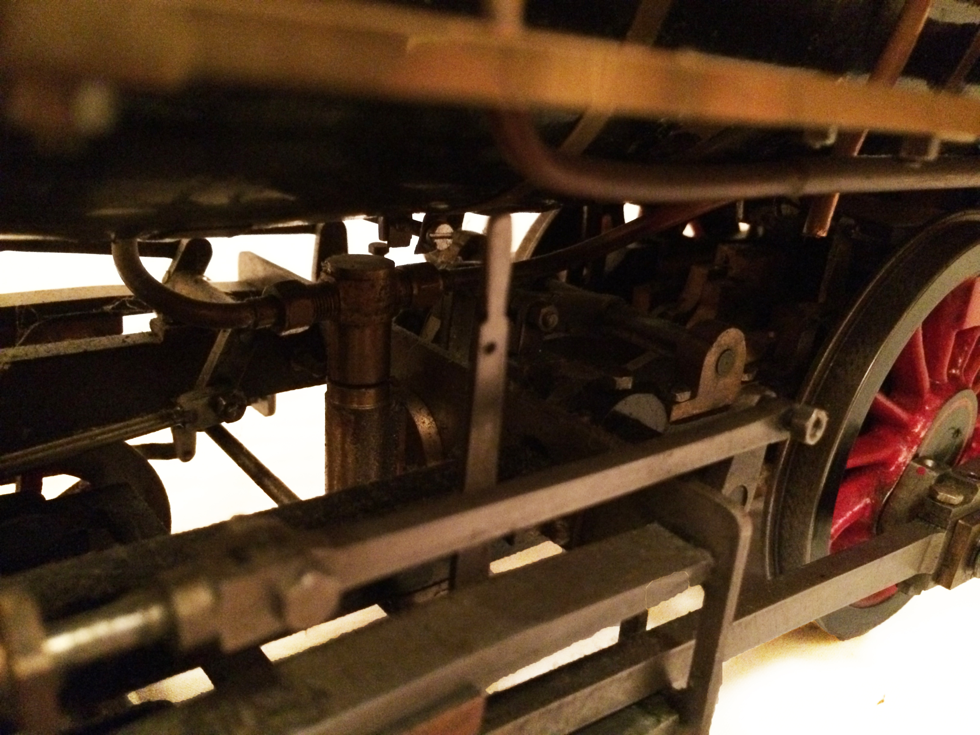 Here we have an example of the venerable LBSC Virginia 4-4-0 locomotive.  This is an older model that would benefit from a little TLC!  Its well built though, with nice detailing and it runs very nicely on air.  It sports an axle pump with footplate mounted bypass valve, and injector and a tender hand pump.  Draincocks are operated from a vertical lever on either side of the boiler just behind the cylinders, and theres a nice big mechanical lubricator feeding through a clack mounted on the front underneath the smokebox.