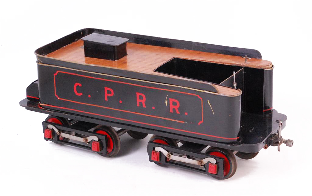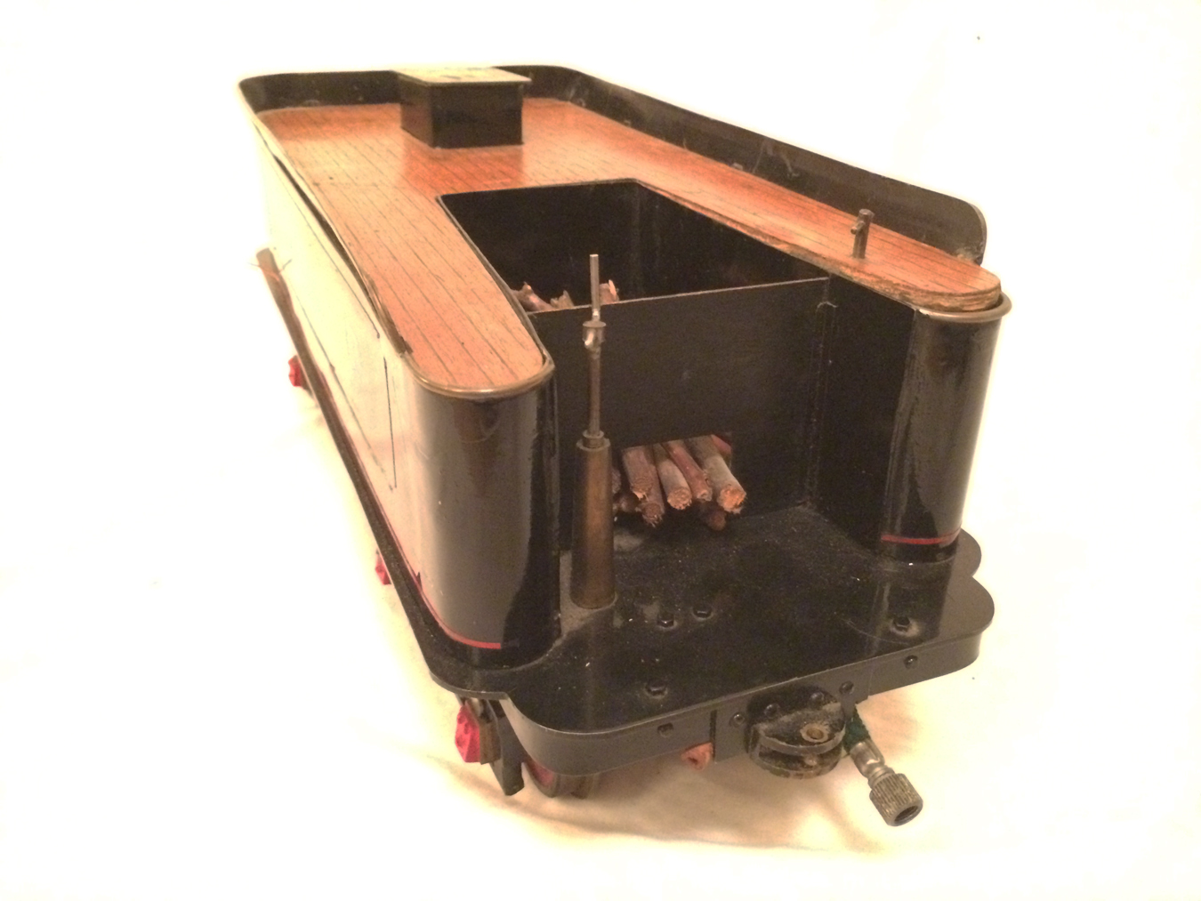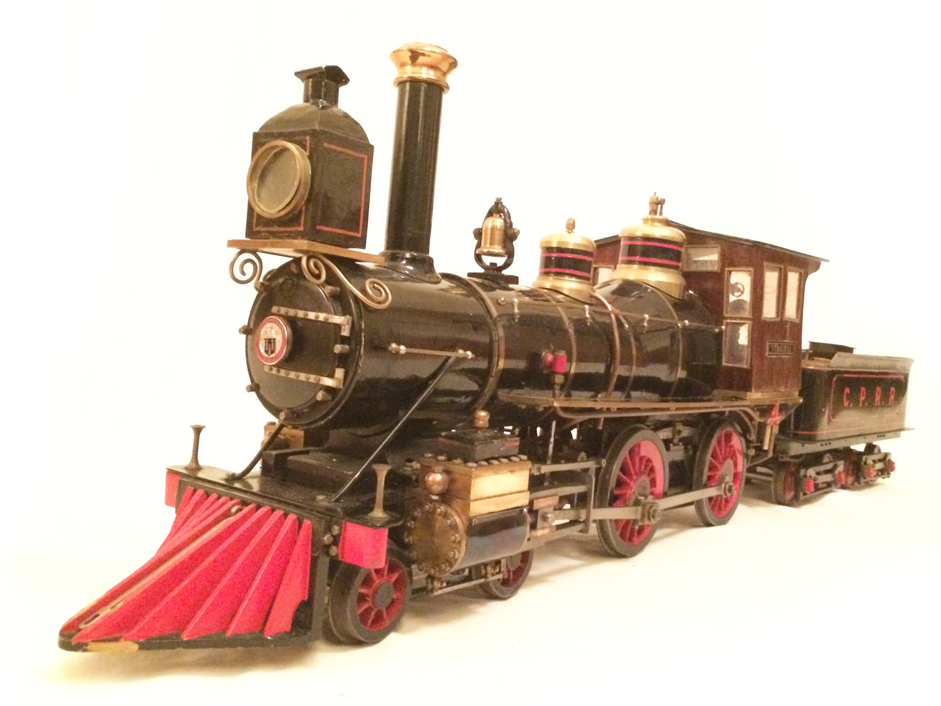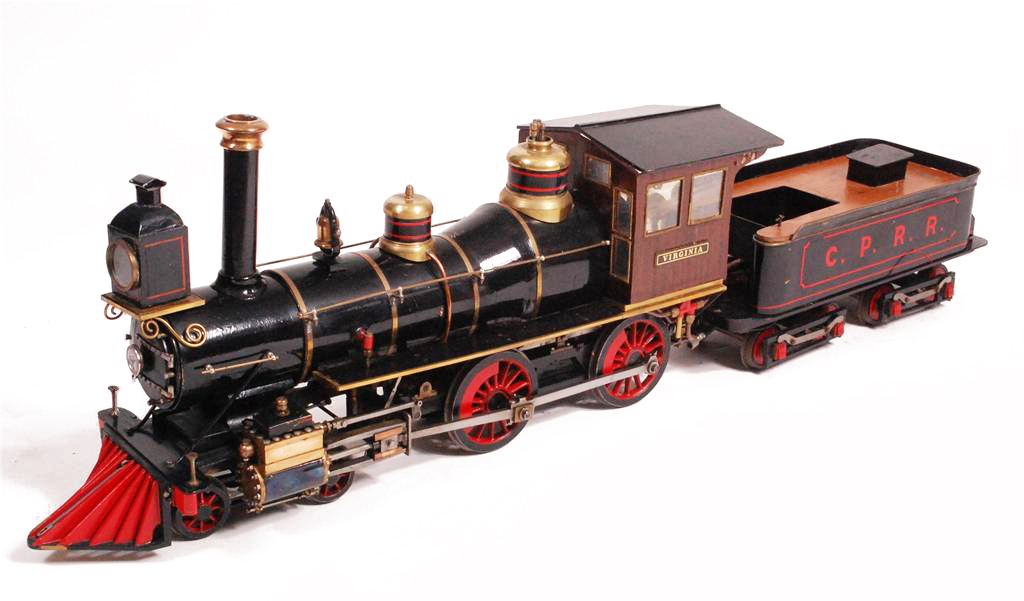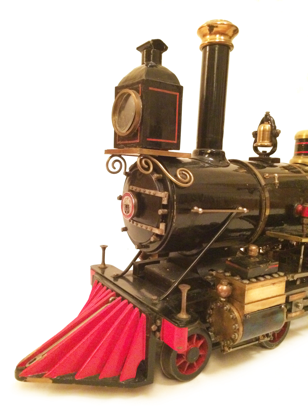 Here we have an example of the venerable LBSC Virginia 4-4-0 locomotive.  This is an older model that would benefit from a little TLC!  Its well built though, with nice detailing and it runs very nicely on air.  It sports an axle pump with footplate mounted bypass valve, and injector and a tender hand pump.  Draincocks are operated from a vertical lever on either side of the boiler just behind the cylinders, and theres a nice big mechanical lubricator feeding through a clack mounted on the front underneath the smokebox.