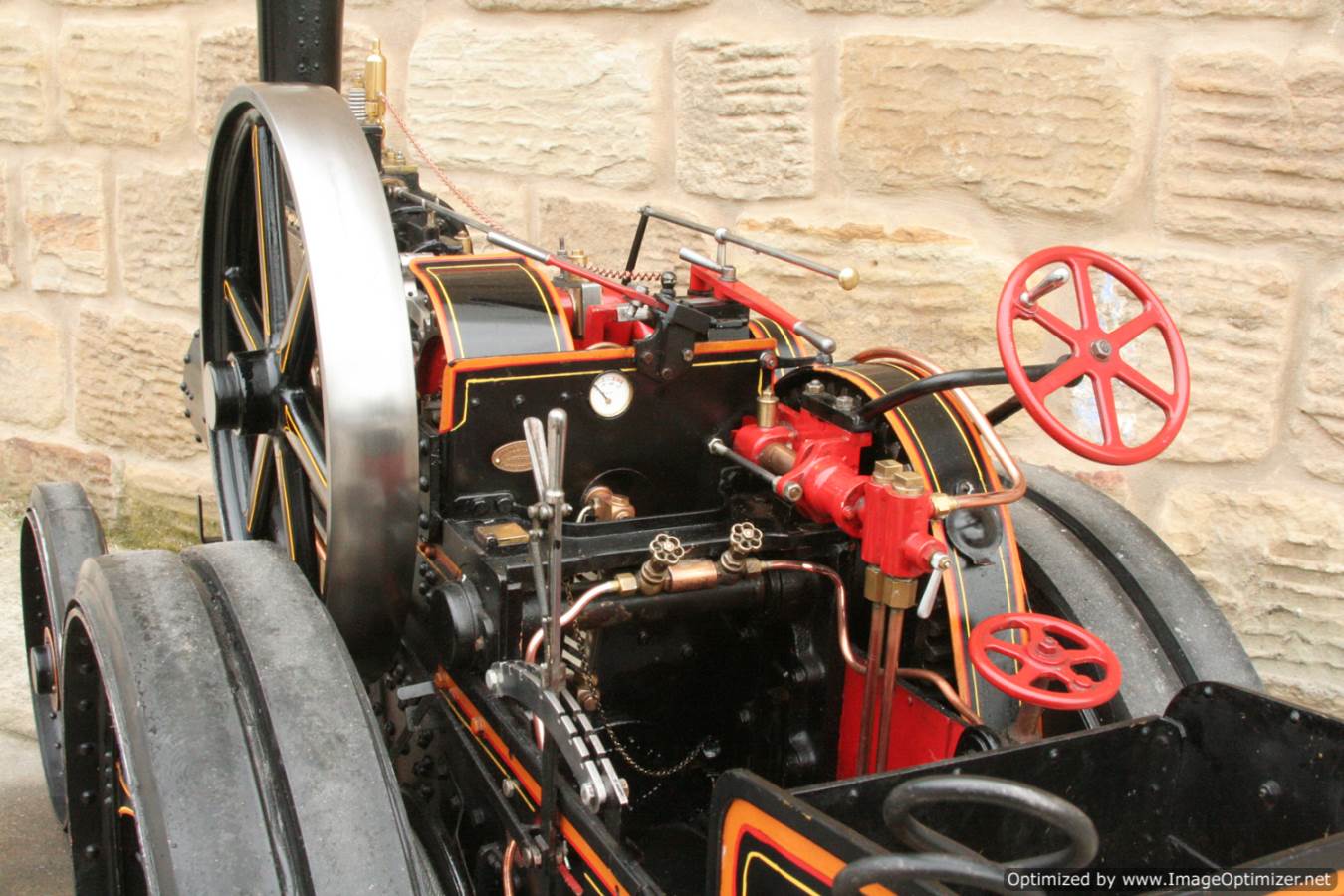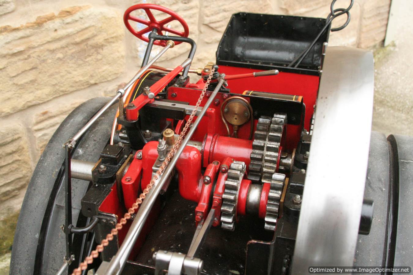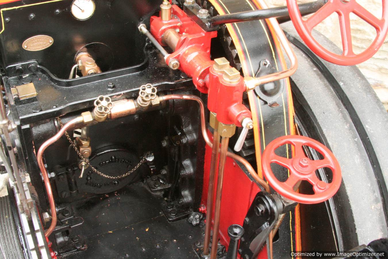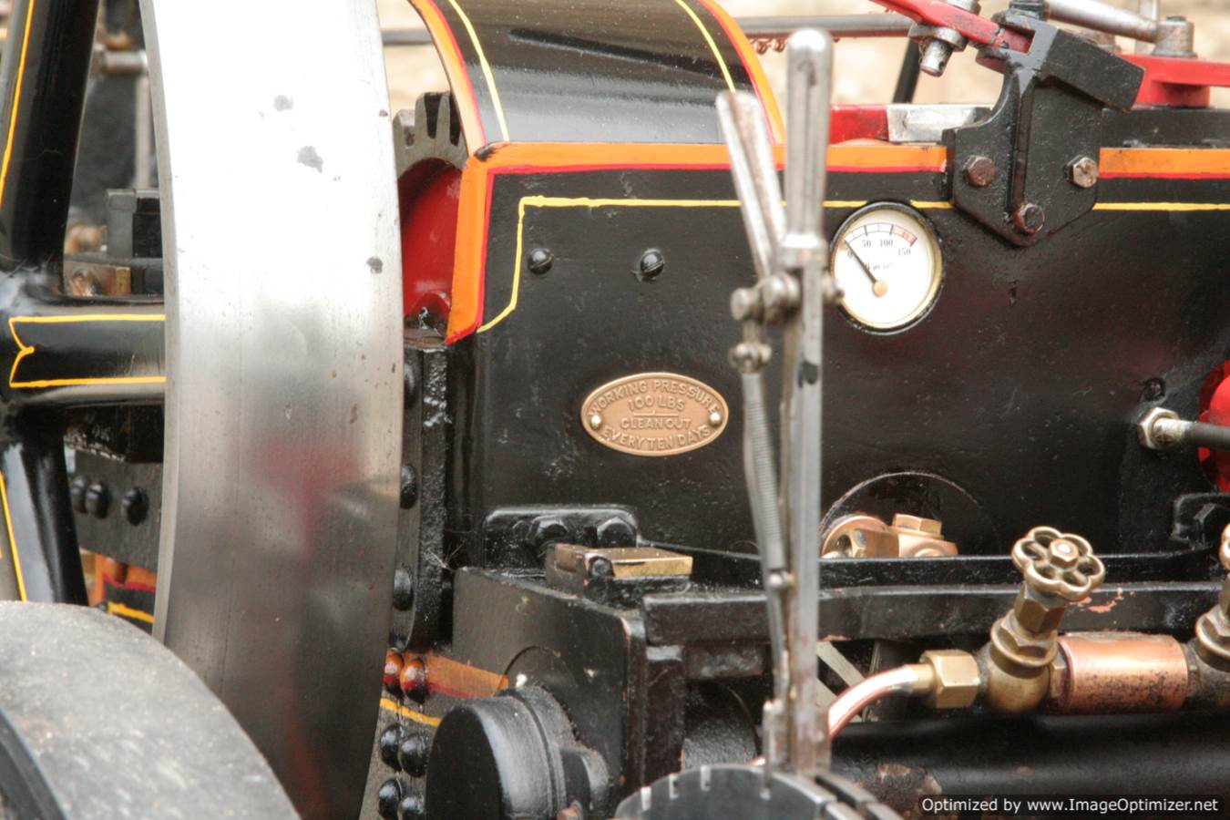 Here we have a particularly nicely made 3" scale Fowler A7 traction engine. Made to the MJ Engineering drawings, this is the rarer 'large' version of the model, most being build in 2" scale. Everything is there on this one, it's a lovely and well detailed design, and the model has been built faithfully to the plan. The paintwork is also very neatly done, and the hand painted lining is finished with considerable skill. The boiler is silver soldered copper, and she is fitted with all the usual bits. An injector and a crank shaft driven water pump. The water lifter works well too. Lubrication is mechanical as always and fitted above the cylinder block.