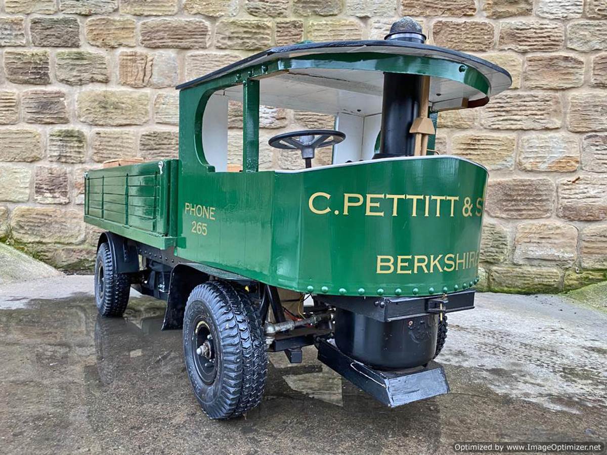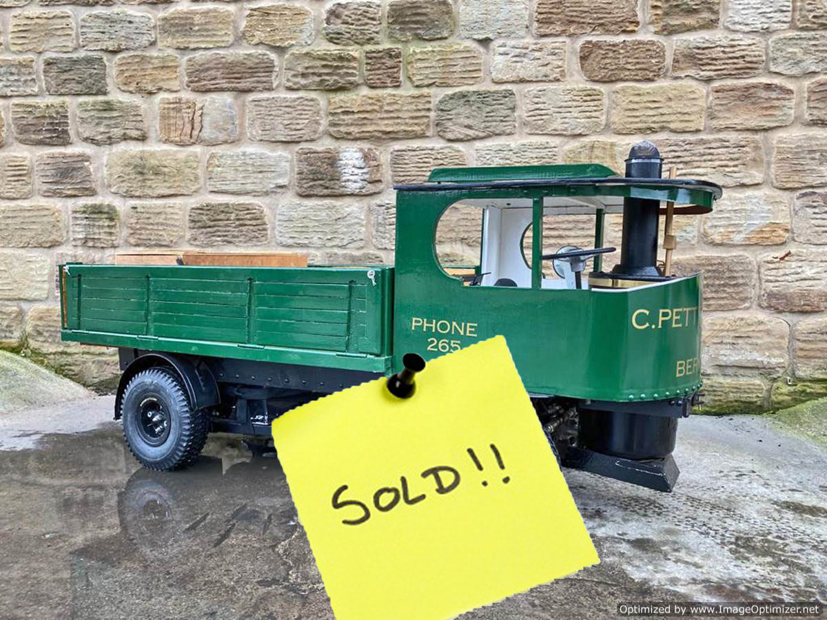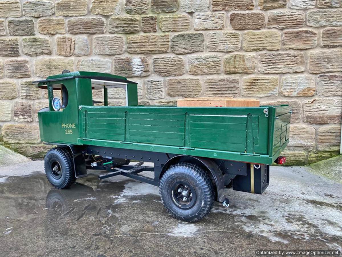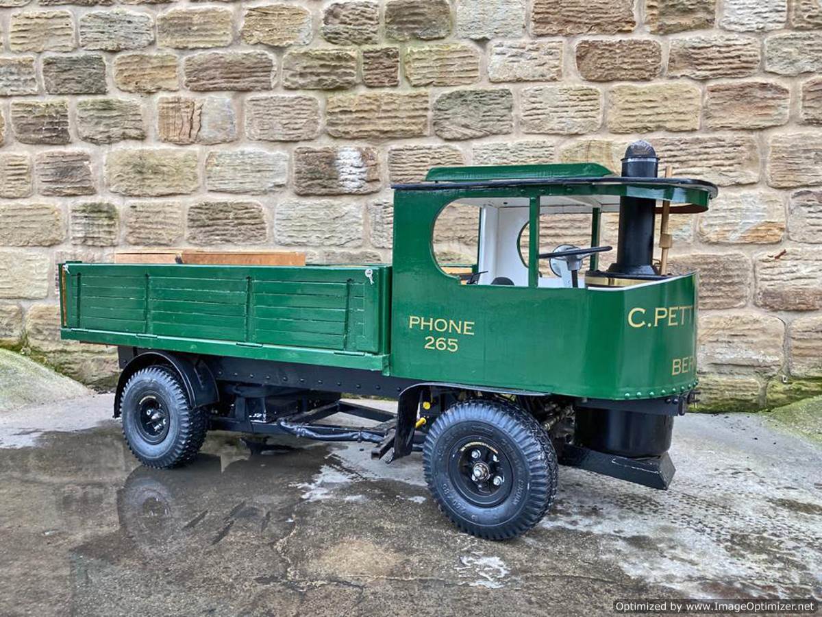 Here we have an unusual and very cool toy! A 3" scale fully electric 'Sentinel-esque' steam lorry. Essentially it's a mobility scooter in drag,.... and to that end there are a couple of batteries hidden underneath and a mobility scooter electric motor in the back driving the rear wheels. The front axle is ackerman steering actuated by a tiller rather than the steering wheel (which is a dummy), as is of course the boiler!