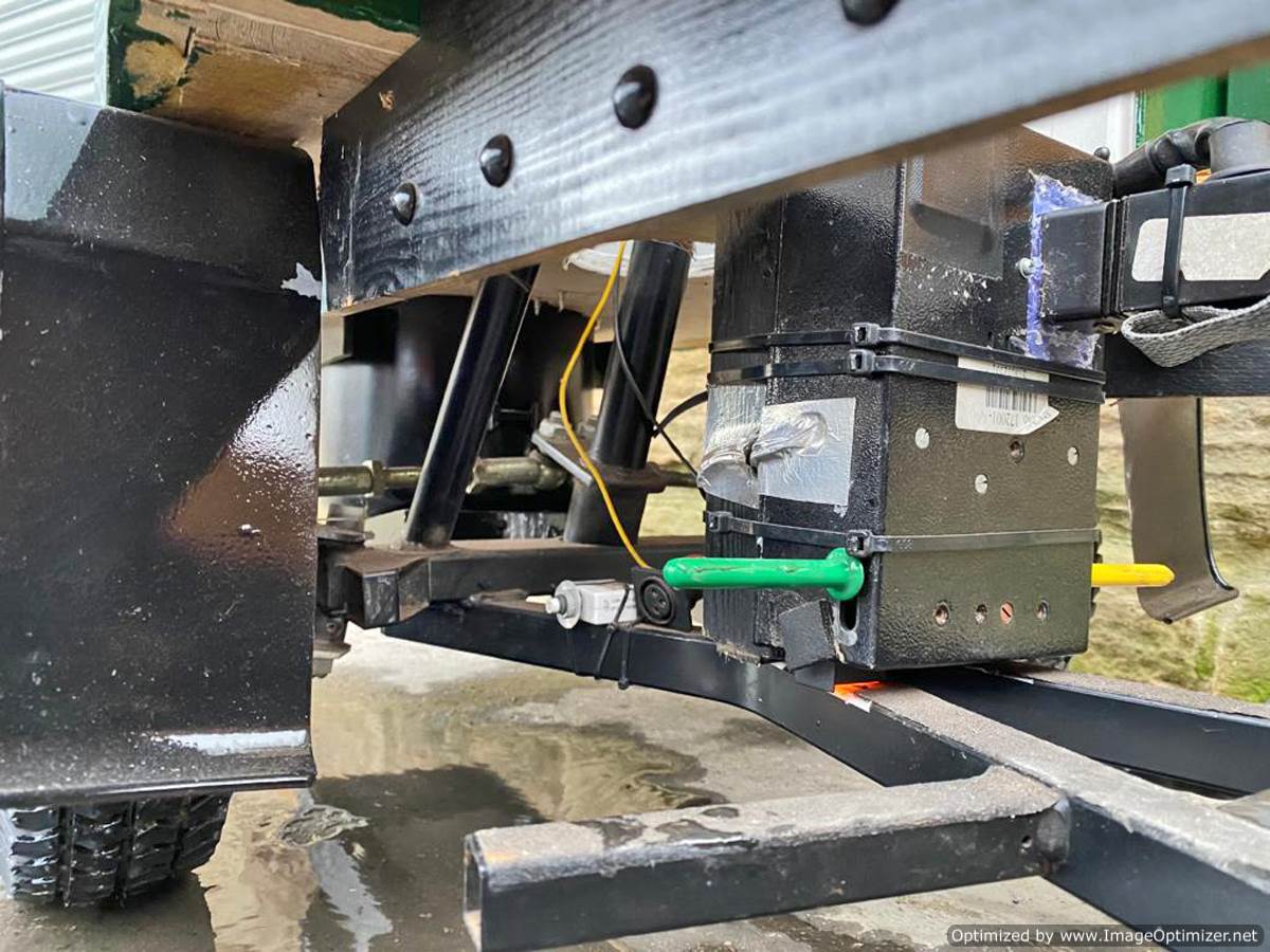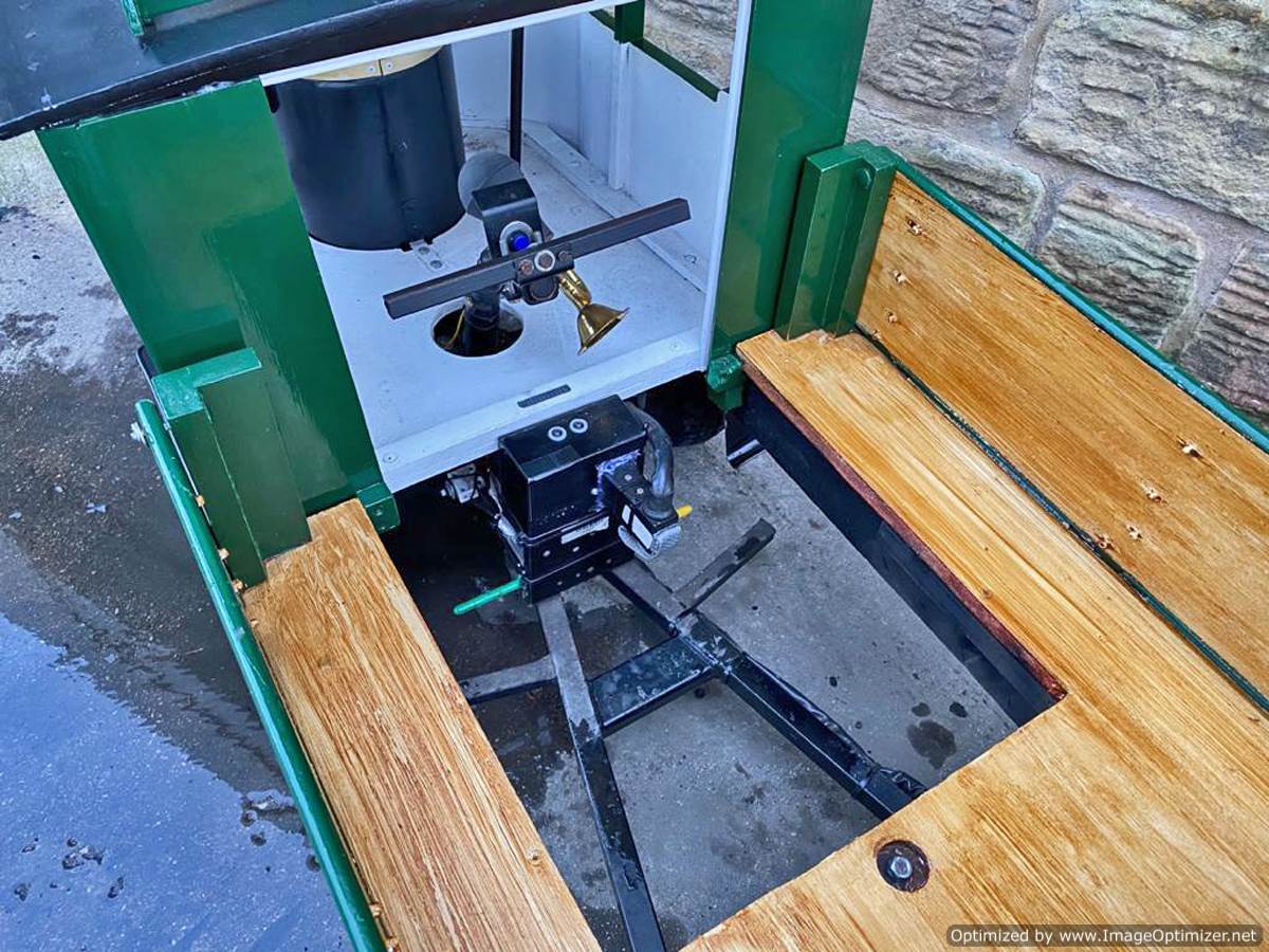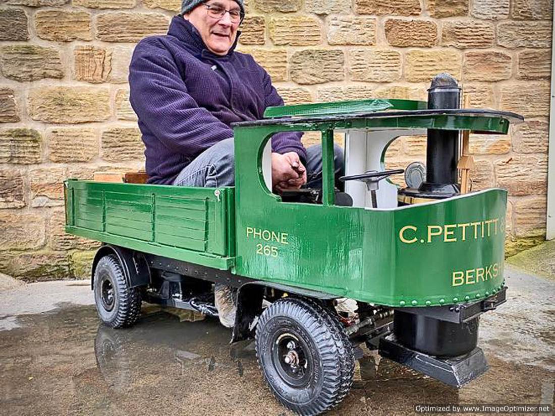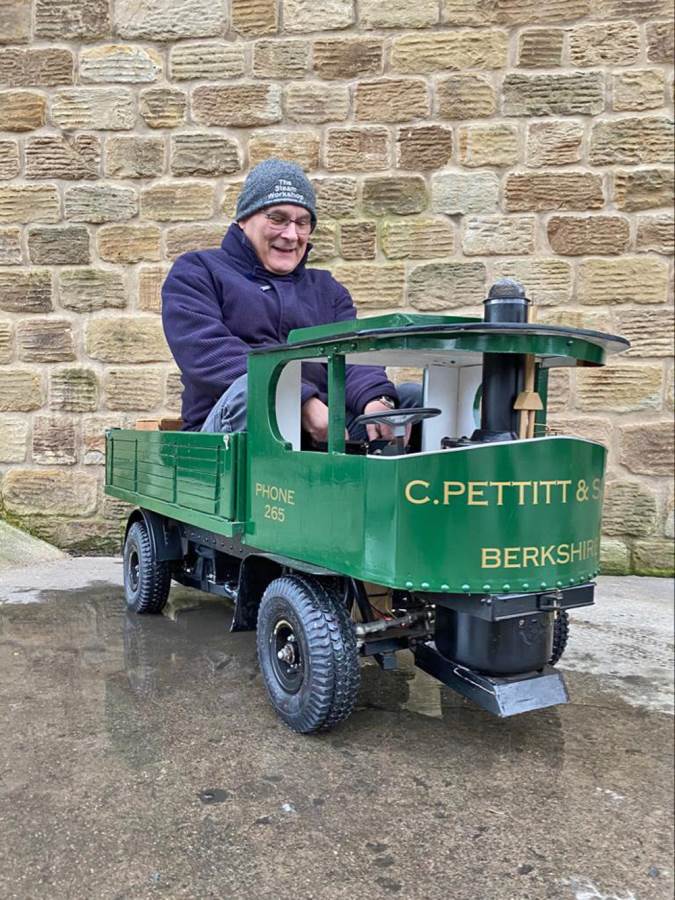 Here we have an unusual and very cool toy! A 3" scale fully electric 'Sentinel-esque' steam lorry. Essentially it's a mobility scooter in drag,.... and to that end there are a couple of batteries hidden underneath and a mobility scooter electric motor in the back driving the rear wheels. The front axle is ackerman steering actuated by a tiller rather than the steering wheel (which is a dummy), as is of course the boiler!