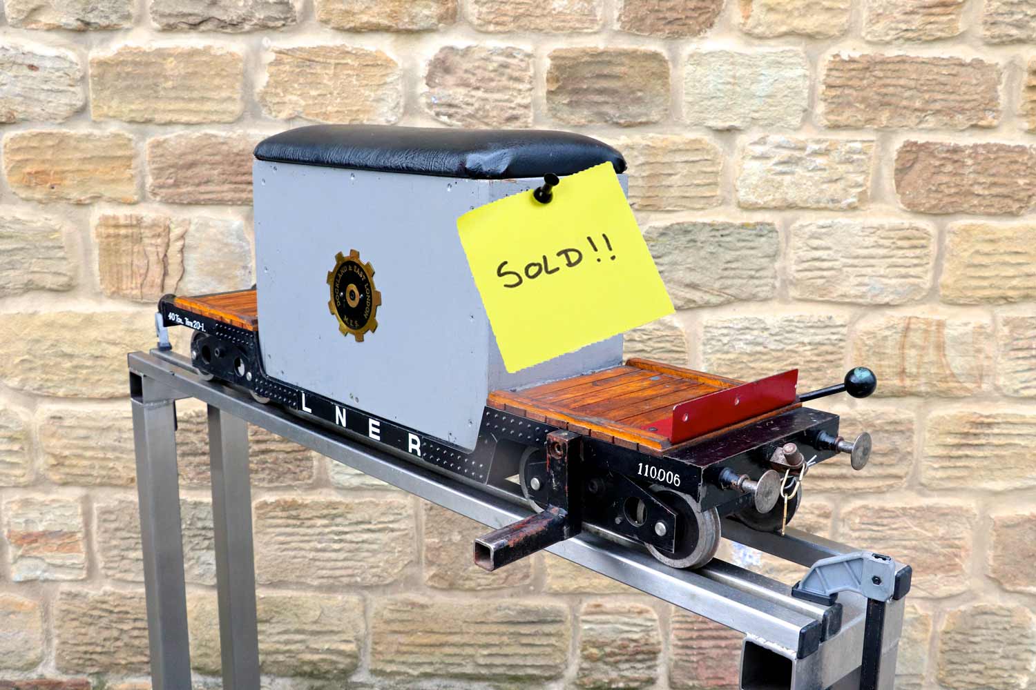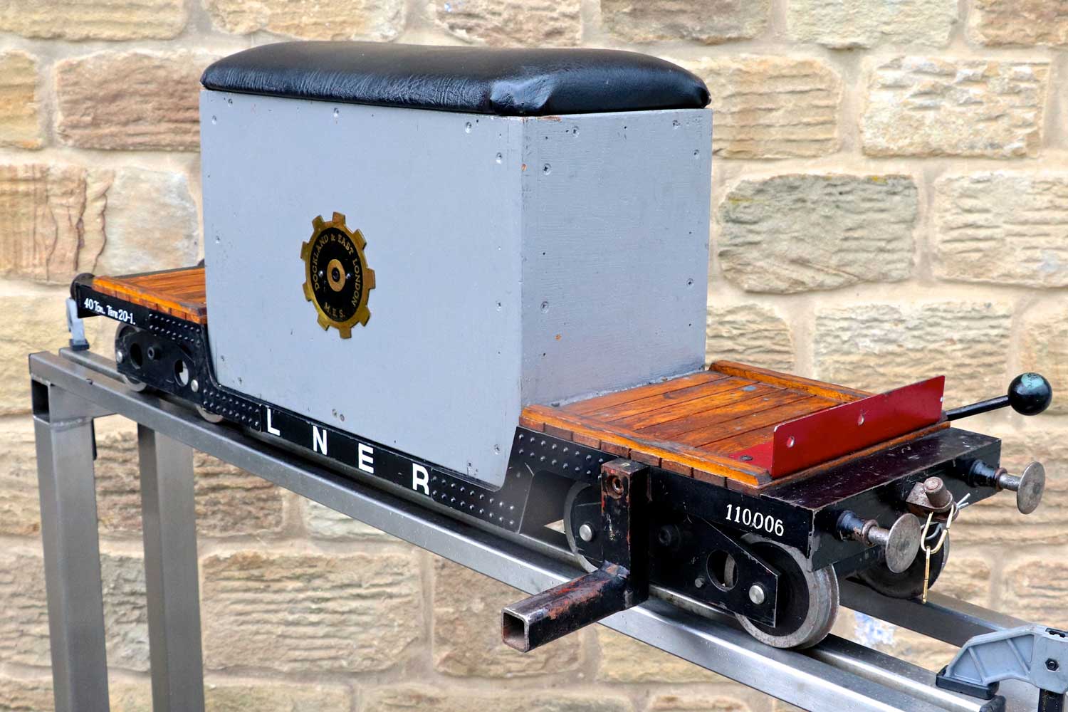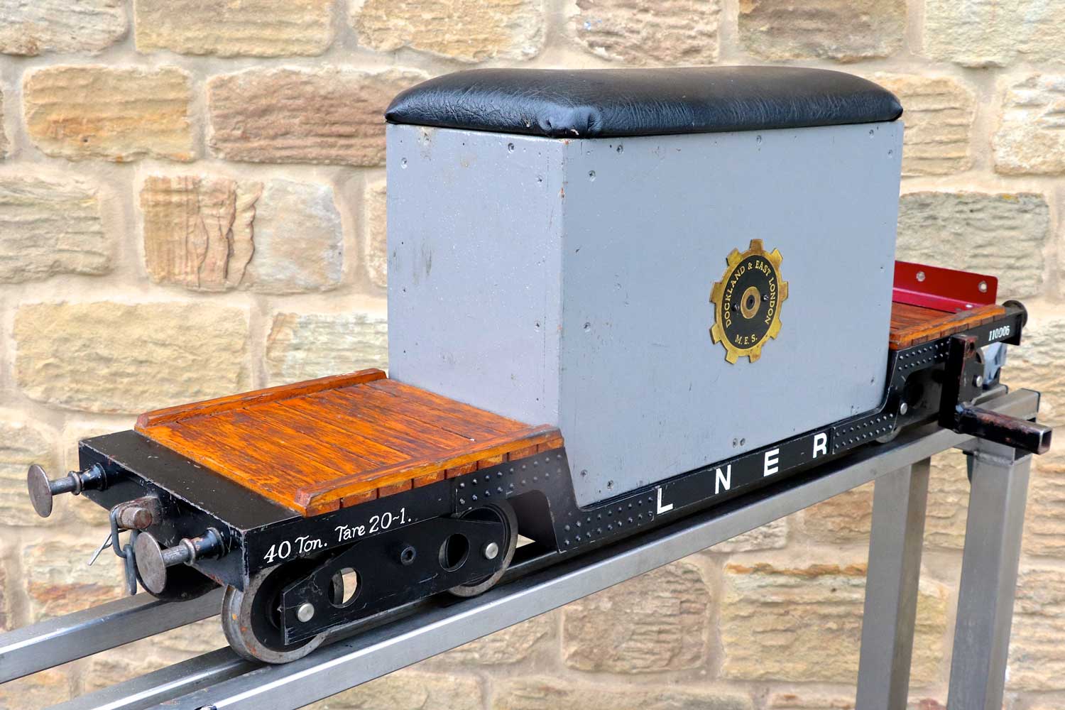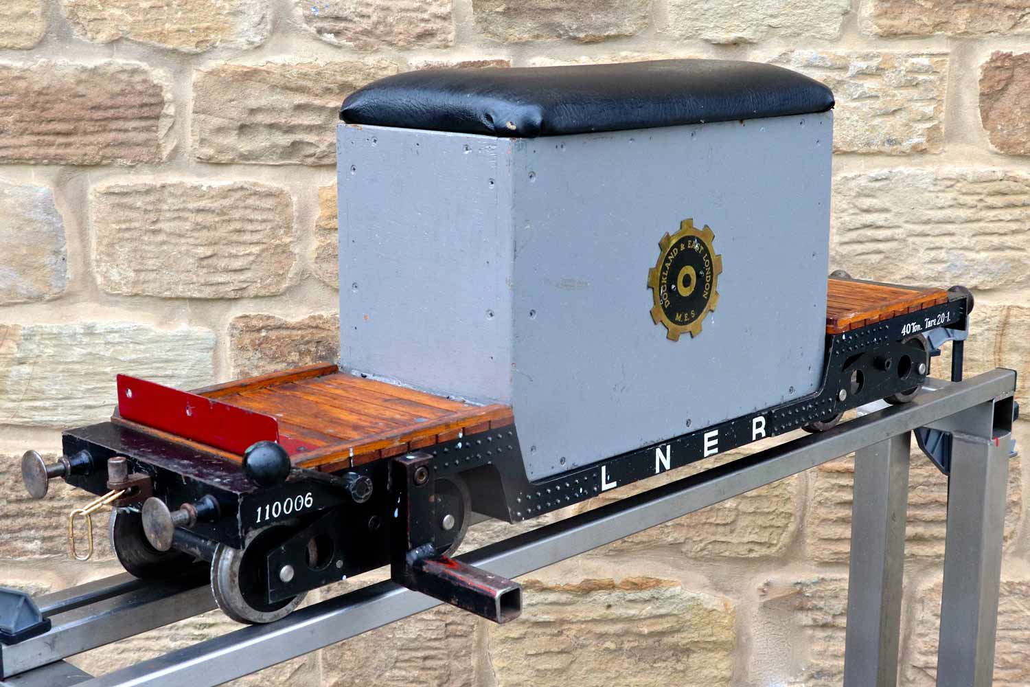 Here we have a 5" gauge bogie Driving truck, based upon a 40 ton LNER Well wagon. Ideal for ground level running, particularly if you are involved with GL5 'scale trains' type running, where this would be right at home. The bogies themselves are a little basic, but non the less functional for it. There's a hand brake operating on the front bogie, and strong footrests to stop your feet hitting the ballast. It rides very freely, and with the box on there at the moment is a comfortable height for most 5" tank locos on ground level. It rides nicely, is all free rolling and in good all round condition. Convincing little thing, and ideal to slip into a scale train.