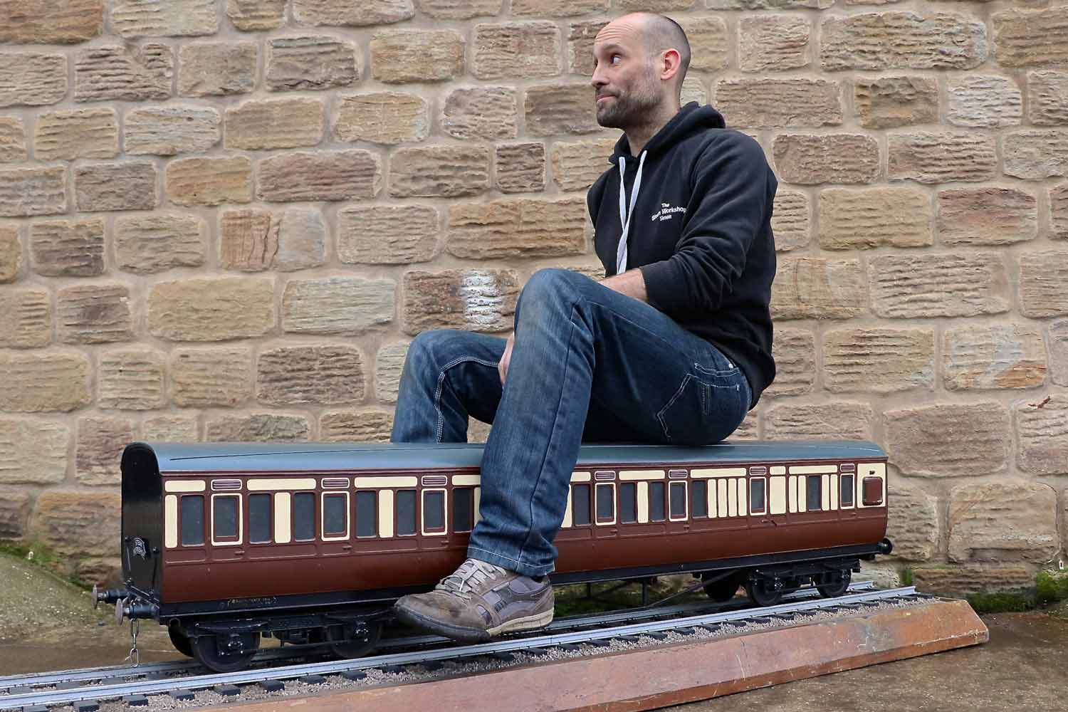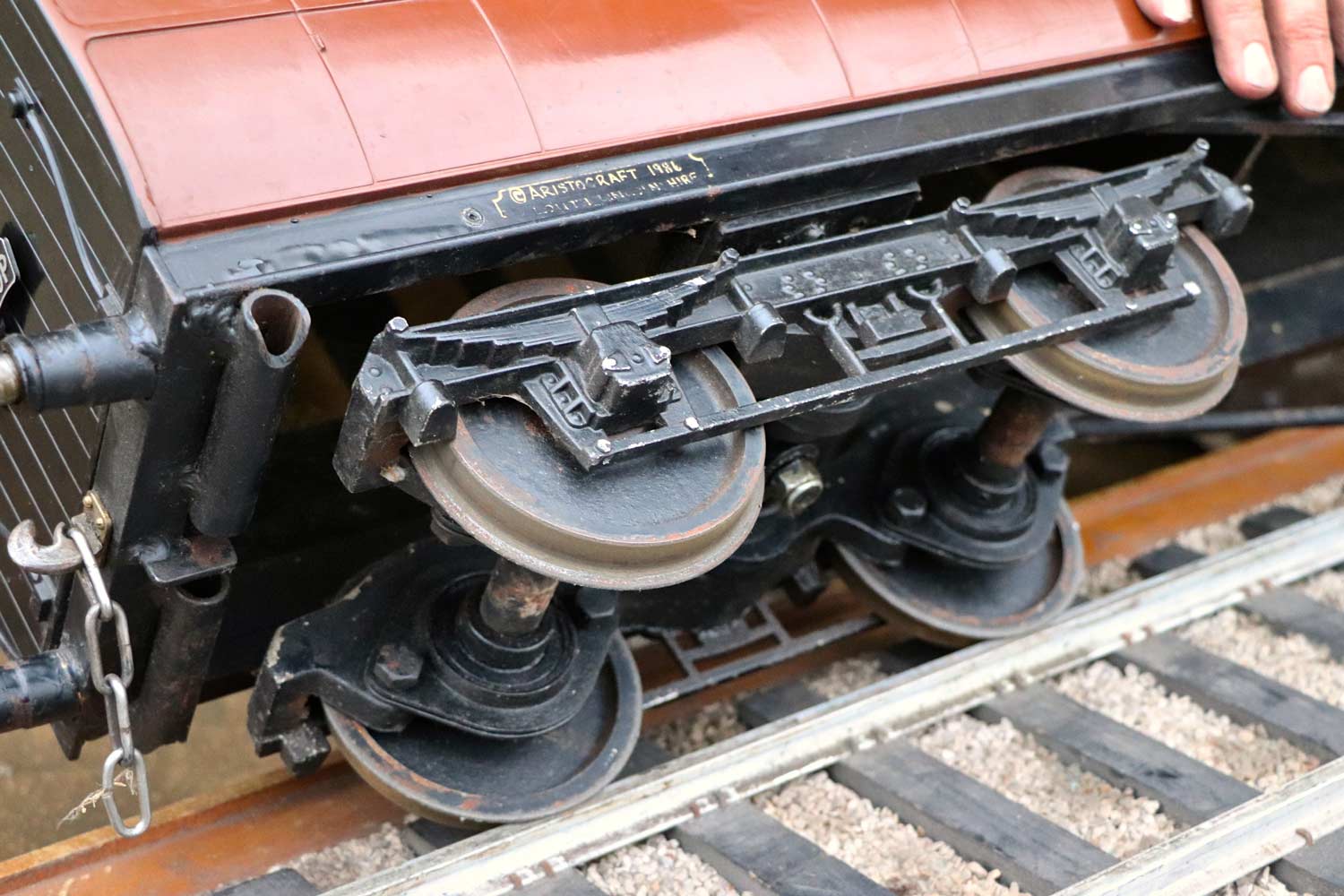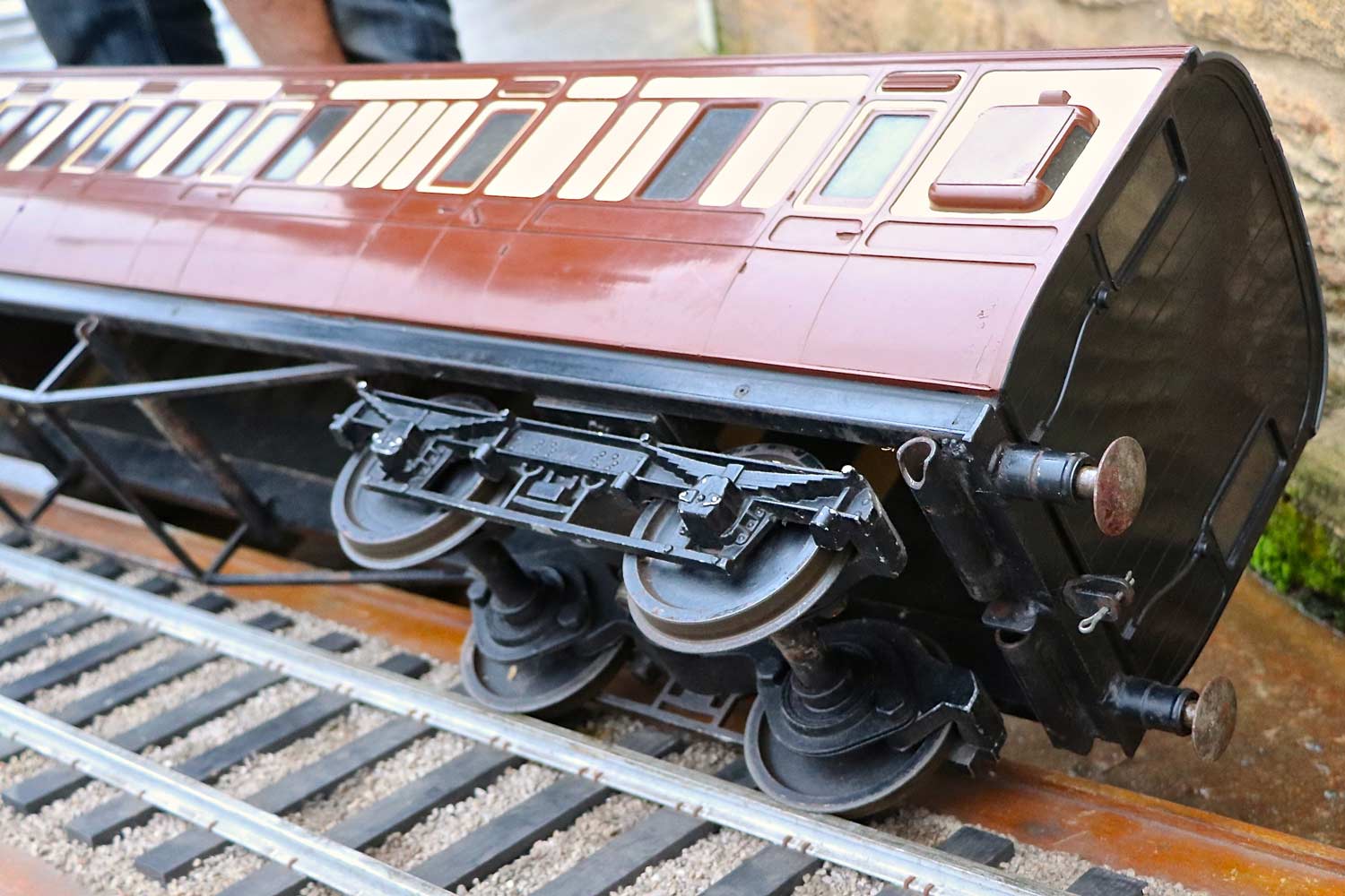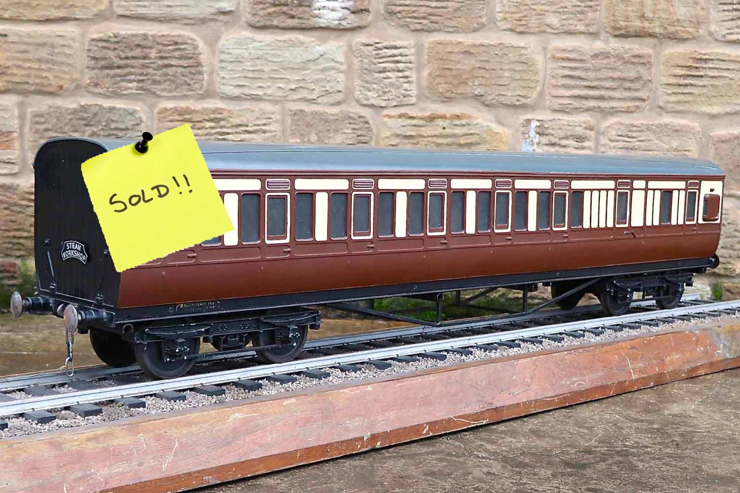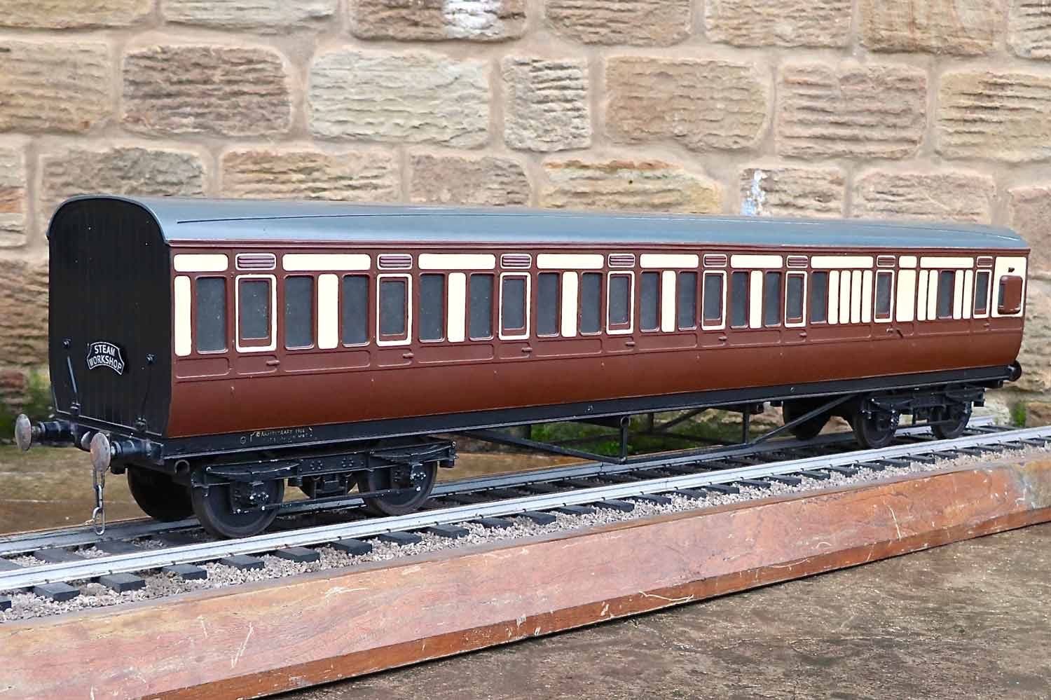 Here we have a reasonably tidy 5" gauge GWR Aristocraft third brake carriage. (unbraked,..... perhaps ironically!?) It's one of a pair that we've got currently in stock. (We do actually have a third too,... a brand new GWR carriage set up with a water tank as a driving truck,..... hopefully to be photographed and listed soon). These are a superb product, the body being one piece moulded fiberglass, but the livery is not painted on, but rather it is the coloured gel coat laid up into the mould first, in stages before the fiberglass and resin is stippled onto it from behind. The net result is an extremely durable finish that can pretty much be kicked about by as many peoples legs as you like and it'll still look tidy.