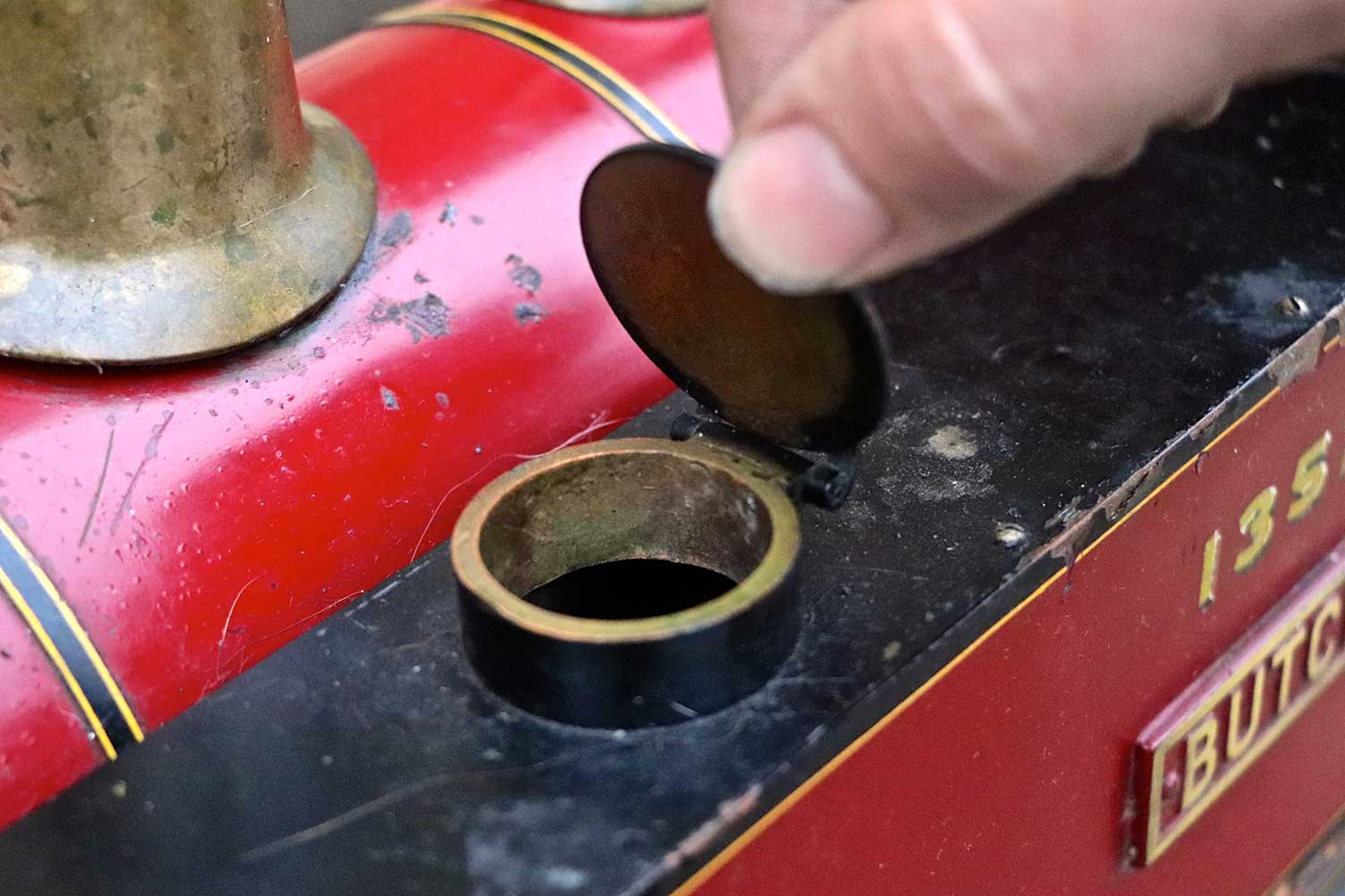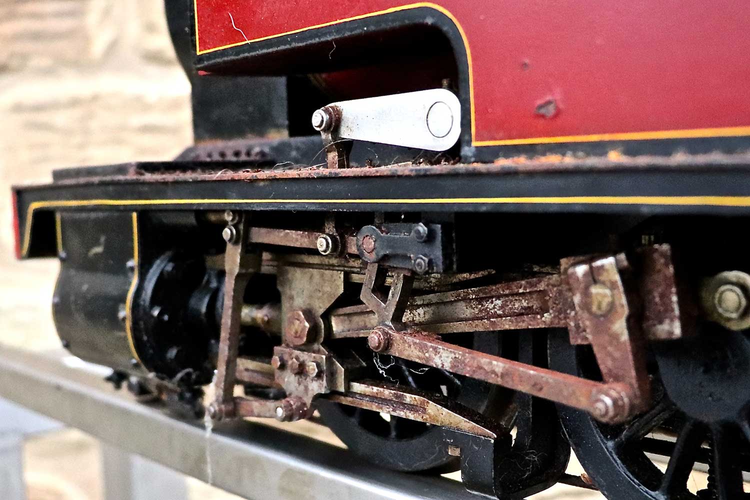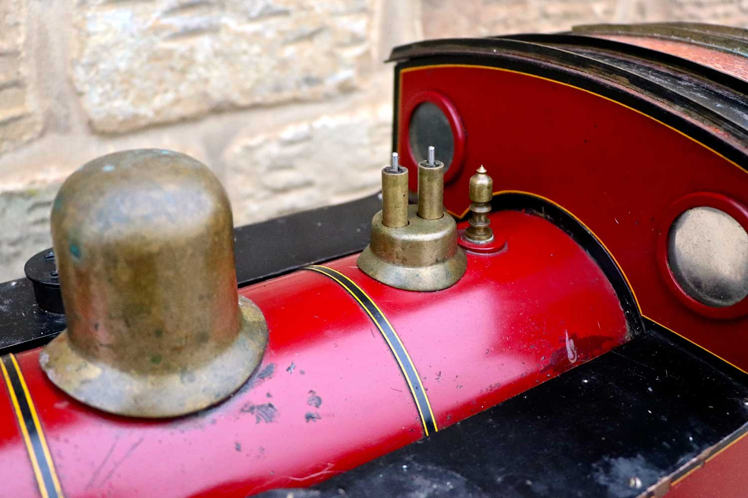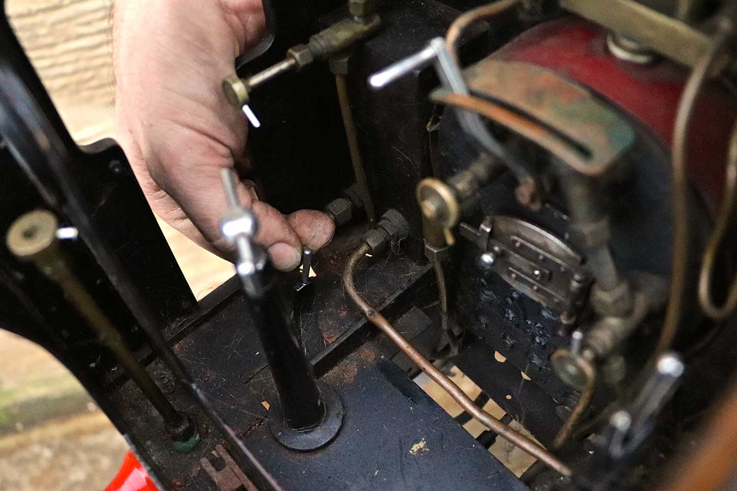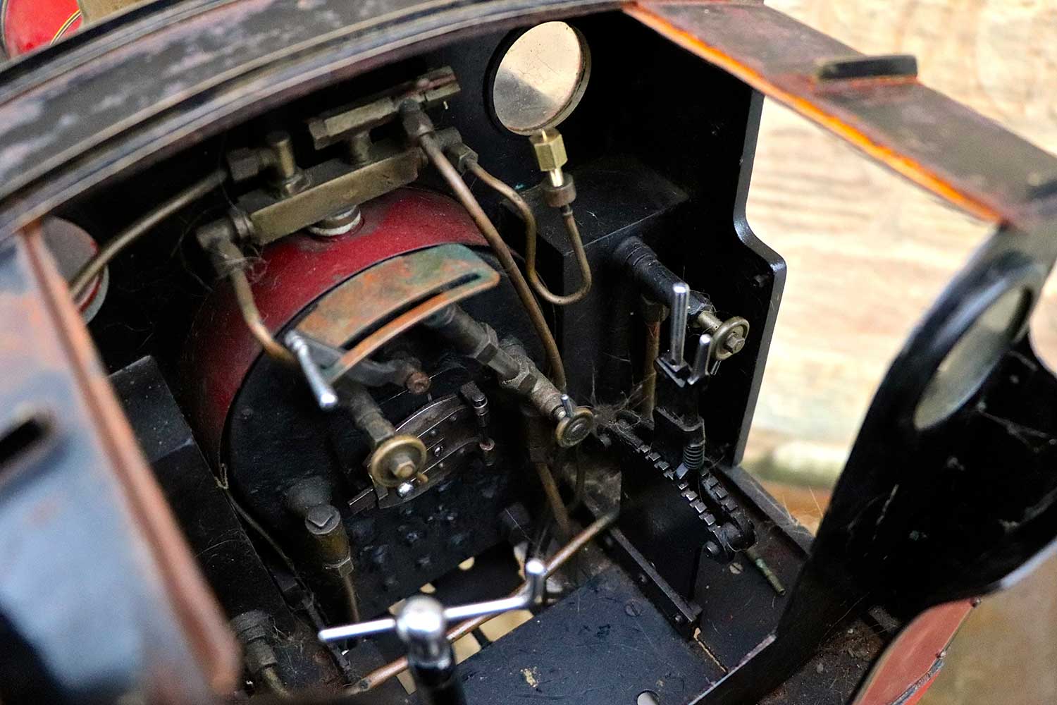 Everything you'd expect is there, with the mechanical lubricator being in front of the smokebox between the frames. There's an injector, a mechanical axle pump with footplate mounted bypass. The boiler is silver soldered copper, and although the backhead is visually a bit scruffy, we think it's going to be good. We have tried to hydraulic it, but the regulator wasn't seating, and fittings were leaking so we couldn't properly test it beyond about 30 pounds, and rather than invest our hours in sorting it, we are offering it cheaper as a project instead. But to be clear, there is no indication or suspicion that there is anything wrong with the boiler, indeed we think it's likely to be good so are offering the two options. So again on this one, two prices. One as she is, and one with us having done the tests and re-commissioning work so she's ready to play. For the higher price of course, the loco can be given a full fresh 4 year hydraulic test and a new annual steam cert for you should you so require.