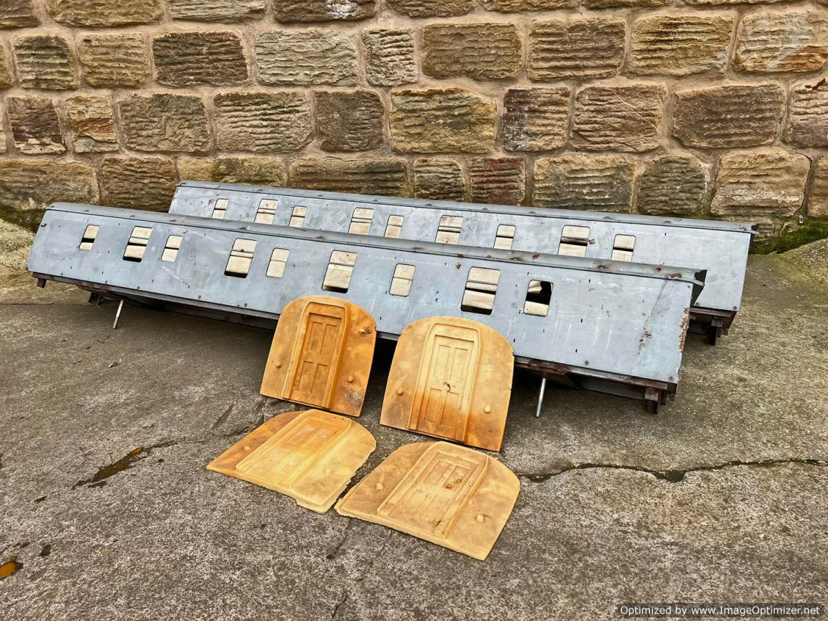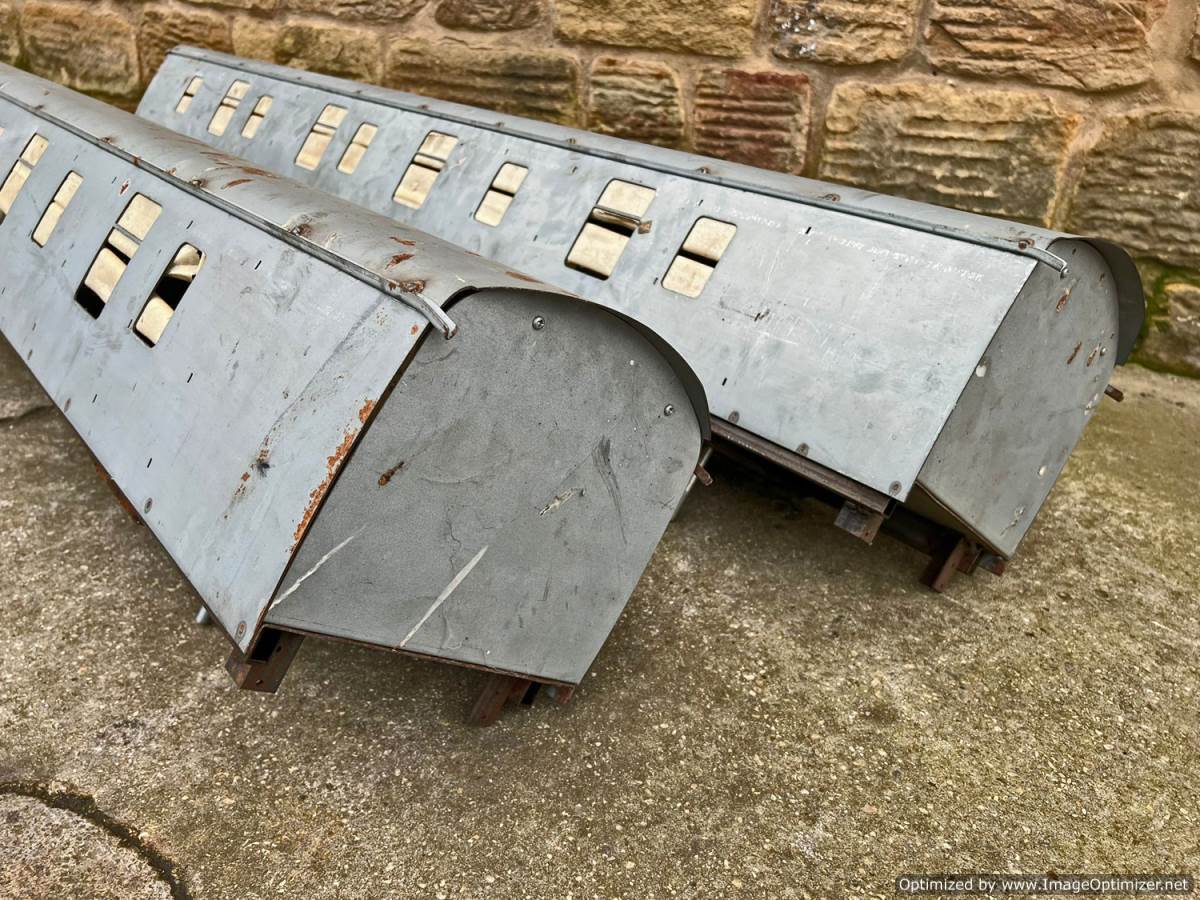 Here we have a pair of Brent Hudson produced 5" gauge MK1 BG full brake carriages. Laser cut zintec bodies welded to the steel tube chassis, complete with the bearer plates and bogie centre pins. The cast resin ends are also present. These are really solidly constructed so they will support the load of passengers riding on their roofs.