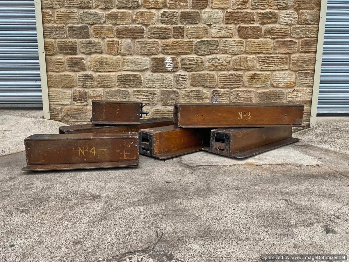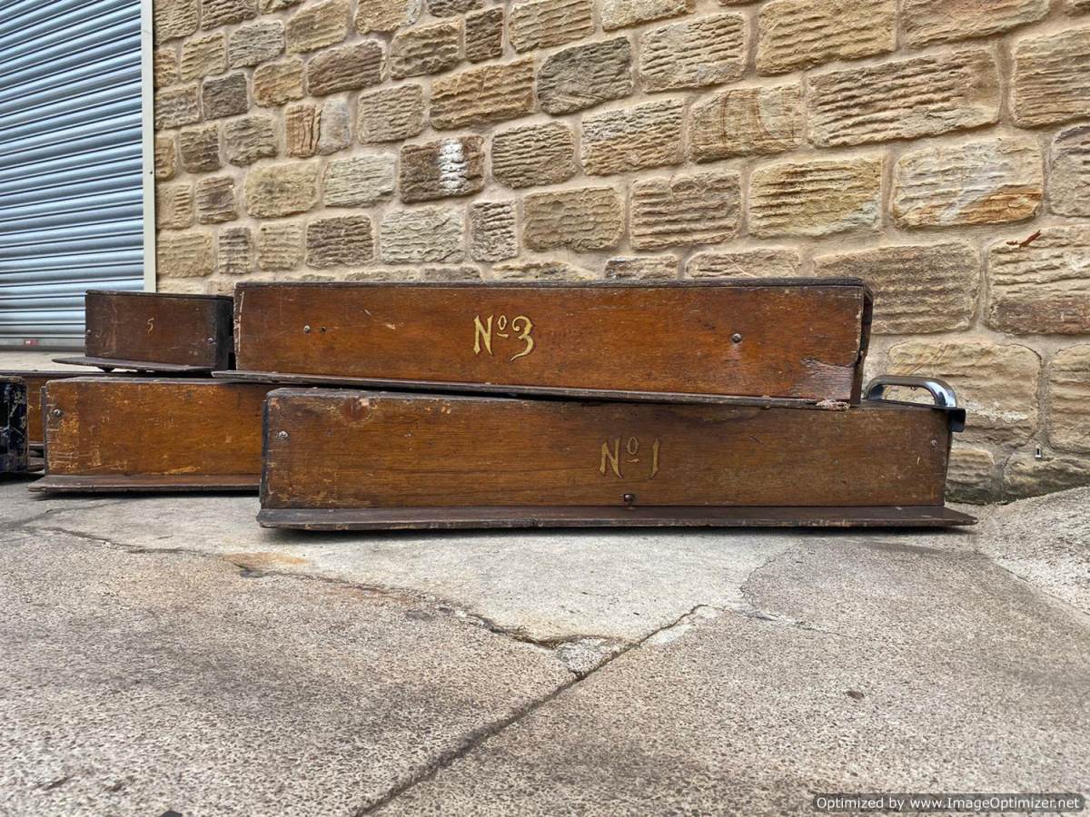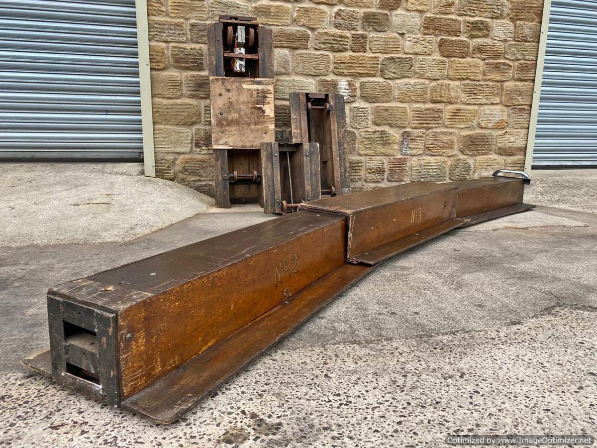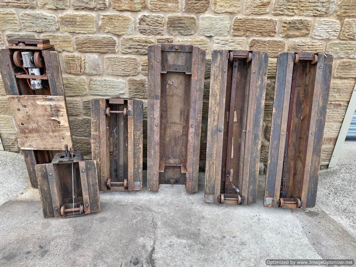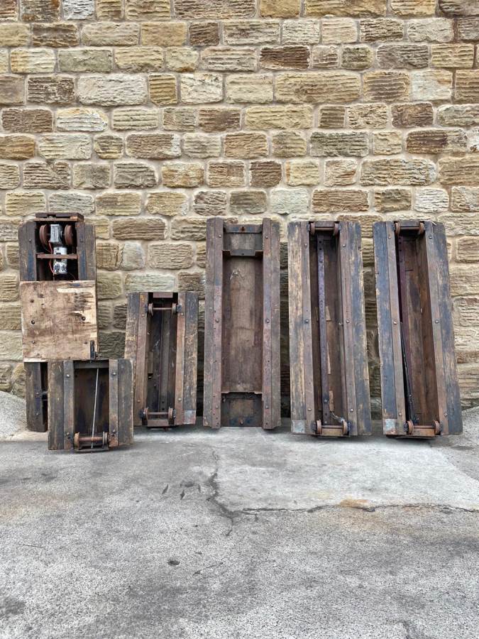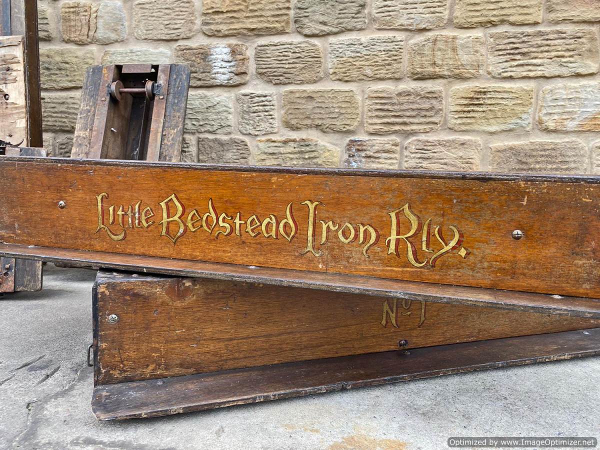 Here we have a mixed and interesting rake of ground level 5" gauge driving trucks and carriages.  It's clearly an incomplete set of wagons that have originally made up a complete train.  A mixture of independent ready to roll trucks and articulated, suspended centre sections, a motorised unit and a single axle trailer unit that appears to be designed to latch onto either the rear of a loco or indeed one of the carriages.  They are all showing their age, but the woodwork is still both viable and attractive.  The whole thing, whilst clearly requiring work to bring back to former glory, has a lovely old fashioned feel to it.  It's a pretty little rake that deserves to find the TLC it needs.