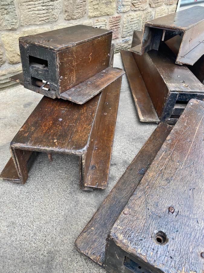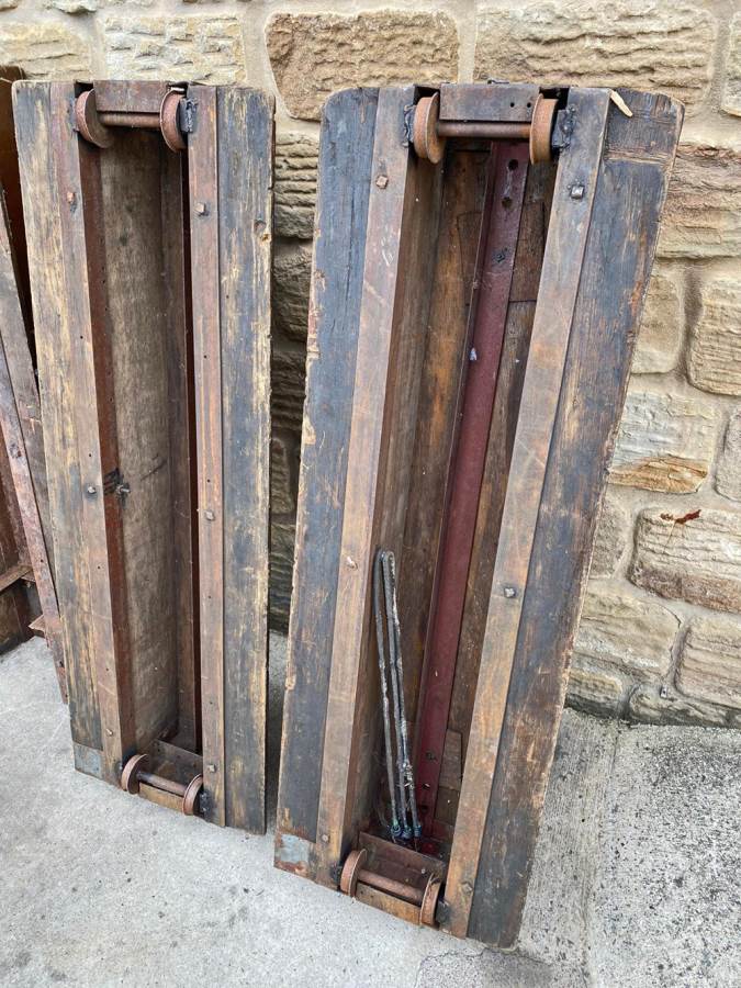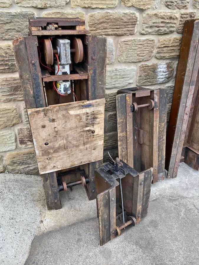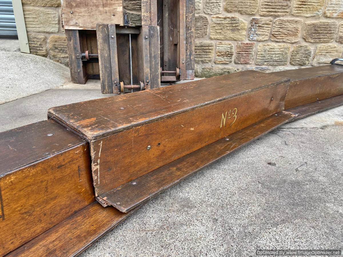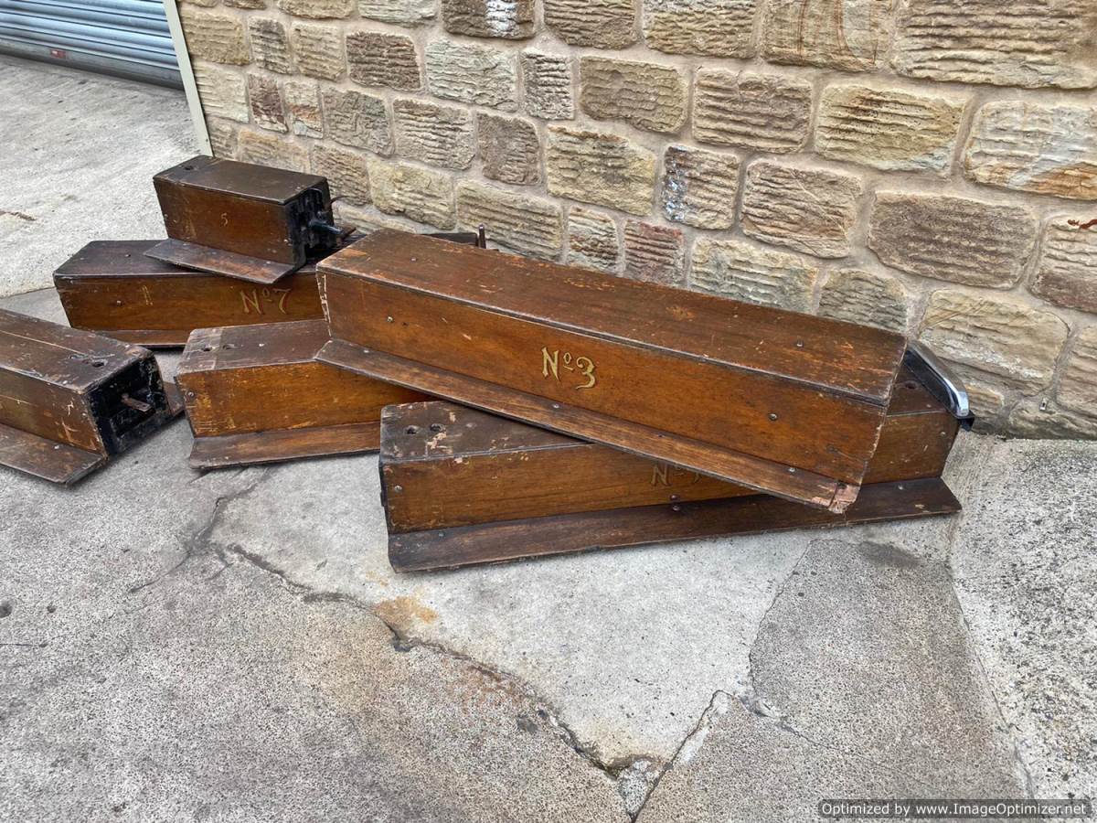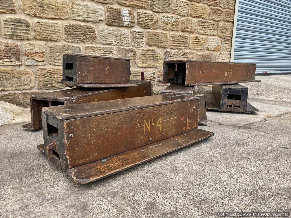 Here we have a mixed and interesting rake of ground level 5" gauge driving trucks and carriages.  It's clearly an incomplete set of wagons that have originally made up a complete train.  A mixture of independent ready to roll trucks and articulated, suspended centre sections, a motorised unit and a single axle trailer unit that appears to be designed to latch onto either the rear of a loco or indeed one of the carriages.  They are all showing their age, but the woodwork is still both viable and attractive.  The whole thing, whilst clearly requiring work to bring back to former glory, has a lovely old fashioned feel to it.  It's a pretty little rake that deserves to find the TLC it needs.