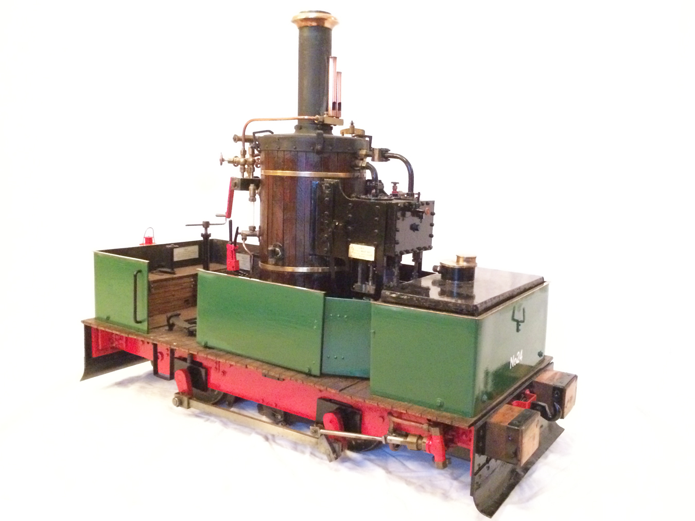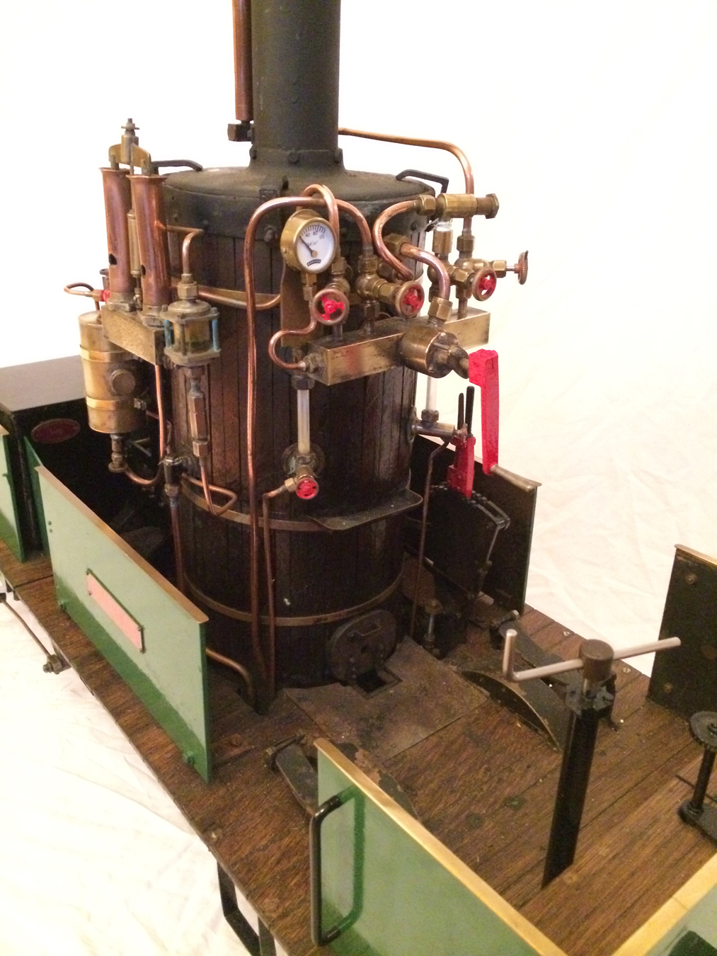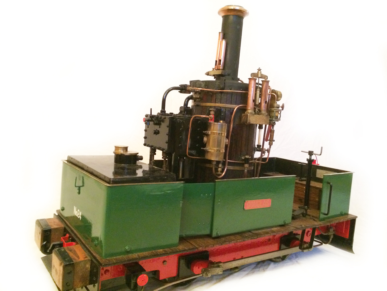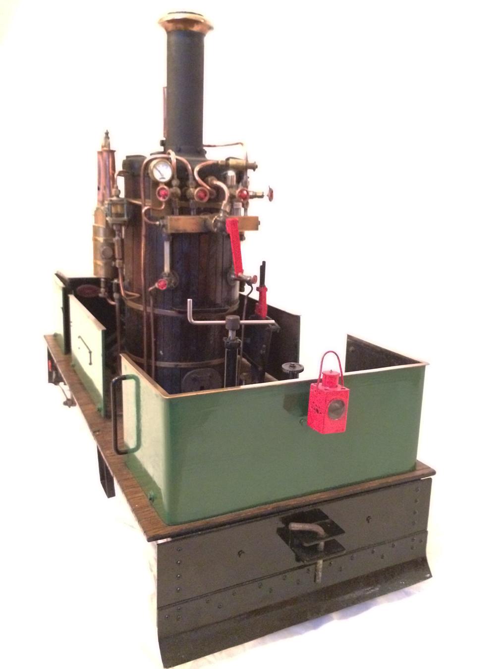 Here we have a rather nicely made and detailed 5" gauge De Winton vertical boiler 0-4-0T.  It has a model engineer scratch built vertical twin cylinder, fully reversing engine, fed by a displacement lubricator with a finely controllable drip sight feed.  Often narrow gauge De Winton models seem for some reason to be crudely machined and very simply assembled things, but not so here.  It runs beautifully on air, notching back nicely, and is just generally a very lovely, and nice sized 5 inch loco that will give hours of free steaming pleasure in your back garden or at the club.