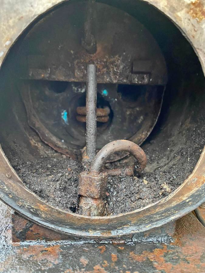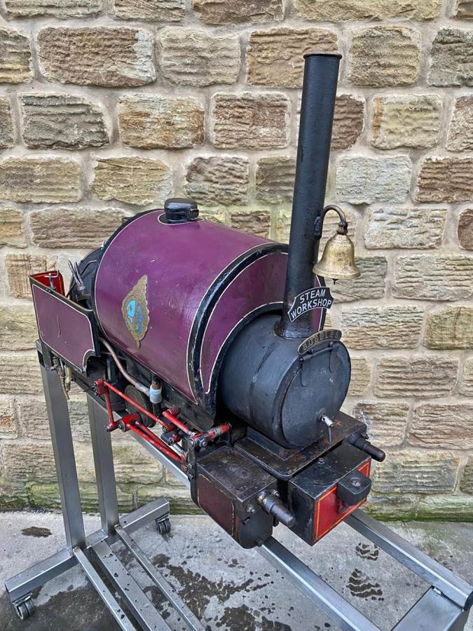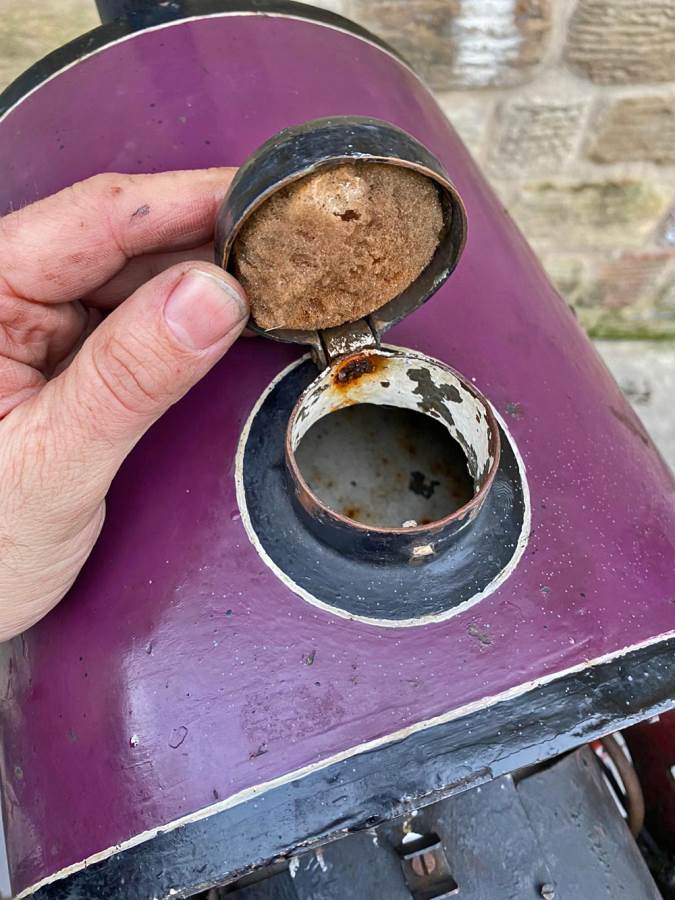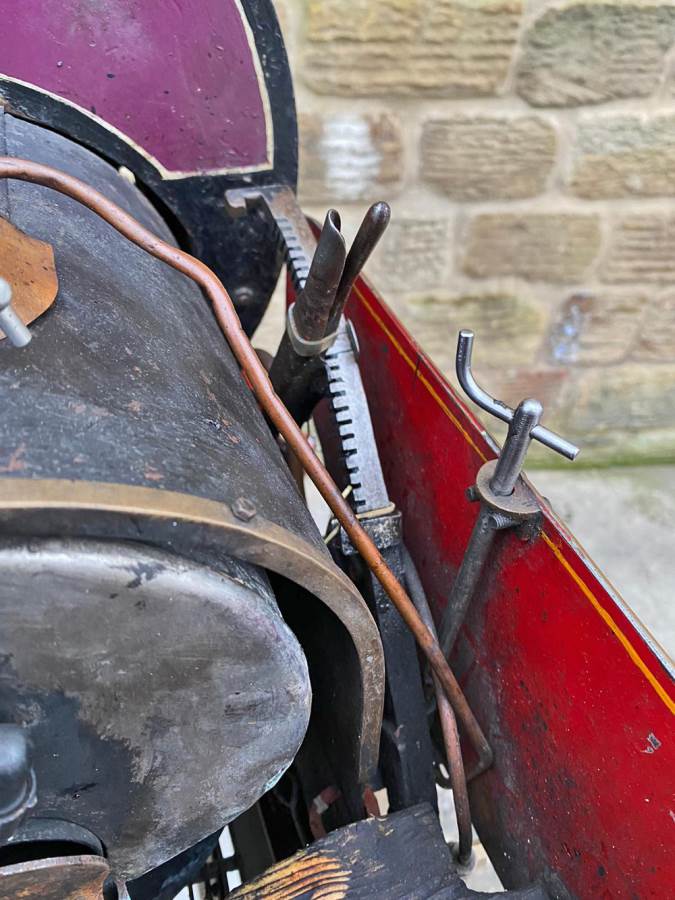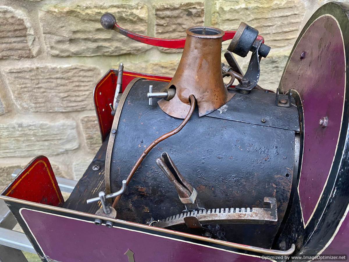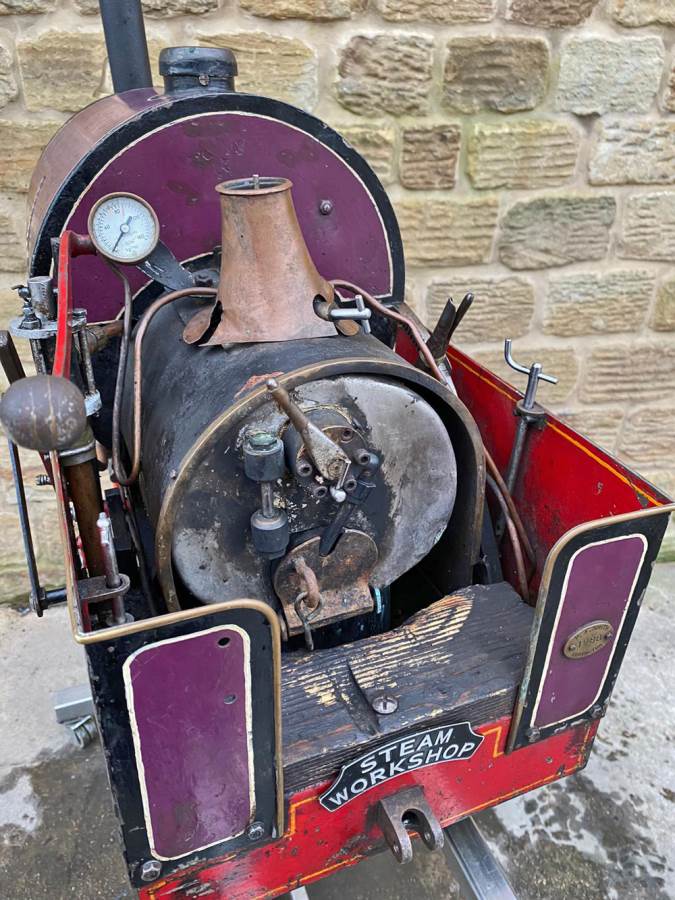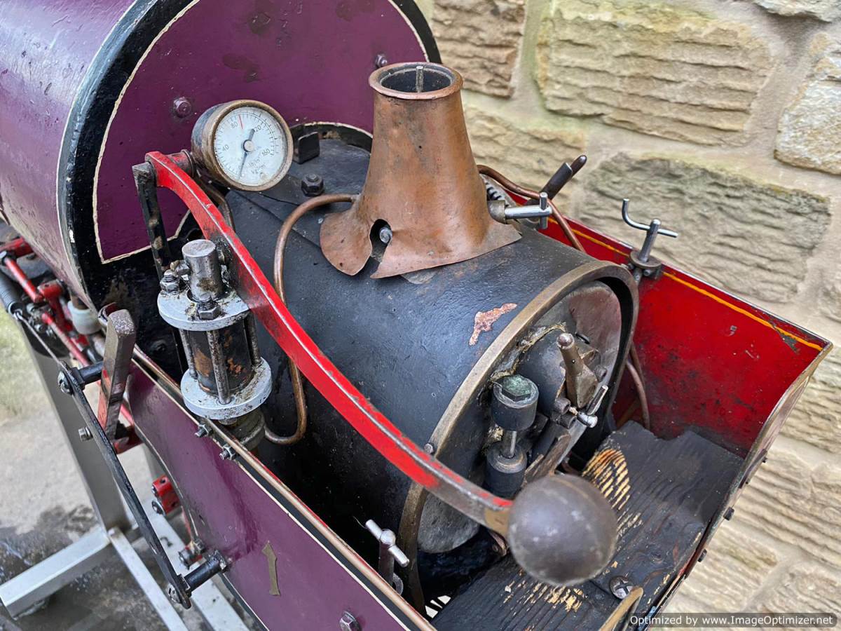 The boiler!  It looks solidly made and soundly made, and is silver soldered copper,.... but it's a weird little design!  The firebox is oval, as you can see from the photographs, and there is one large flue tube, down which the main steam pipe from the regulator heads, (having passed literally through the fire hole door to get there!) and then doubling back on it's self several times to form essentially a superheater.  It's currently missing the ashpan and grate but that's a fairly easy thing to make.  If the model wasn't so clearly well used, we'd bet against the boiler being man enough for the task in that format, but it's clearly done plenty of running, so it obviously does what it should, if through a pretty unconventional route!