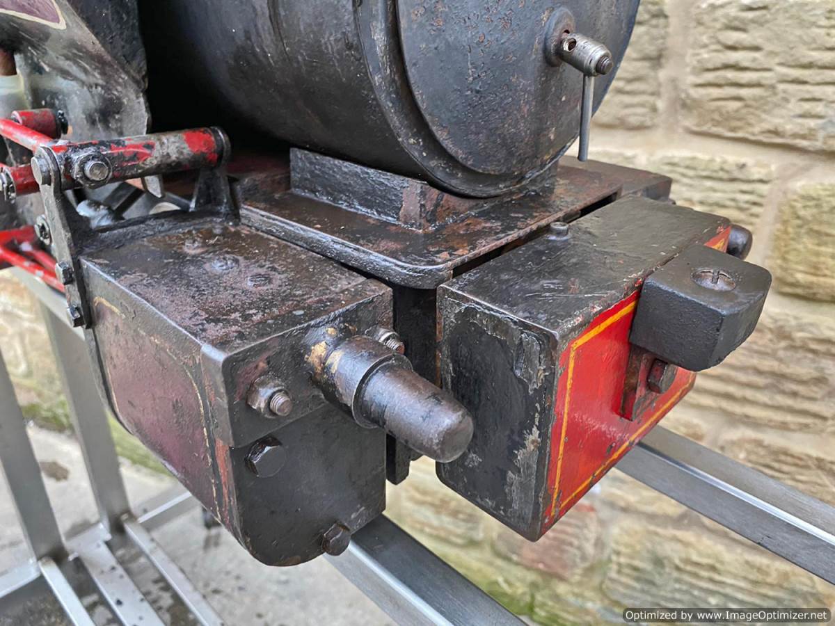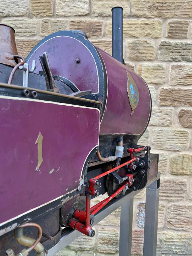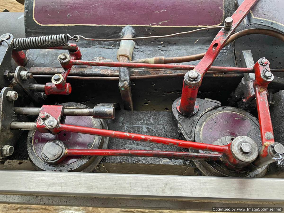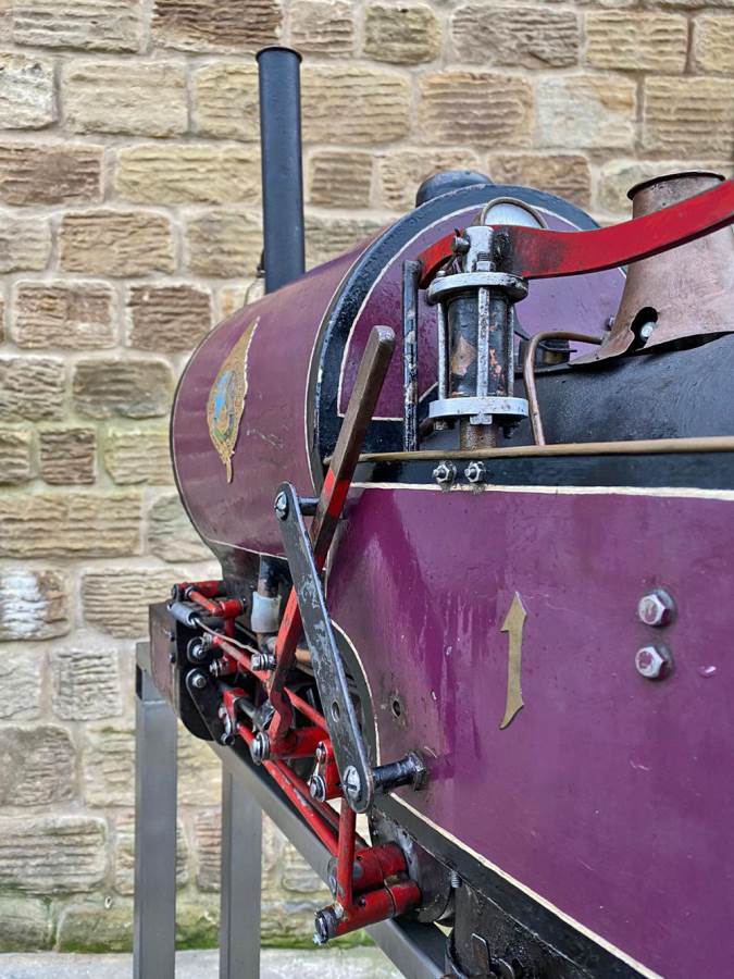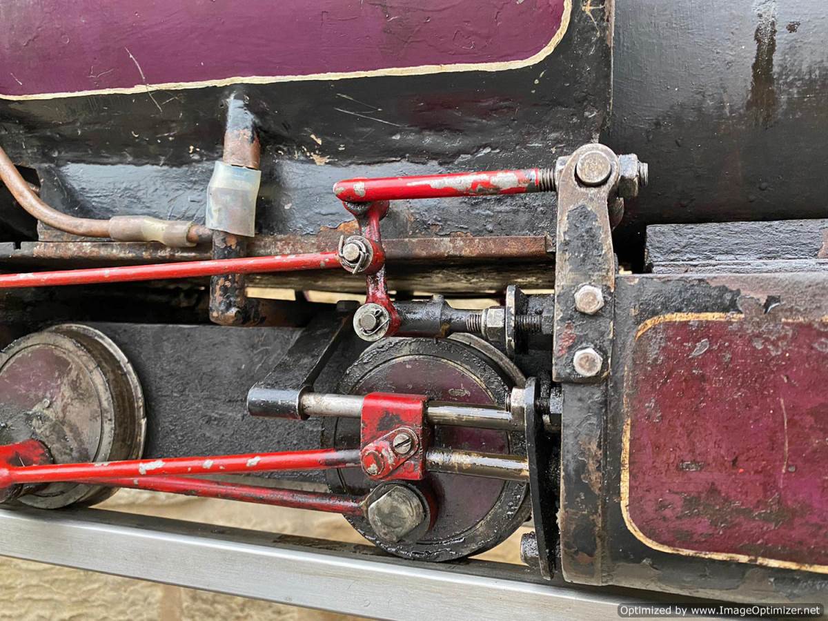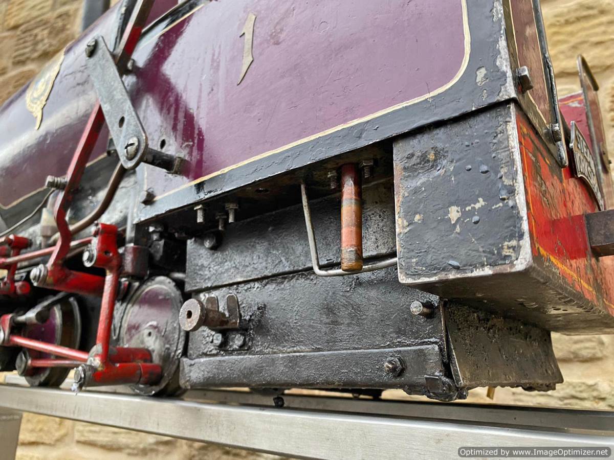 Here we have a slightly off the wall but endearing beast!  A 5" gauge 'Emmet' style 0-4-0 saddle tank.  She's big n heavy too, a good bit bigger than a Sweet Pea, and a heavy two person lift.  All clearly to the builder's somewhat eccentric ideas, the valve gear is essentially Hackworth, but without a return crank.  Instead the motion is directly taken from the rear of the coupling rods and then there is a rocker shaft to reverse the direction of the motion, and judging by the immense levels of mucky oil that the loco arrived at the workshops wearing,.... it worked well enough!  We've included a photo of the loco in happier times and it appears to be running and pulling well.