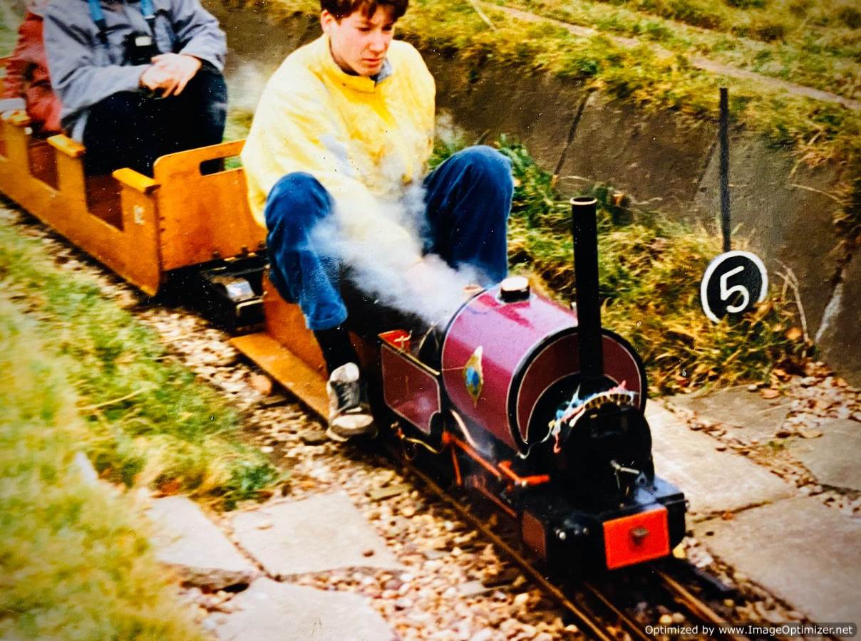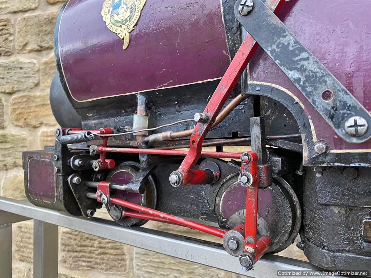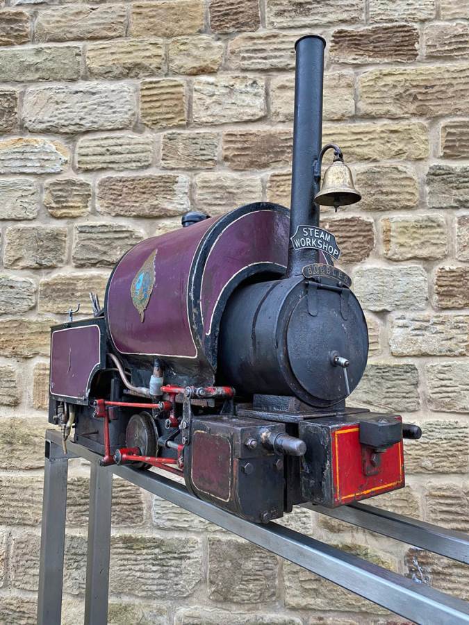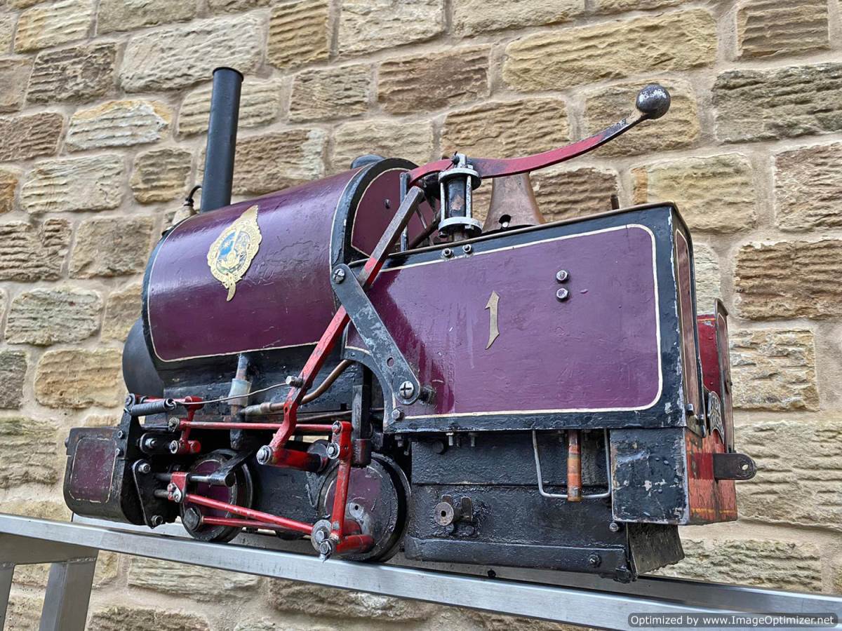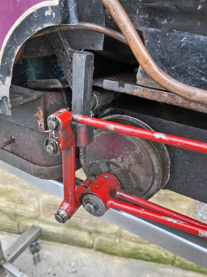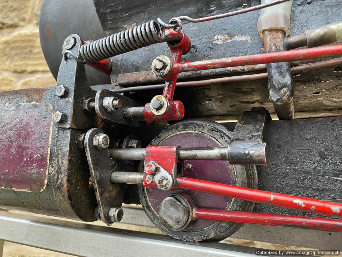 Here we have a slightly off the wall but endearing beast!  A 5" gauge 'Emmet' style 0-4-0 saddle tank.  She's big n heavy too, a good bit bigger than a Sweet Pea, and a heavy two person lift.  All clearly to the builder's somewhat eccentric ideas, the valve gear is essentially Hackworth, but without a return crank.  Instead the motion is directly taken from the rear of the coupling rods and then there is a rocker shaft to reverse the direction of the motion, and judging by the immense levels of mucky oil that the loco arrived at the workshops wearing,.... it worked well enough!  We've included a photo of the loco in happier times and it appears to be running and pulling well.
