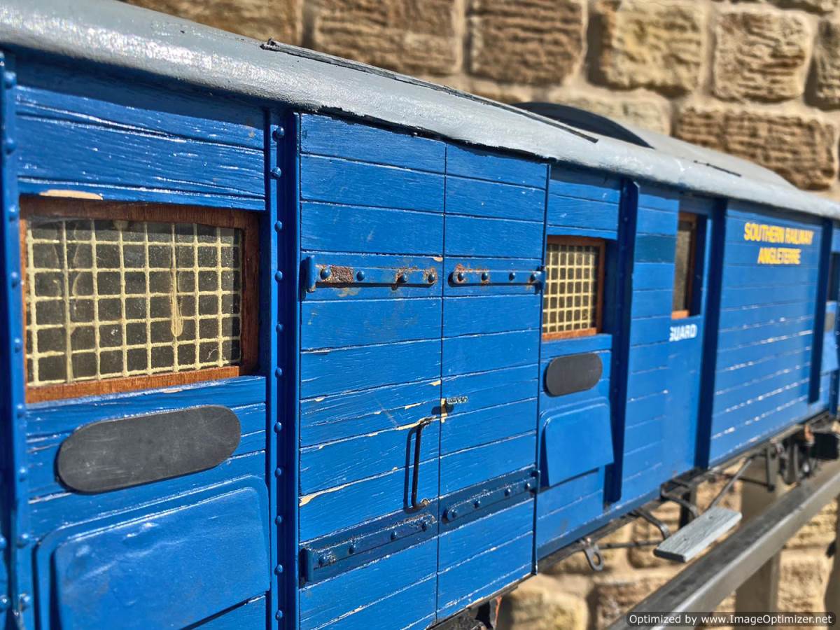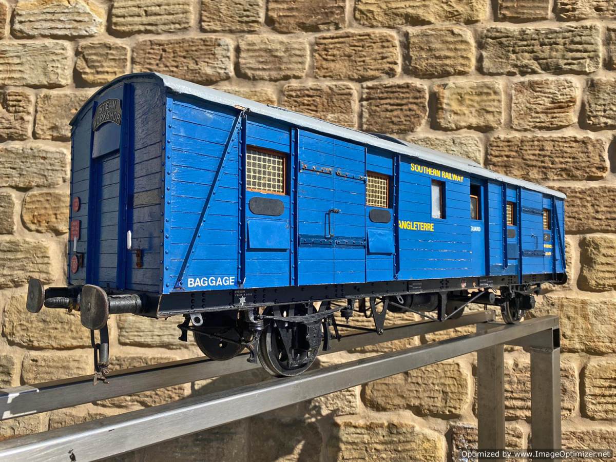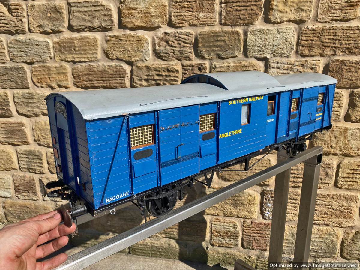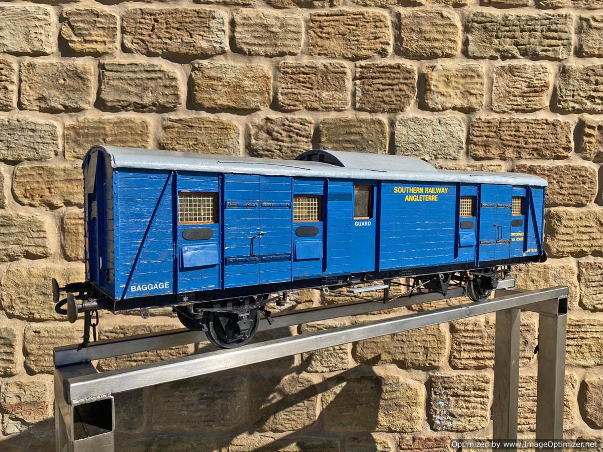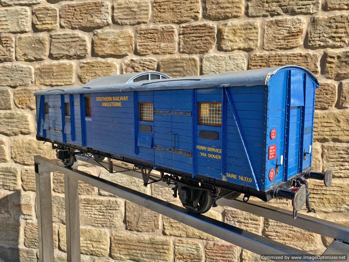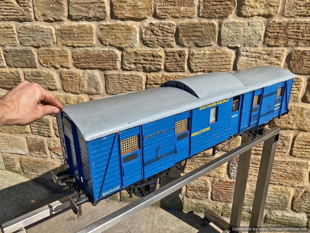 Here we have a very unusual 5" gauge Southern railway continental Wagon Lit London-Paris Guards Van. They were either painted blue or dark green and used on the Golden Arrow services and the Night ferry trains from London to Dover, and a usual train was made up of perhaps six sleeping cars with three or four special luggage vans and one of these special brake vans. It's a really nice model, with loads of scale detailing. Cosmetically it's a little on the scruffy side here n there through use at GL5 running events, and we found that it tended to bob a little on one end, which we remedied with a lump of metal inside to give it a little weight and stability. It's a unique model as far as we are aware.