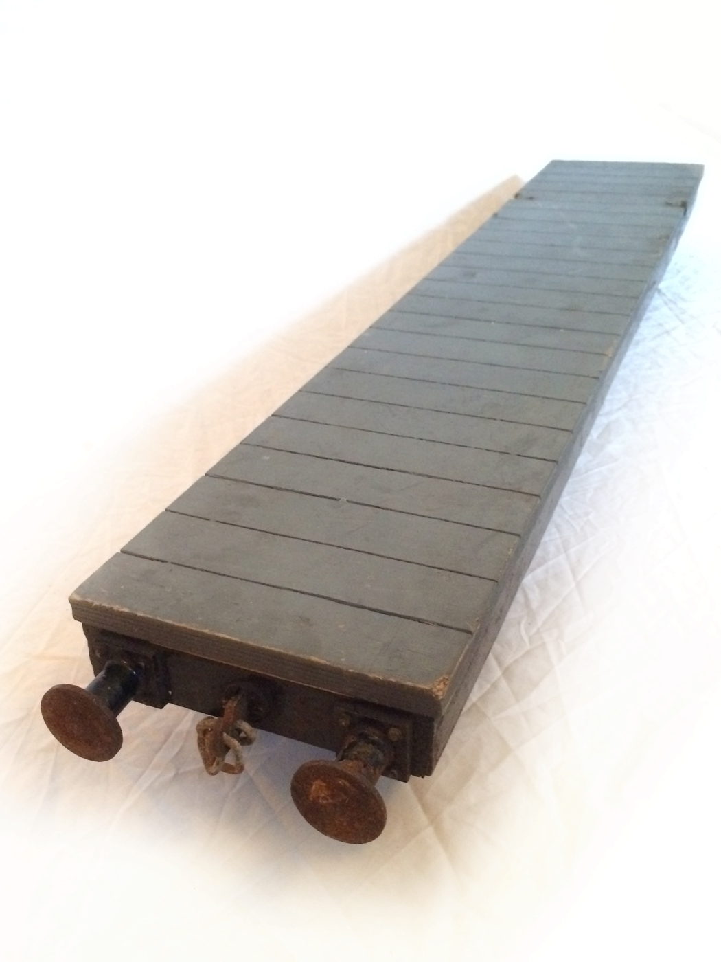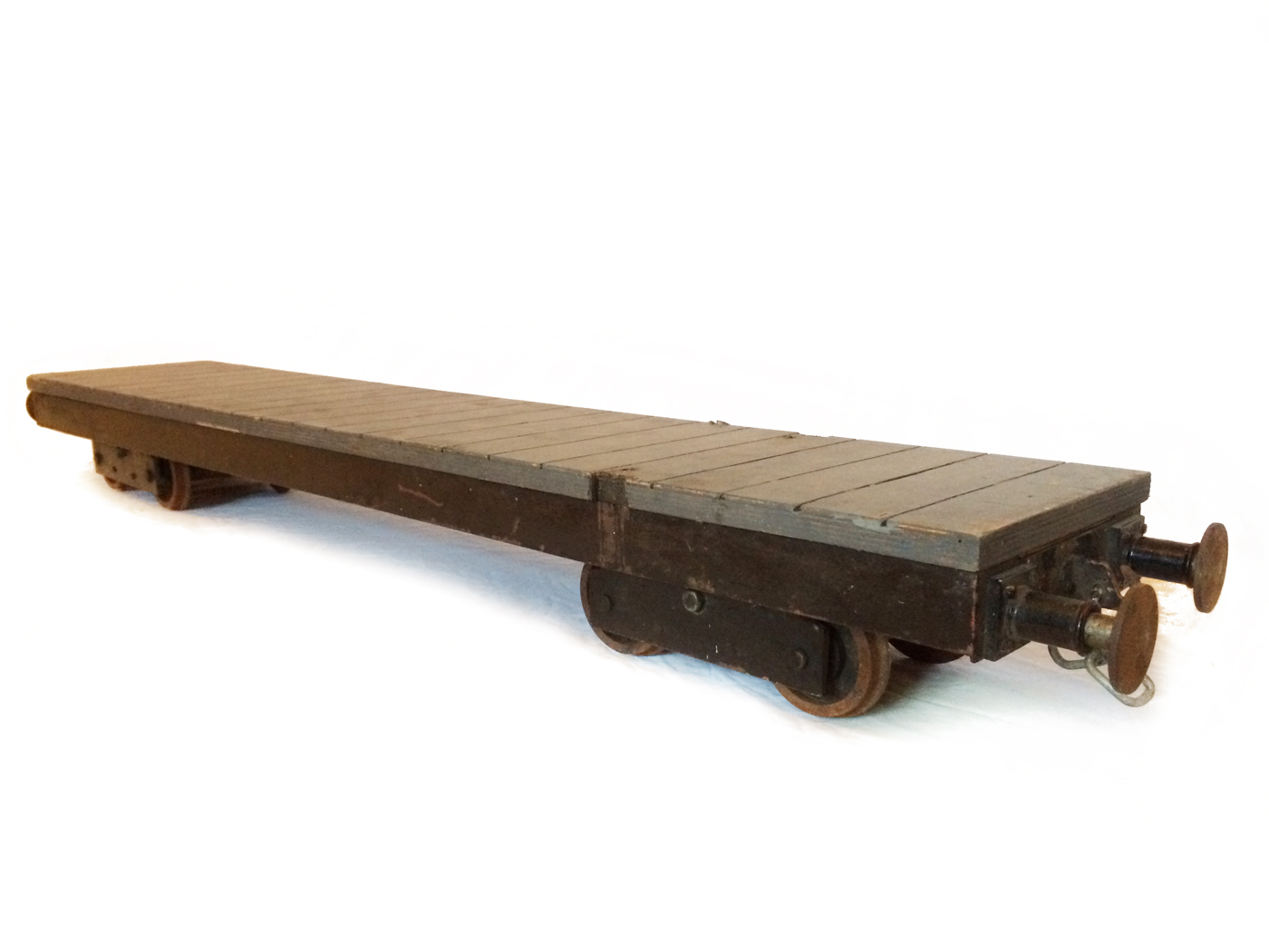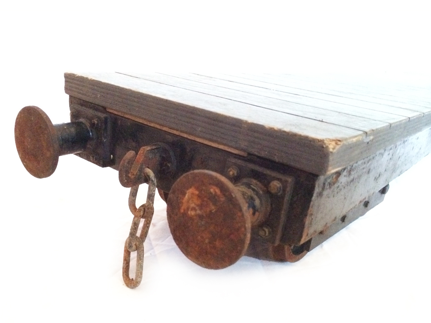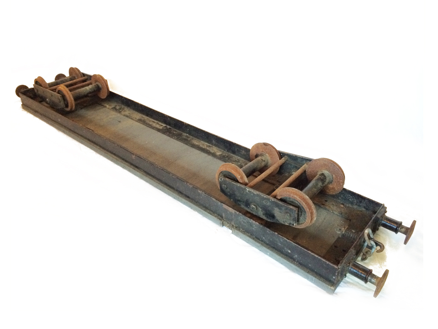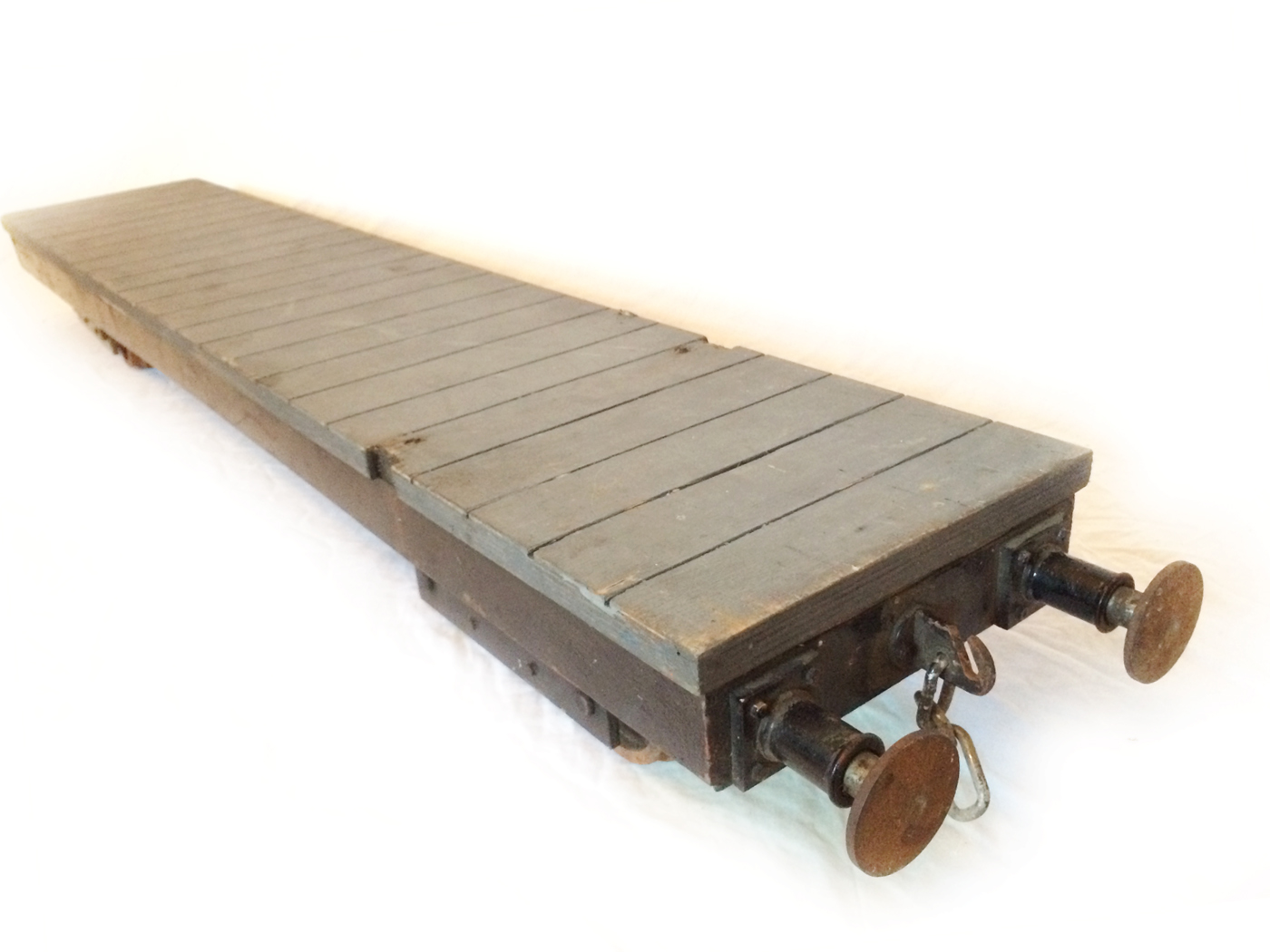 Here we have a simple but solid 5" gauge flat wagon. It's on free rolling and sturdy bogies, and although there's a bit of surface rust on the exposed bits,..... buffer heads and wheels, it's nothing a quick brush with a bit of wire wool won't sort out.