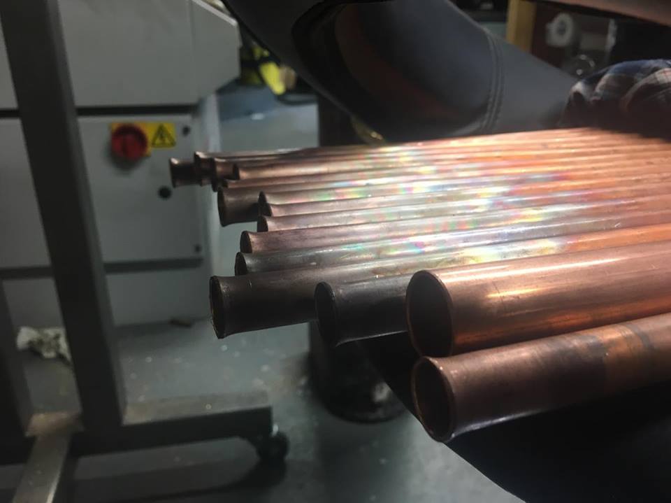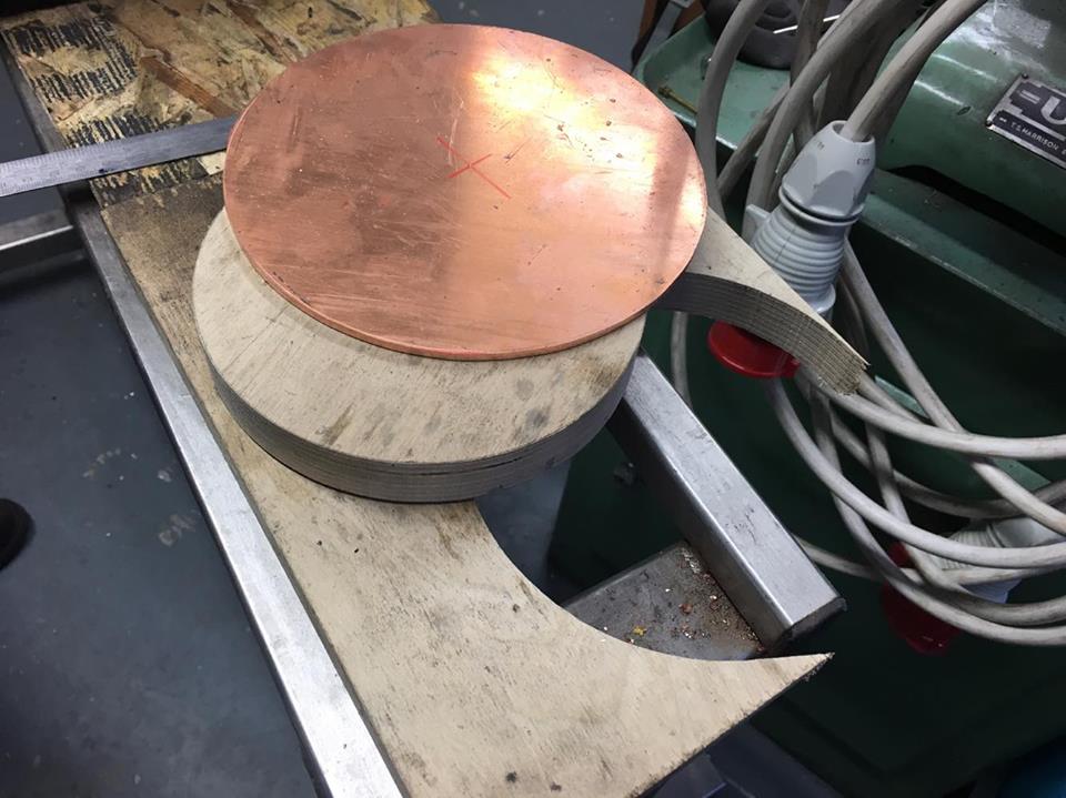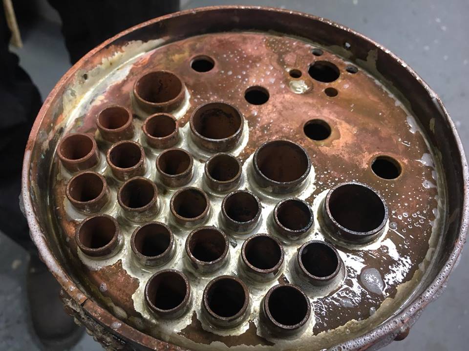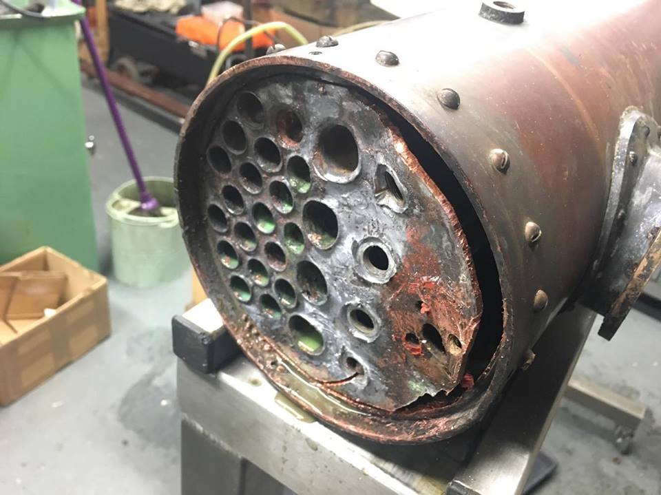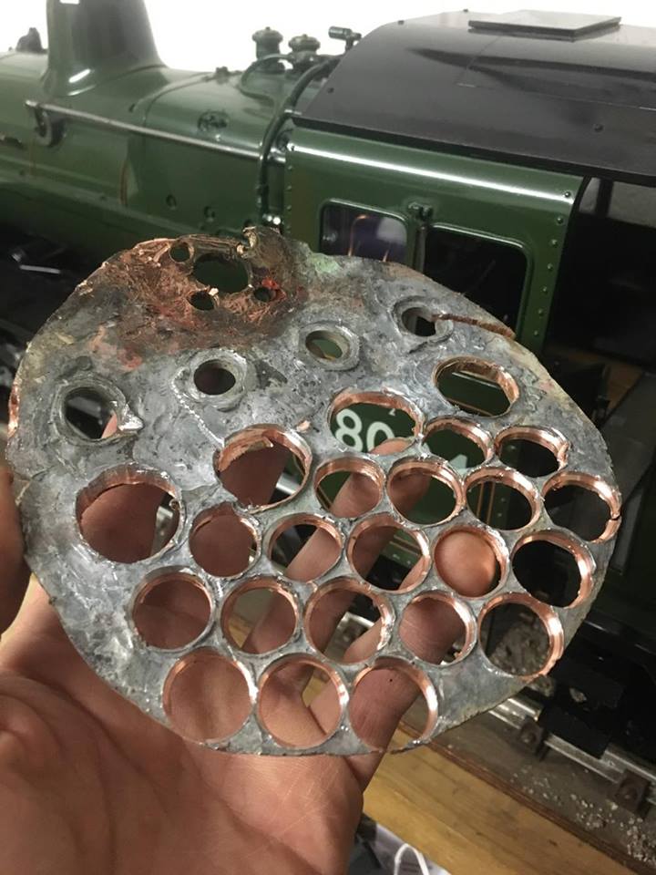 Then we cut and flanged up a new tubeplate (the first photo shows the new tubeplate disk and wooden former). The new tubes were expanded to fit tightly in the firebox end. The whole thing was thoroughly cleaned and then we silver soldered up the lot.