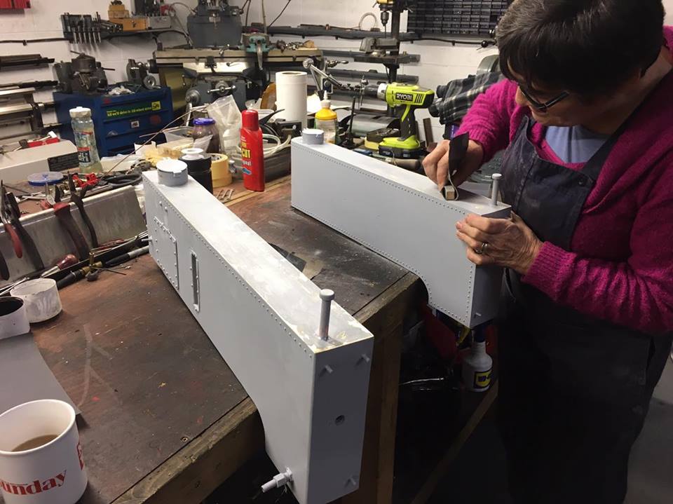 The body was then finished and locally repaired and filled wherever necessary so that a nice finish could be obtained when the paint went on...... this is Jenny, my mum here in the photos, Geoff's daughter working on the tanks.