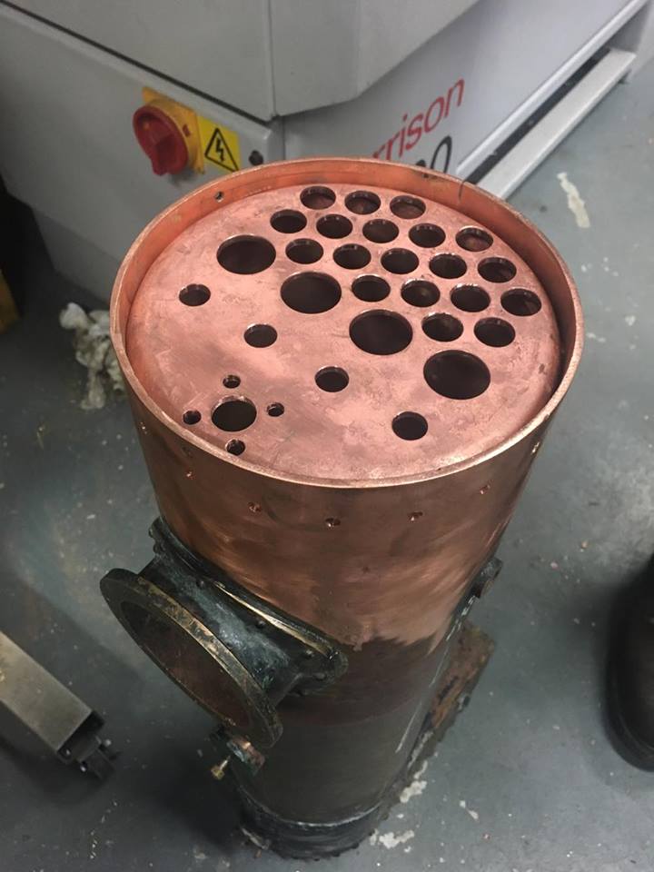 The boiler. This was a pain, as we wanted to keep the model as much of a restoration as possible, rather than a 'new' model. Plus the original boiler was really nicely made, with nice flangeing, riveting and,.... it was certainly substantially built. But,.... when we hydraulically tested it, it proved to weap a little too much for our liking on various tubes in the firebox. After a couple of preliminary attempts to repair the weaps, we took the decision to completely re-tube the boiler, and make a new front tube plate to enable that to happen. The original tubes were burned out, and then the front tubeplate was hacked out,.... the barrel then being skimmed up on the milling machine to create a fresh, clean copper surface for the new tubeplate.