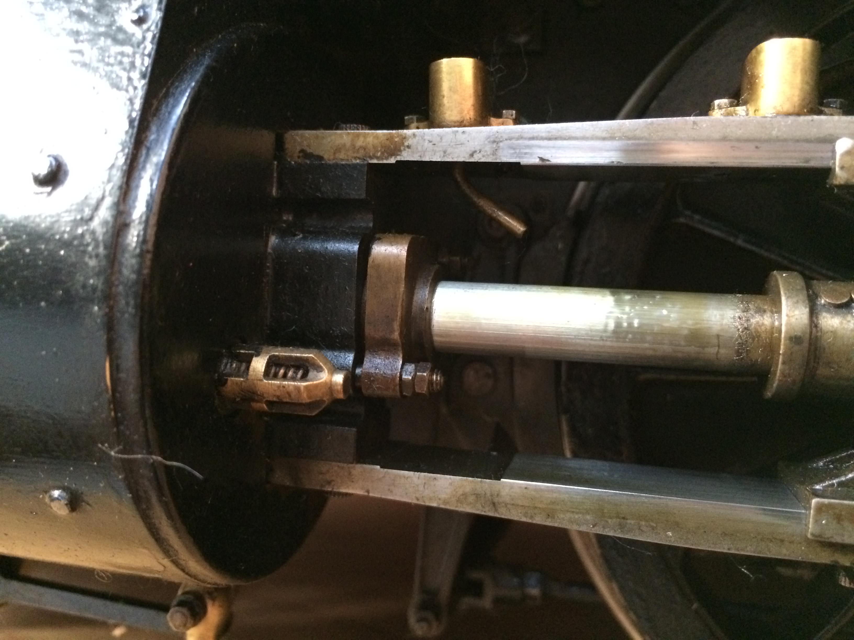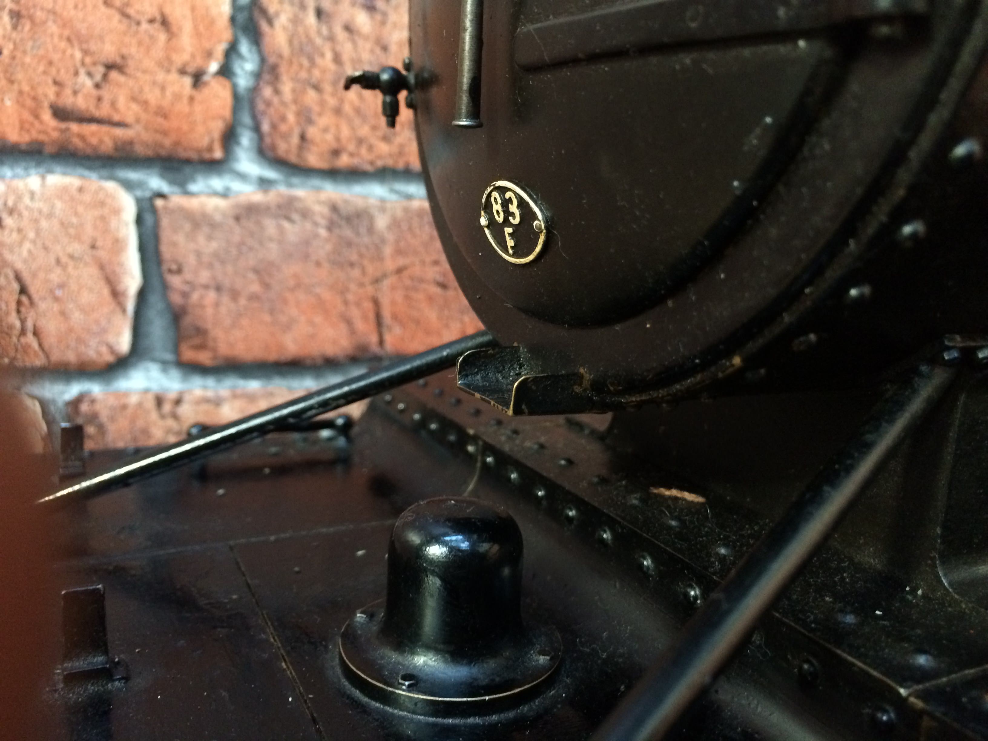 Underneath the nice detail, this is a Martin Evans Firefly, and there was a mild controversy back in the 70's when the model won the cup! Although the level of detail and skill with which the model was built was not in question, for reasons best known to Martin Evans, he drew his Firefly design with the reverser on the wrong side, and neglected to include such details like the characteristic firebox taper you see on Western boilers. The model is a faithful Firefly in these respects, and so, not being technically accurate in these details it was a controversial choice for the cup. That said, it is a very nice model, and a decent cut above the usual Firefly. Built by the late Bill Dean, the rivet detailing to the tanks if first class. All the sanding gear detailing is included, as are other nice prototypical touches translated from the works drawings to make the model a more faithful replication.