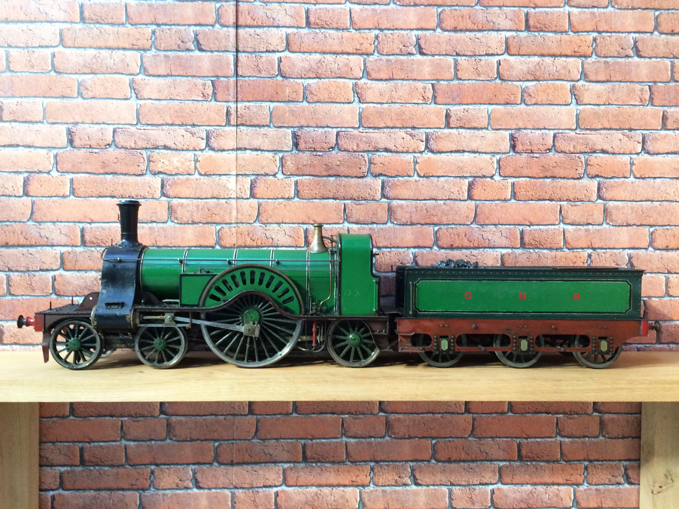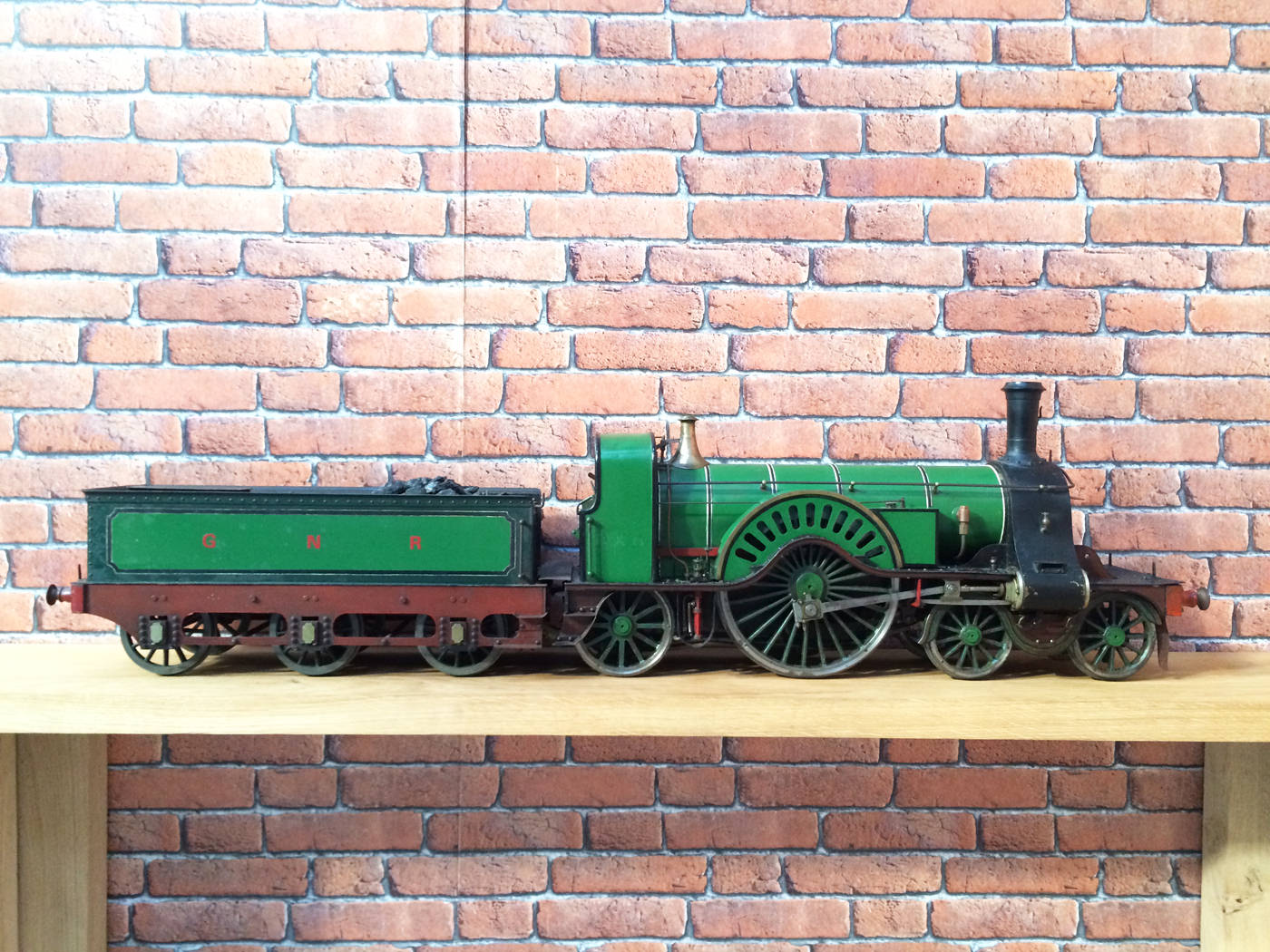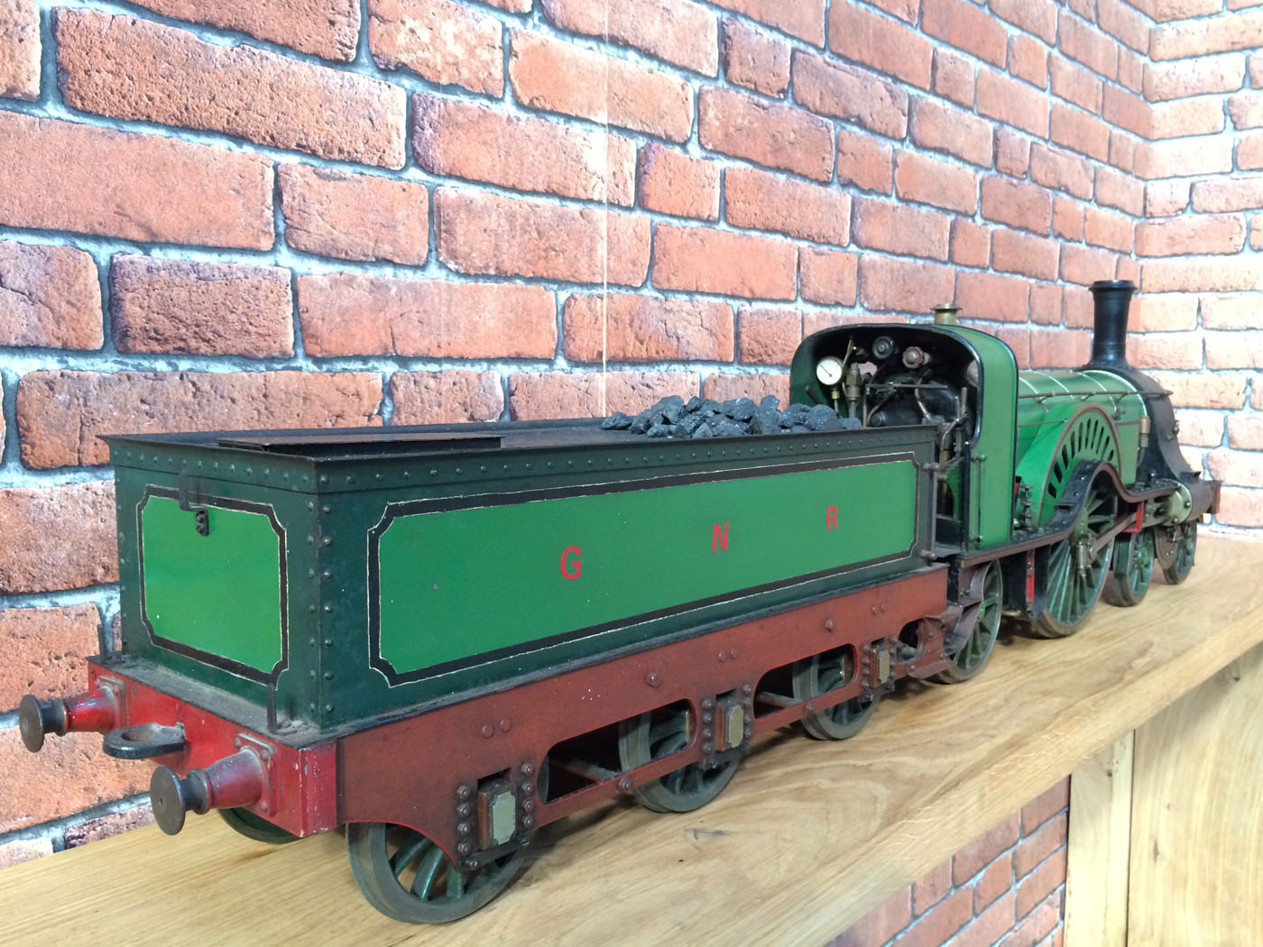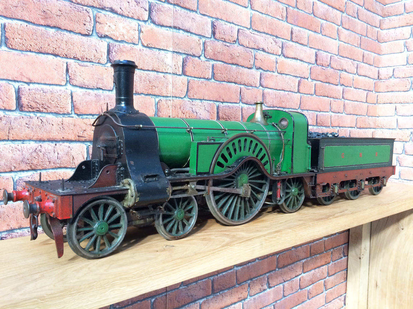 Here we have a rather nicely made and finished 5" GNR Stirling 8' Single. This is a particularly crisply machined locomotive, modeled after the first (and preserved) Stirling Single No. 1. (the only one with 11 splasher holes). It's coupled to the correct 1870 Stirling tender rather than the earlier Sturrock outside framed tender that is so often seen on models, due to the fact that the preserved loco has been paired with it since the 1930s.