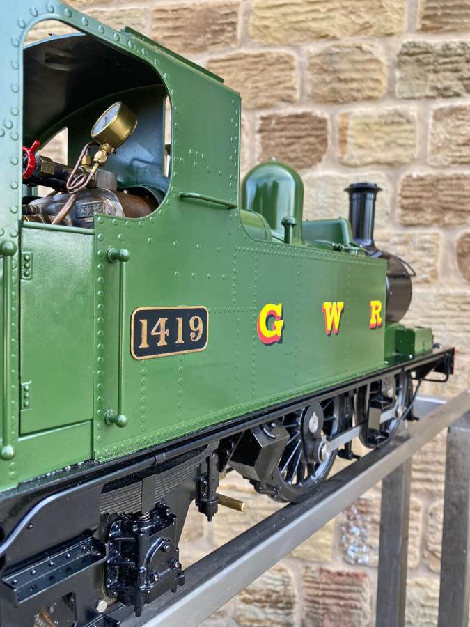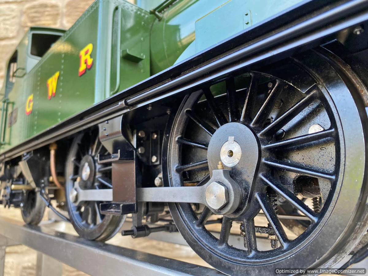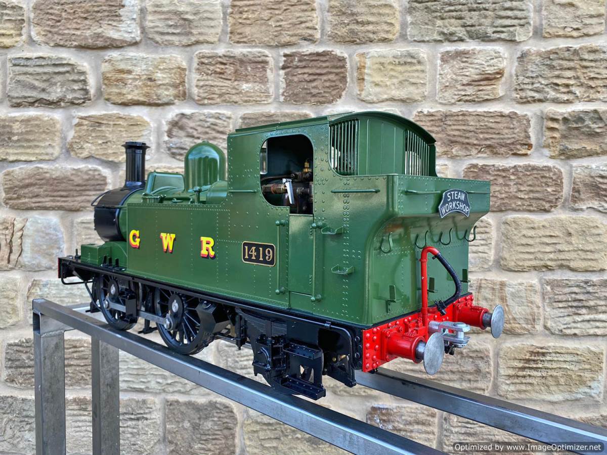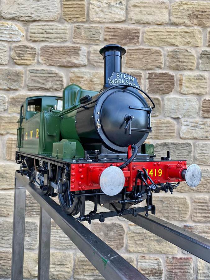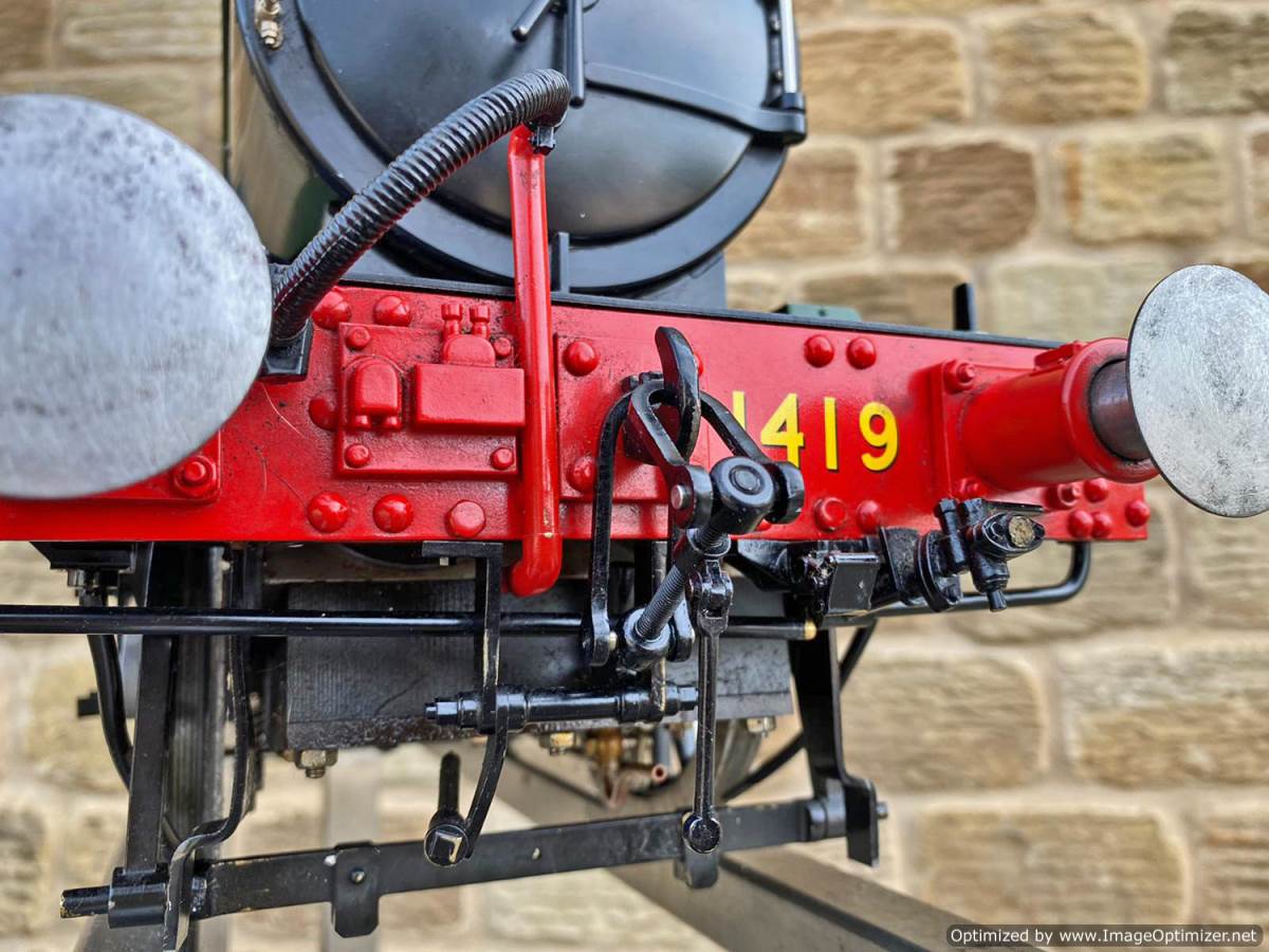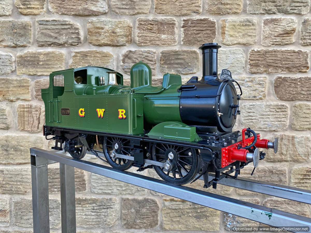 Here we have a pretty much as new 5" gauge GWR 14xx manufactured by Kingscale.  Most of us know the score with the Kingscale models by now, and this one is no exception.  It's a very pretty looking model with loads of nice detailing, the boiler is professionally silver soldered copper and very neatly done.  As you'll see in the soon to be uploaded video everything just works, so you can just get straight out on track and it'll all essentially do what it was designed to do,..... however,.... (and we know you could sense the 'but' coming,.... the machining tolerances, the general fit of the bushes and valve gear, and indeed certain of the material choices on the bottom end are not quite the same as you'd expect from a new model built by a traditional model engineer.