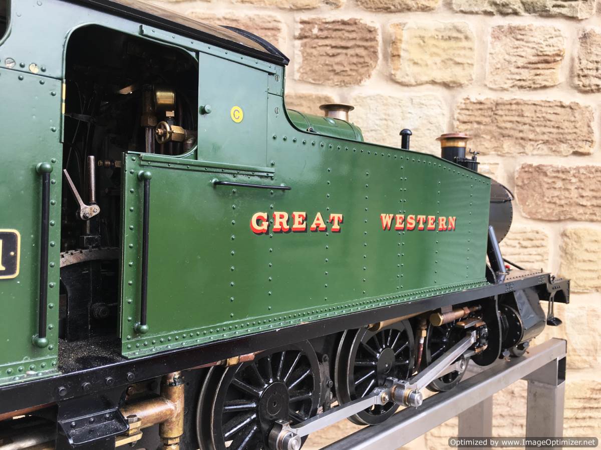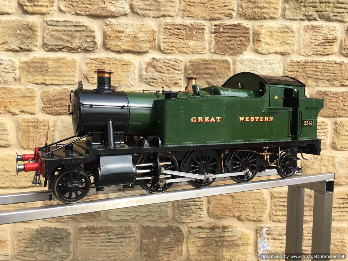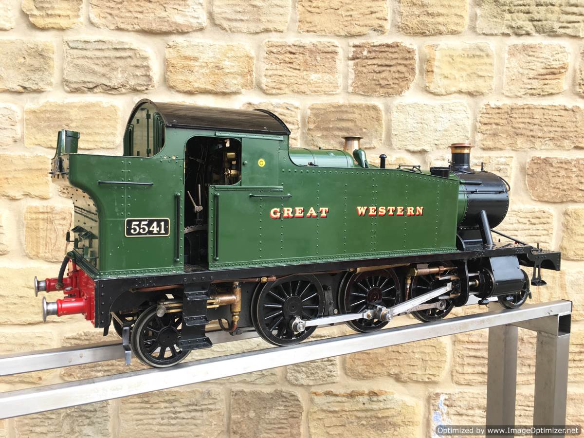 Here we have an exceptionally well made 5" gauge GWR 55xx Prarie tank, '5541'. Built to the Martin Evans 'Firefly' design, but done with a huge amount of attention to prototypical detail and finesse. The rivet detailing, panel split lines, bunker flanging and general model engineering skill is superb, and the overall result is one of the nicest looking 'Fireflies' that we've seen. The footplate and backhead is built to run rather than for show, but the builder has gone to extra lengths to nudge the model toward the real thing by swapping over the reverser to the correct prototypical side for a Prarie, rather than sticking to the published design.